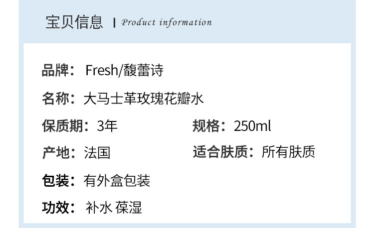 【YZ】Fresh馥蕾诗玫瑰花瓣保湿爽肤水250ML补水舒缓润泽柔肤水