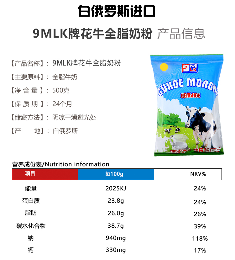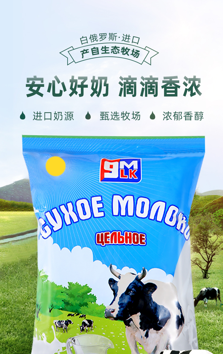 【中欧班列精选】白俄罗斯9m全脂/脱脂无蔗糖奶粉 500g/袋