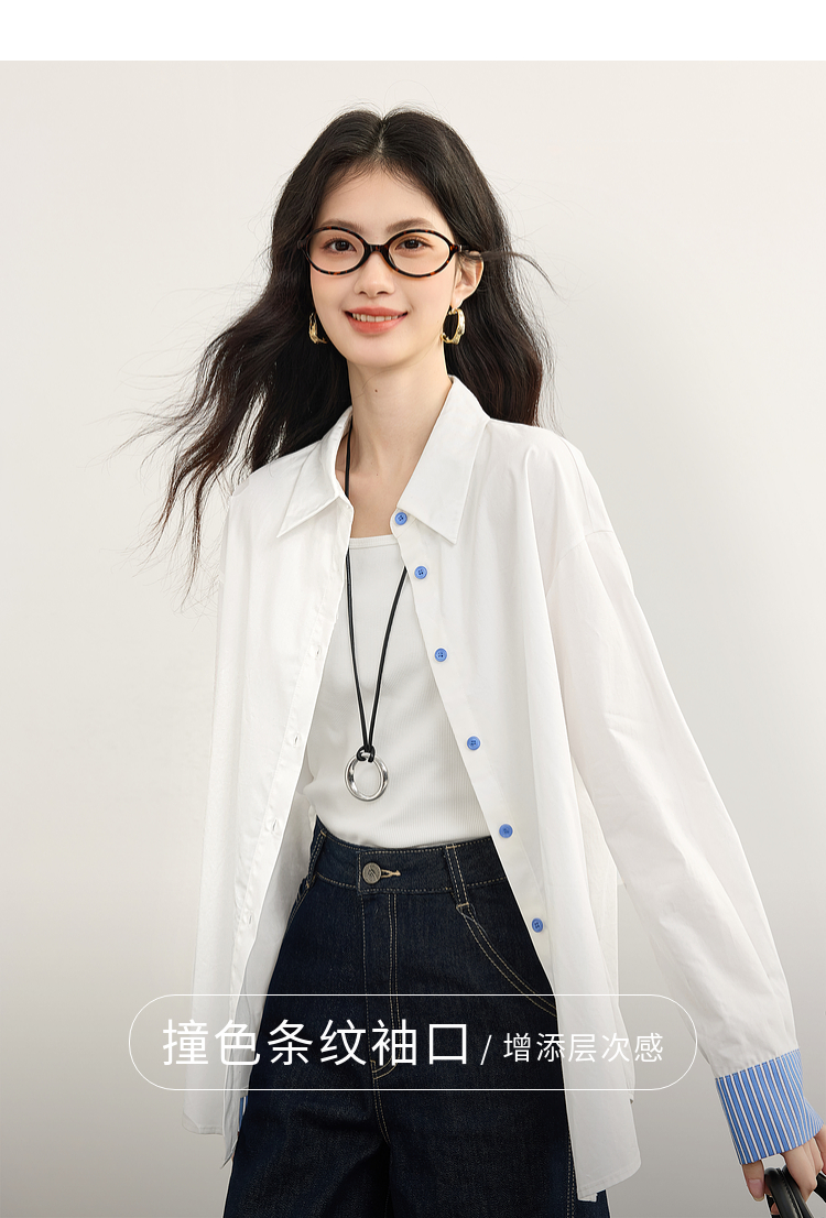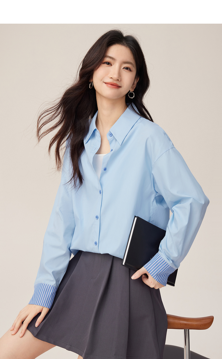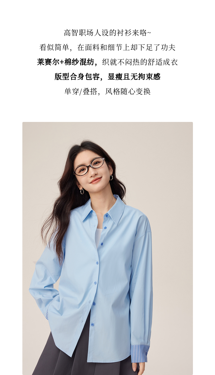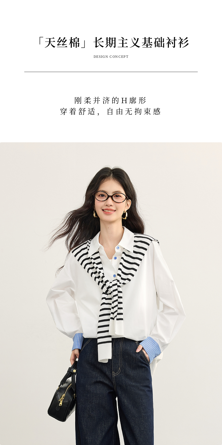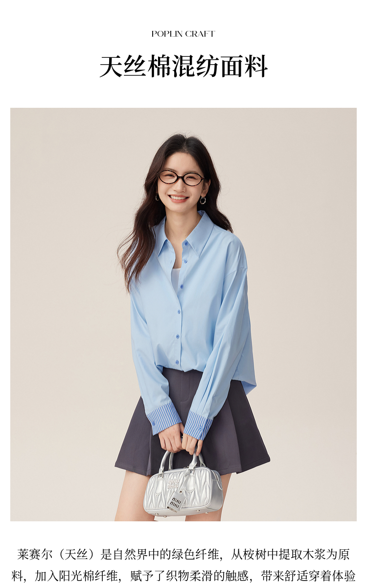 【周末秒杀】熙世界miu系天丝棉长袖衬衫女2025秋季新款条纹翻袖气质宽松衬衣