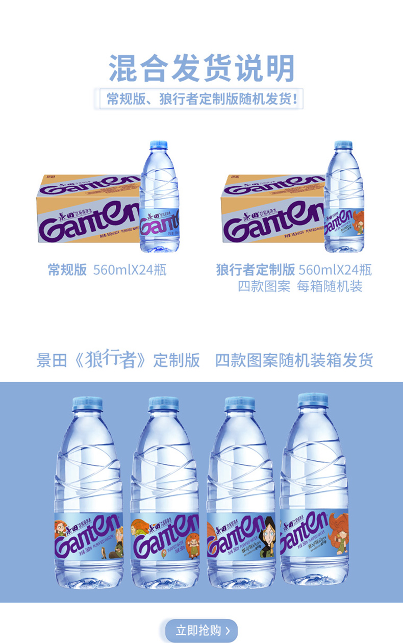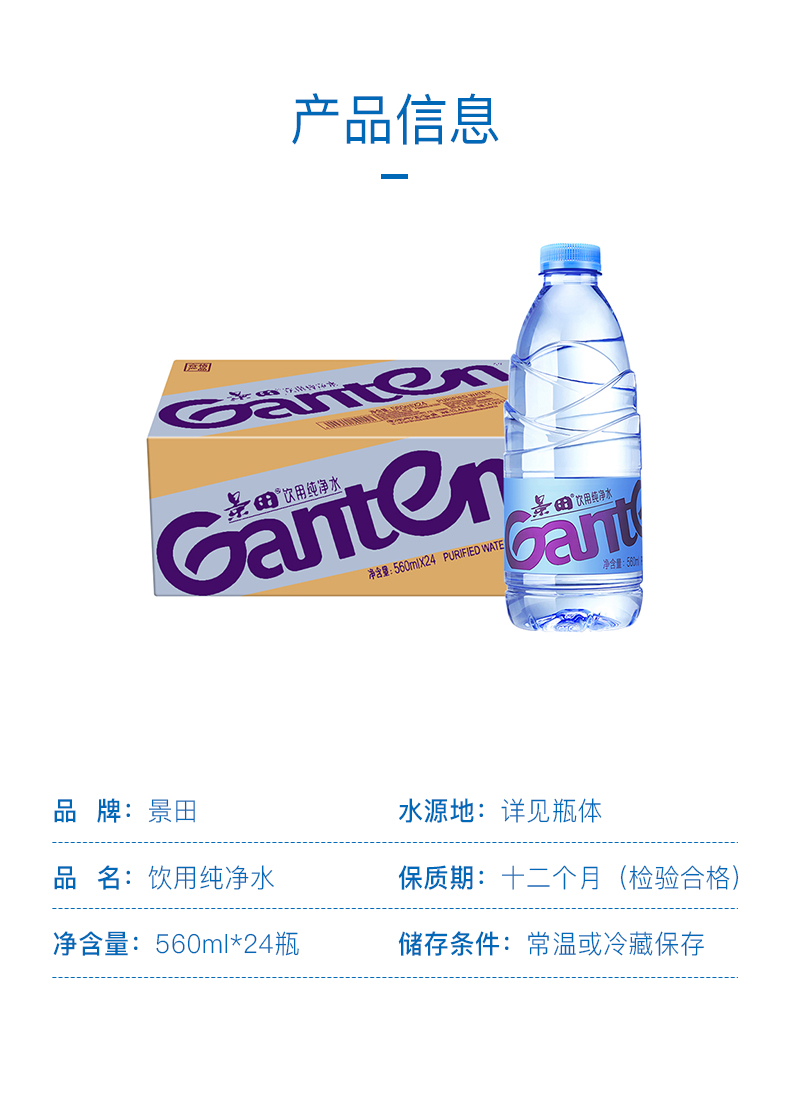 景田 饮用纯净水 560ml*24瓶 整箱装 会议办公用水 家庭健康饮用水