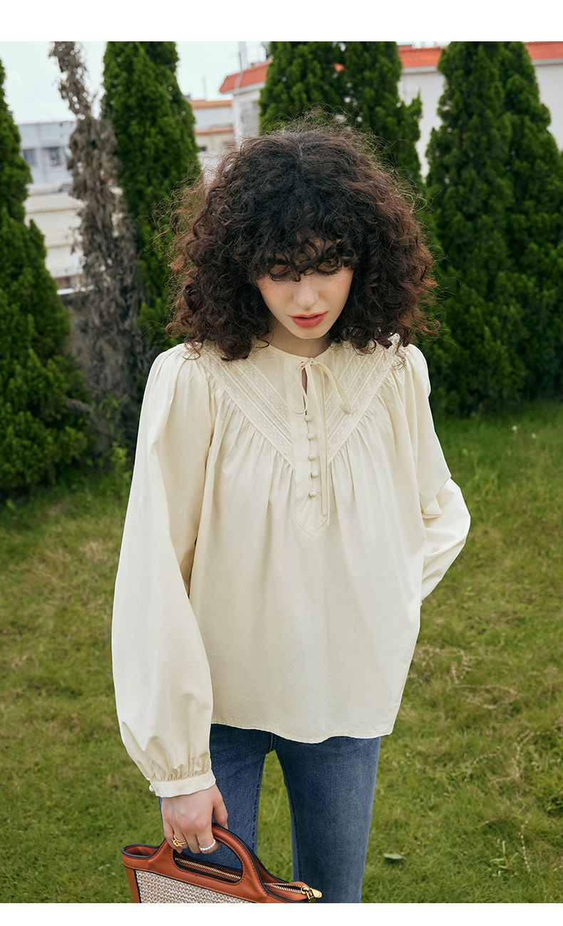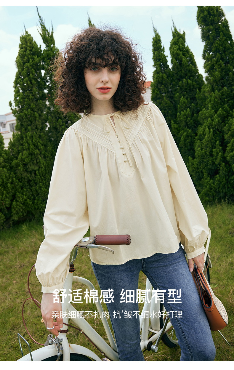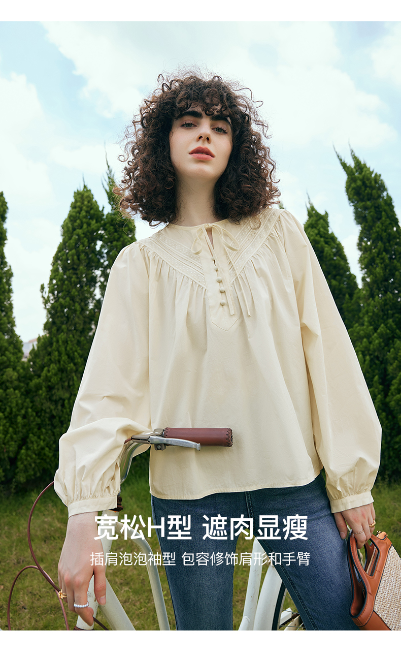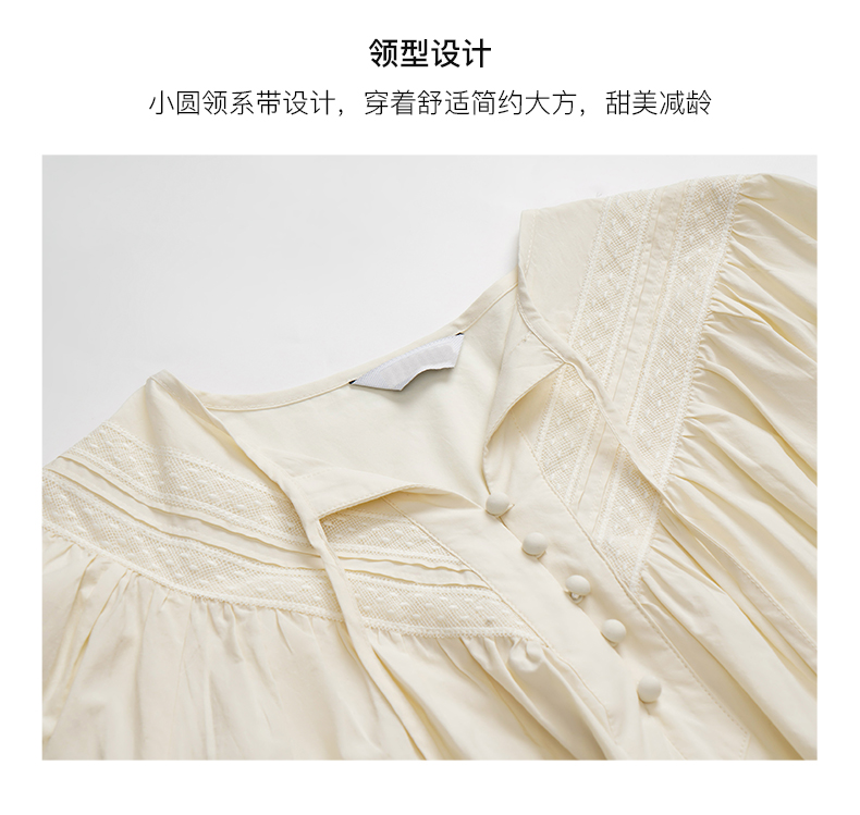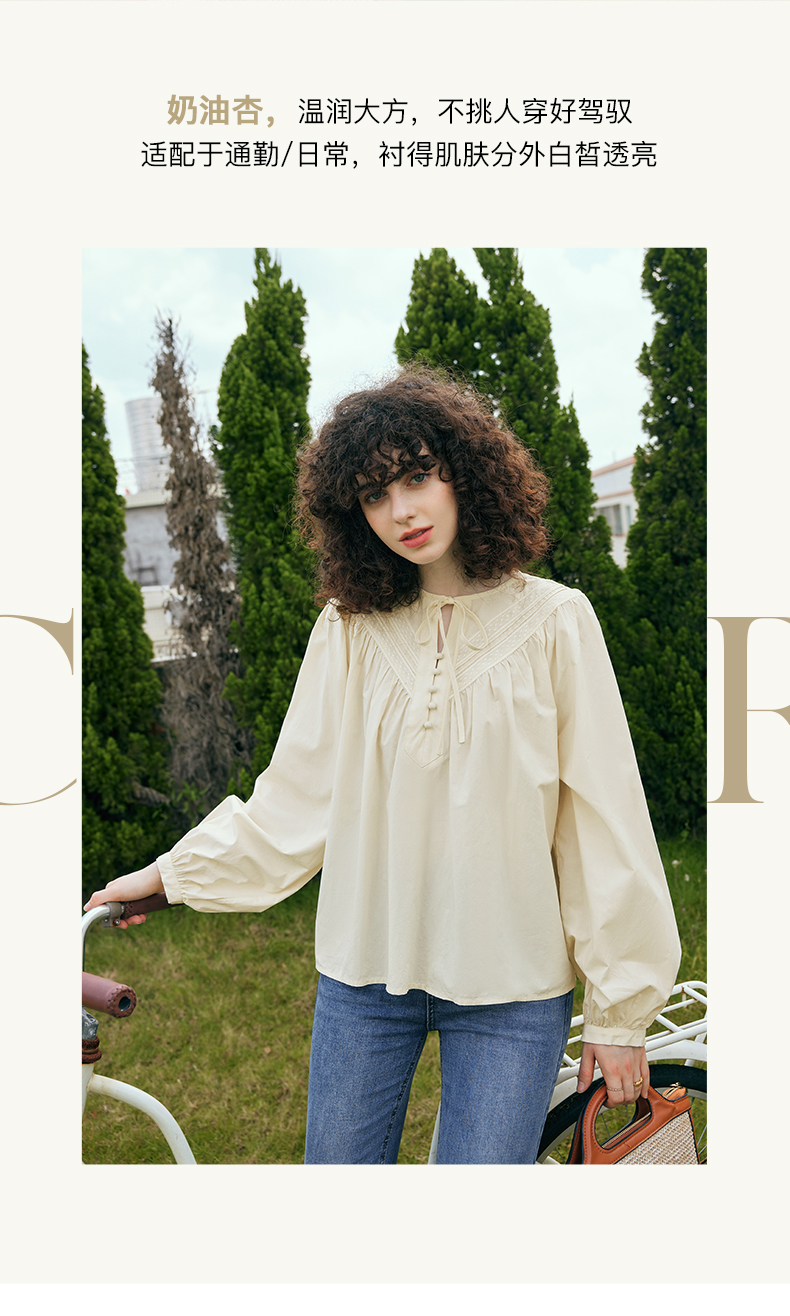 OLrain欧芮儿奶油杏蕾丝雪纺衫女初秋2023年新款宽松法式系带小衫