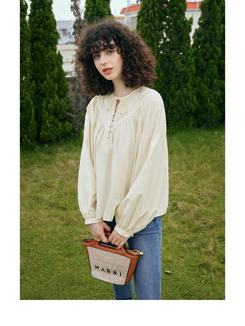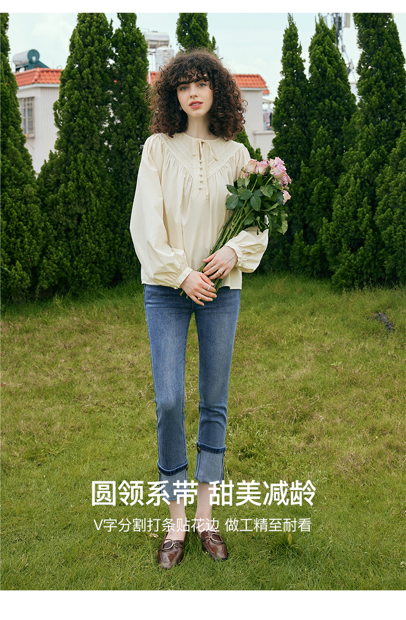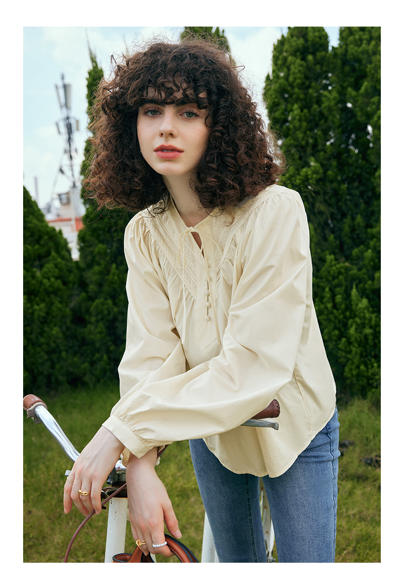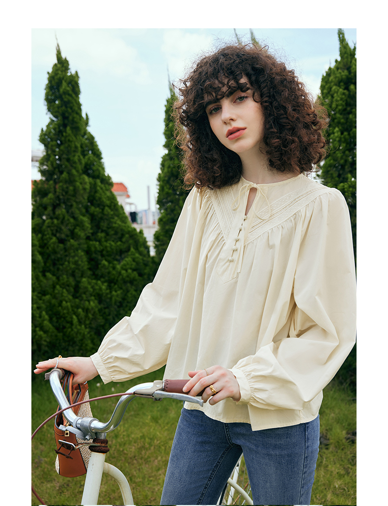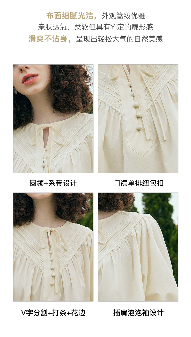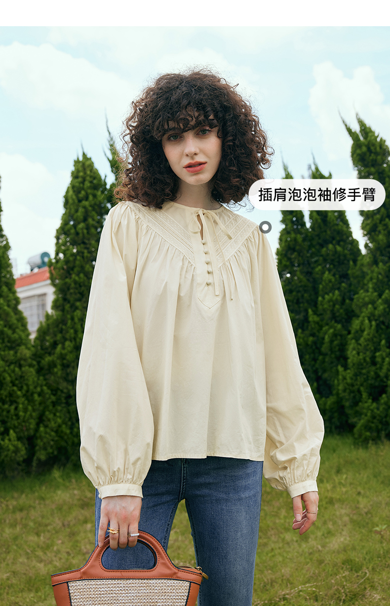 OLrain欧芮儿奶油杏蕾丝雪纺衫女初秋2023年新款宽松法式系带小衫