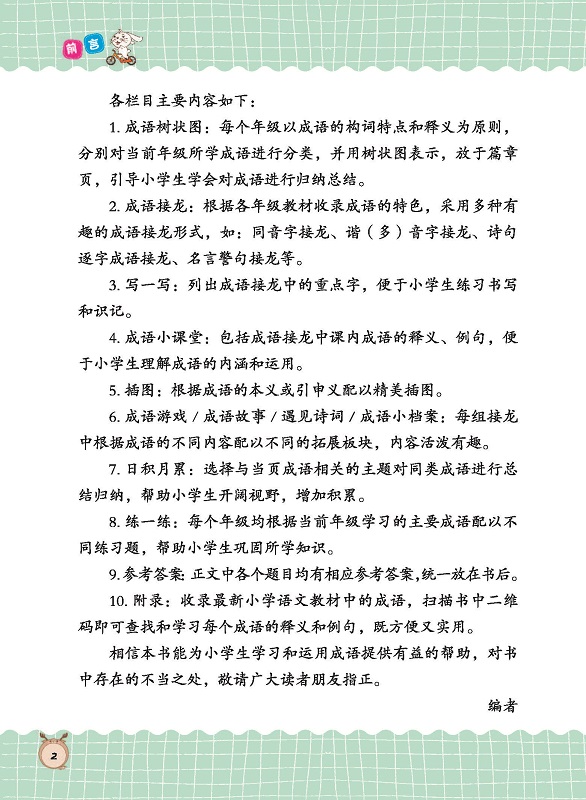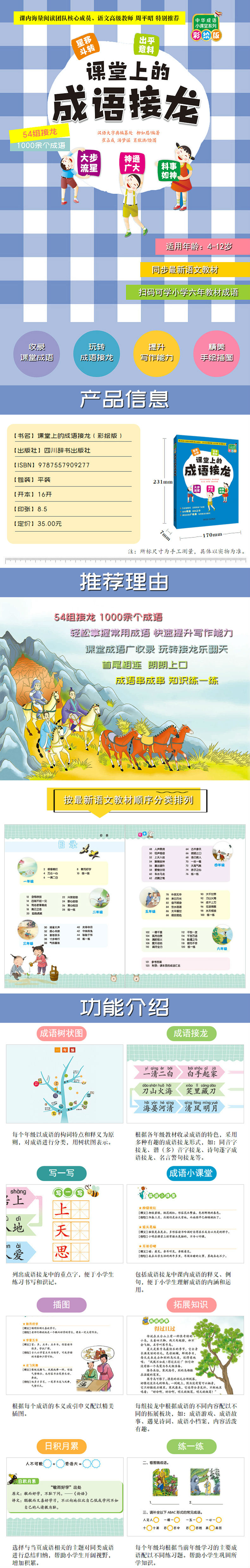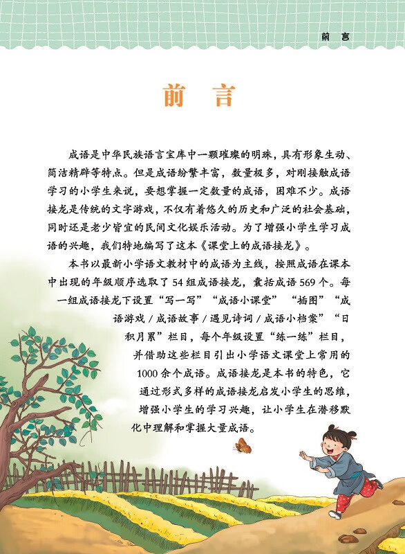 本书以小学语文教材中的成语为主线,按照成语在课本中出现的年级顺序选取了54组成语接龙,囊括成语569个。每一组成语接龙下设置“写一写”“成语小课堂” “插图”“成语游戏/成语故事/遇见诗词/成语小档案”“日积月累”栏目,每个年级设置“练一练”栏目,并借助这些栏目引出小学语文课堂上常用的1000余个成语。成语接龙是本书的特色,它通过形式多样的成语接龙启发小学生的思维,增强小学生的学习兴趣,让小学生在潜移默化中理解和掌握大量成语。