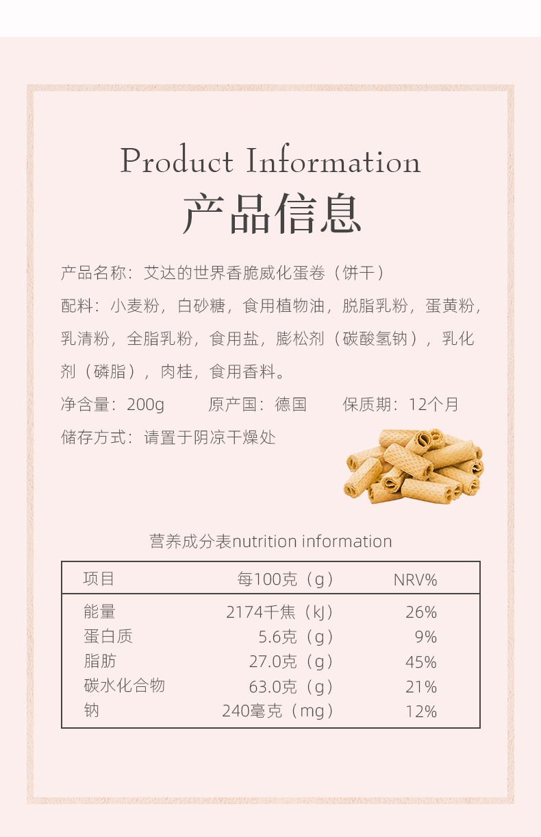 艾达的世界香脆威化蛋卷200g/052672 空心小圆柱自然松脆