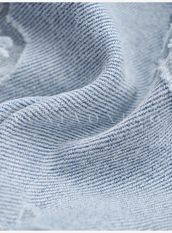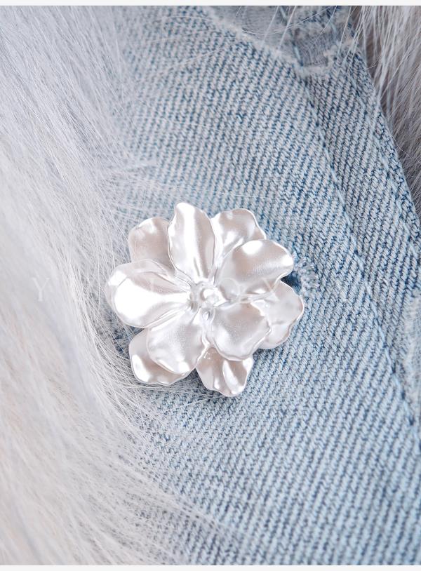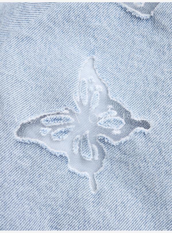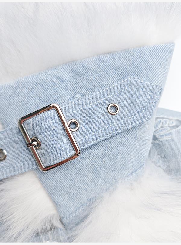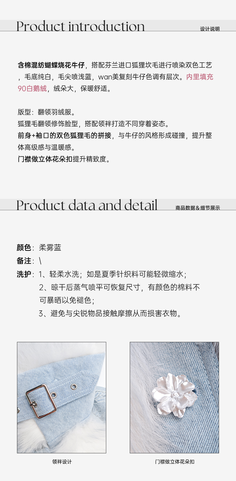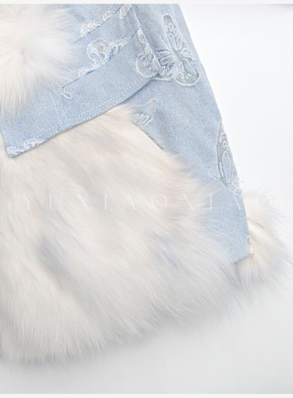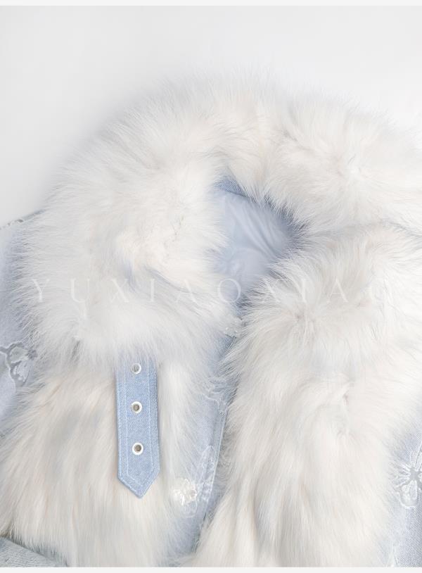 余潇潇【冰蓝蝶梦】轻奢芬兰狐狸毛拼接蝴蝶烧花牛仔翻领鹅绒羽绒服