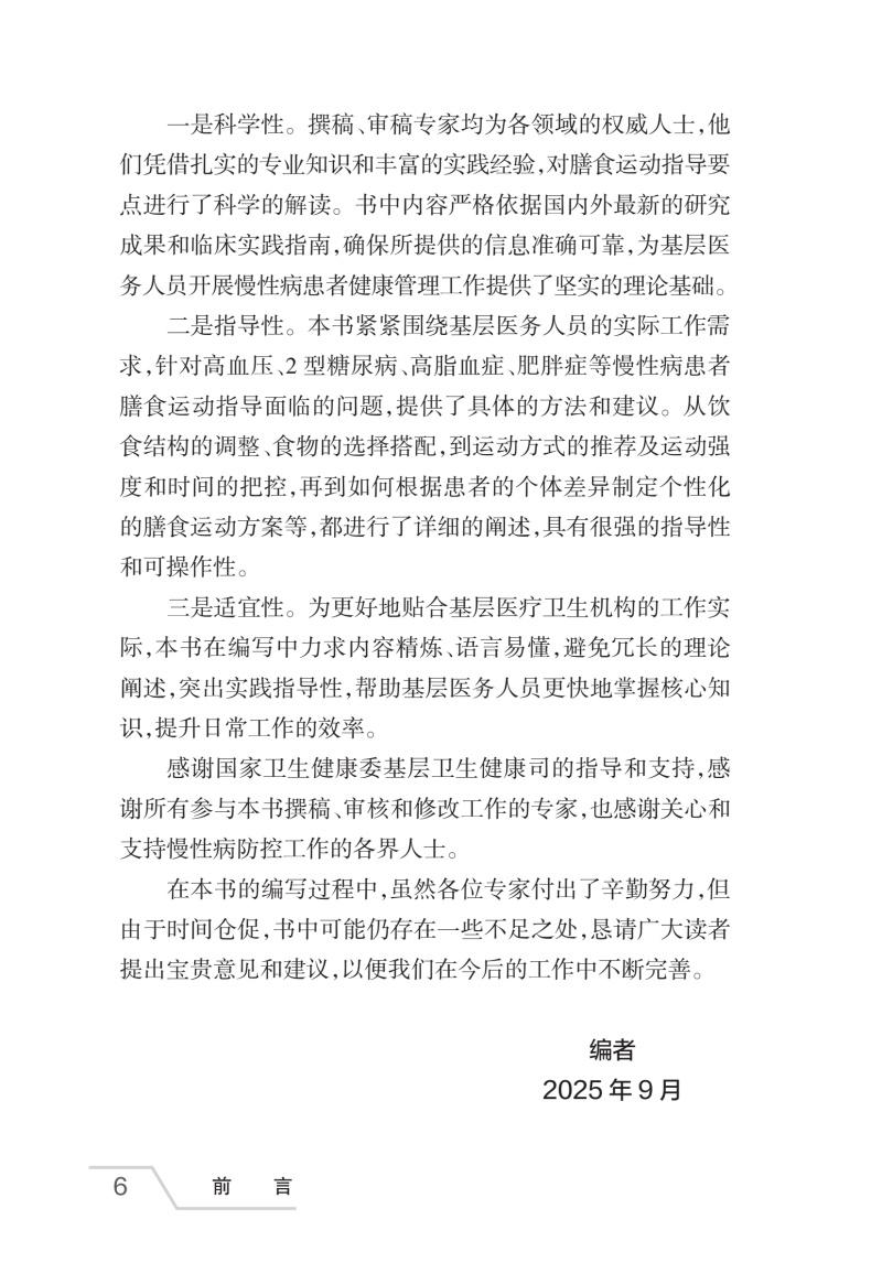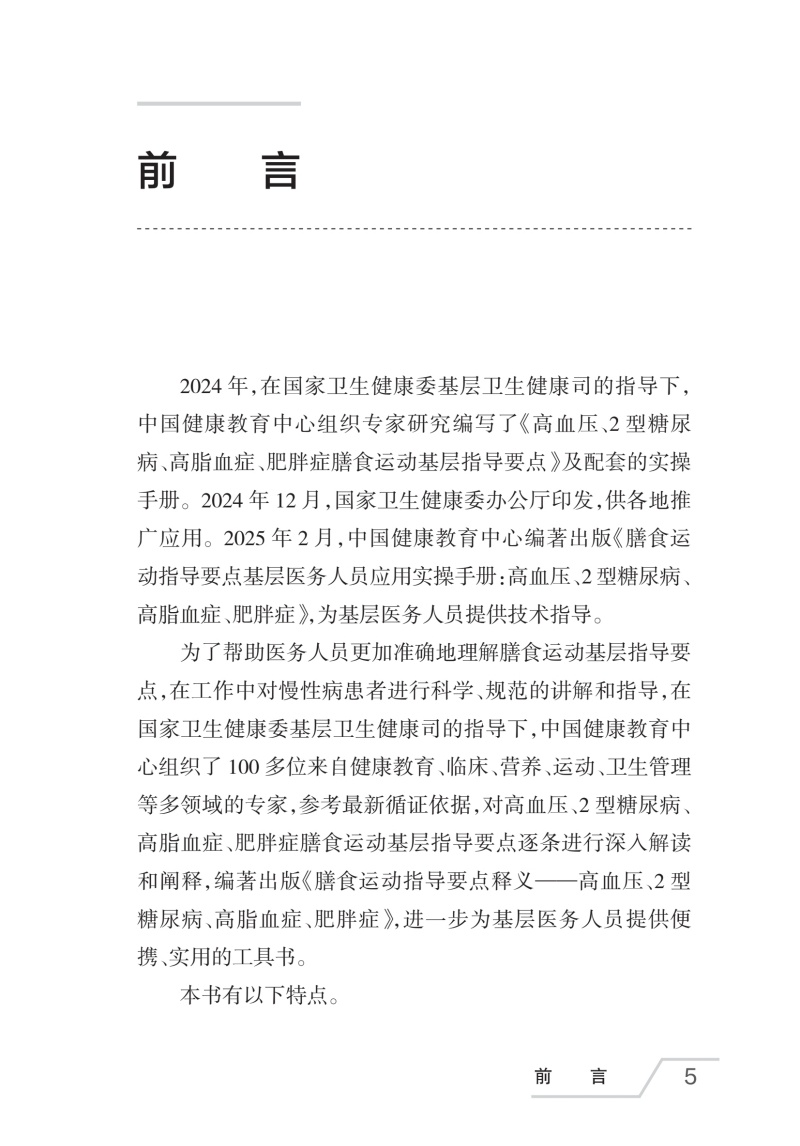 全书对高血压、2型糖尿病、高脂血症、肥胖症等重点疾病的膳食运动基层指导要点的膳食指导建议、运动指导建议进行逐条释义和解读。开发过程严格遵循健康科普材料科学规范的开发流程,确保科学性、规范性、实用性。科学规范,简单明了,为基层医务人员规范使用膳食运动指导要点、开始膳食运动方面的健康科普工作提供方便实用的参考工具。基于基层医务人员开展慢性病患者个体化健康教育、膳食指导和运动指导的需求,方便医务人员在实际工作中参考应用。