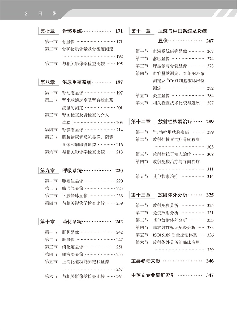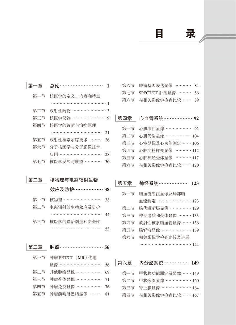 目录 第一章 总论 1 第一节 核医学的定义、内容和特点 1 第二节 放射性药物 3 第三节 核医学仪器 9 第四节 核医学的诊断与治疗原理 21 第五节 放射性核素示踪技术 26 第六节 分子核医学与分子影像技术应用 28 第七节 核医学发展与展望 30 第二章 核物理与电离辐射生物效应及防护 38 第一节 核物理 38 第二节 电离辐射的生物效应及防护 44 第三节 核医学的诊治剂量和安全性 53 第三章 肿瘤 56 第一节 肿瘤 PET/CT(MR)代谢显像 56 第二节 其他肿瘤显像 69 第三节 肿瘤受体显像 71 第四节 肿瘤免疫显像 76 第五节 肿瘤前哨淋巴结显像 81 第六节 肿瘤基因表达显像 84 第七节 SPECT/CT 肿瘤显像 86 第八节 与相关影像学检查比较 89 第四章 心血管系统 92 第一节 心肌灌注显像 92 第二节 心肌代谢显像 104 第三节 心室显像及心功能测定 106 第四节 心脏淀粉样变显像 112 第五节 心脏神经受体显像 117 第六节 与相关影像学检查比较 120 第五章 神经系统 123 第一节 脑血流灌注显像及局部脑血流测定 123 第二节 脑代谢断层显像 129 第三节 神经递质和受体显像 133 第四节 放射性核素脑血管显像 136 第五节 脑脊液显像 139 第六节 相关影像学检查比较及进展 144 第六章 内分泌系统 149 第一节 甲状腺功能测定及显像 149 第二节 甲状旁腺显像 160 第三节 肾上腺显像 164 第四节 与相关影像学检查比较 167 第七章 骨骼系统 171 第一节 骨显像 171 第二节 骨矿物质含量及骨密度测定 192 第三节 与相关影像学检查比较 195 第八章 泌尿生殖系统 197 第一节 肾动态显像 197 第二节 肾小球滤过率及肾有效血浆流量的测定 201 第三节 肾图检查及肾检查的介入试验 203 第四节 肾静态显像 214 第五节 膀胱输尿管反流显像、阴囊显像和输卵管显像 216 第六节 与相关影像学检查比较 218 第九章 呼吸系统 220 第一节 肺灌注显像 220 第二节 肺通气显像 225 第三节 下肢静脉显像 236 第四节 与相关影像学检查比较 239 第十章 消化系统 242 第一节 肝胆显像 242 第二节 肝显像 247 第三节 消化道显像 251 第四节 唾液腺显像 255 第五节 上消化道功能测定和显像 257 第六节 与相关影像学检查比较 264 第十一章 血液与淋巴系统及炎症显像 267 第一节 血液系统疾病显像 267 第二节 淋巴显像 274 第三节 脾显像与骨髓显像 278 第四节 血容量的测定、红细胞寿命测定及 51Cr 红细胞破坏部位测定 282 第五节 炎症显像 284 第六节 相关检查技术比较与进展 287 第十二章 放射性核素治疗 289 第一节 131I 治疗甲状腺疾病 289 第二节 放射性核素治疗骨转移瘤 303 第三节 放射性粒子植入治疗 308 第四节 放射免疫治疗与导向治疗 311 第五节 其他核素治疗 314 第十三章 放射体外分析 325 第一节 放射免疫分析 325 第二节 免疫放射分析 331 第三节 其他放射体外分析 333 第四节 非放射性标记免疫分析 335 第五节 ISO15189 质量控制体系 336 第六节 放射体外分析的临床应用 339 主要参考文献 346 中英文专业词汇索引 347