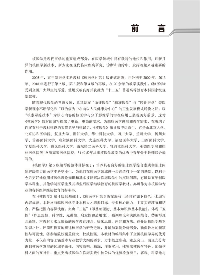 本教材在编写上具有如下特色:①编写内容规范。本教材与临床医学专业本科人才培养目标、专业核心能力、主要实践环节相结合,严格把握内容深浅度,突出“三基”(即基础理论、基本知识和基本技能),体现“五性”(即思想性、科学性、先进性、启发性和适用性),强调理论和实践相结合。②编写理念新颖。本教材力求反映当今最新的医学教育理念、临床思维、内容和方法。在介绍核医学基本知识之外,还简明扼要地概述核医学的最新研究进展,并增加案例分析部分,确保教材的新颖性与可读性。③参编院校覆盖面大、权威性强。本教材的编写集中了全国核医学界的优秀力量,不仅在内容上涵盖本专业教学大纲的要求,力求概念准确、重点突出,而且充分考虑到核医学发展的区域平衡性,内容简明、精炼,注重实用。④突出核医学特色、加强学科之间互补性;重点突出核医学在临床实践中被公认的优势检查项目,客观、科学地与相关学科进行比较。