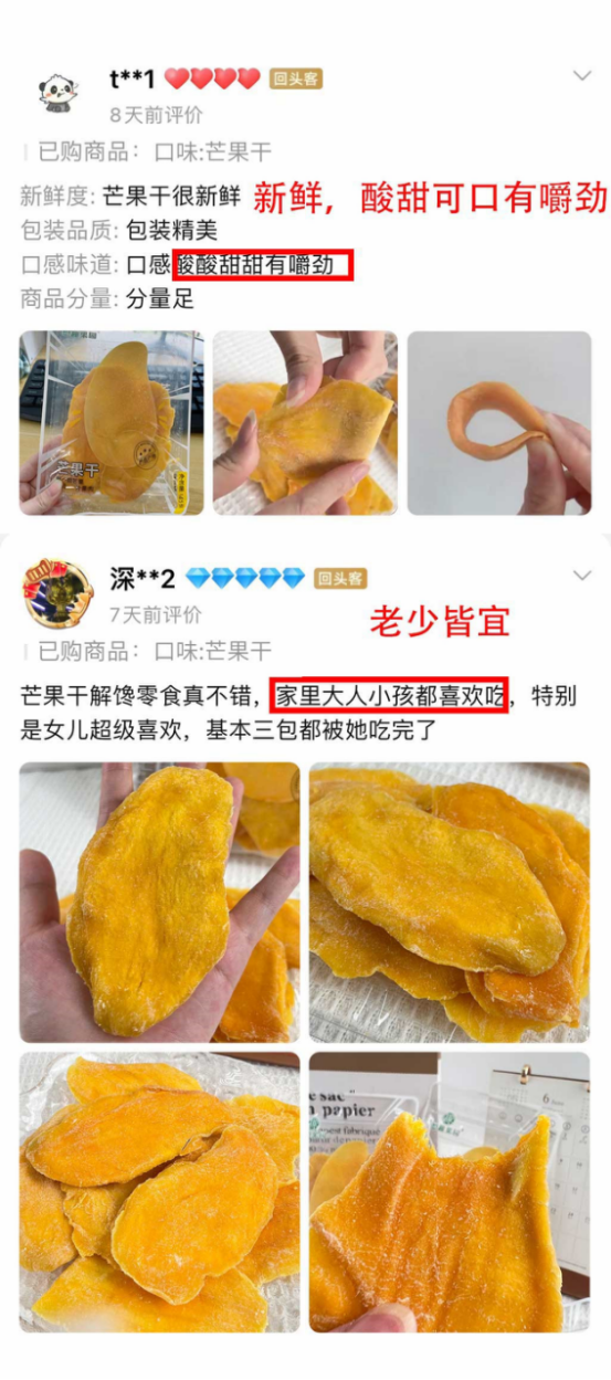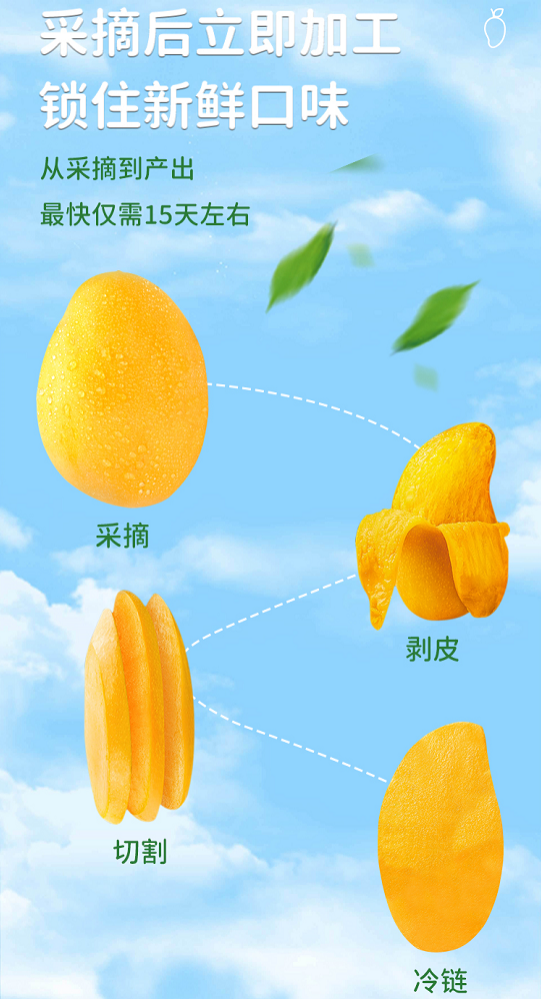 4.工序的繁杂只为造就美味的芒果干,黑科技低温烘烤,采用多次循环,严控加工工艺,成品酸甜爽口,Q滑味美
