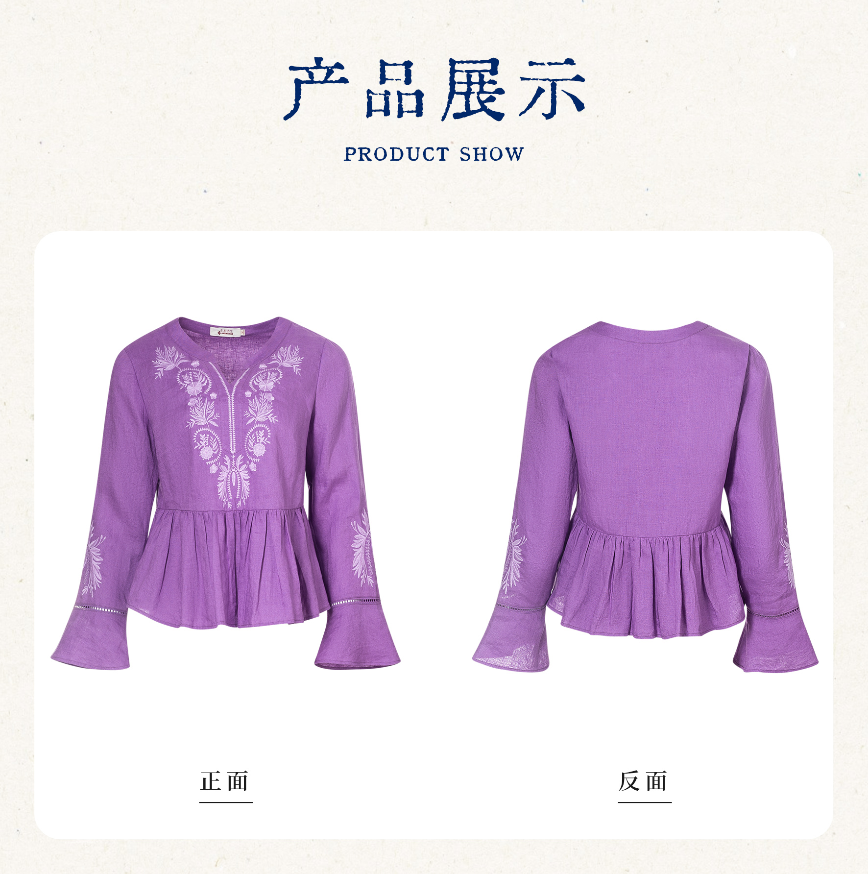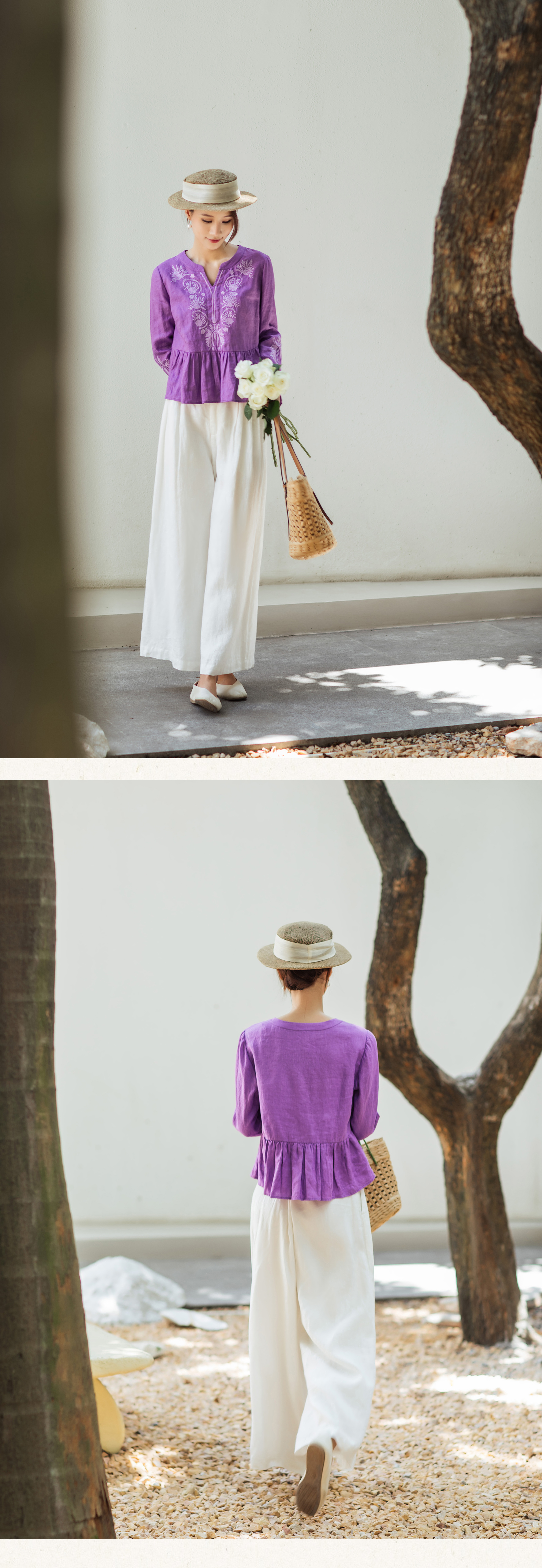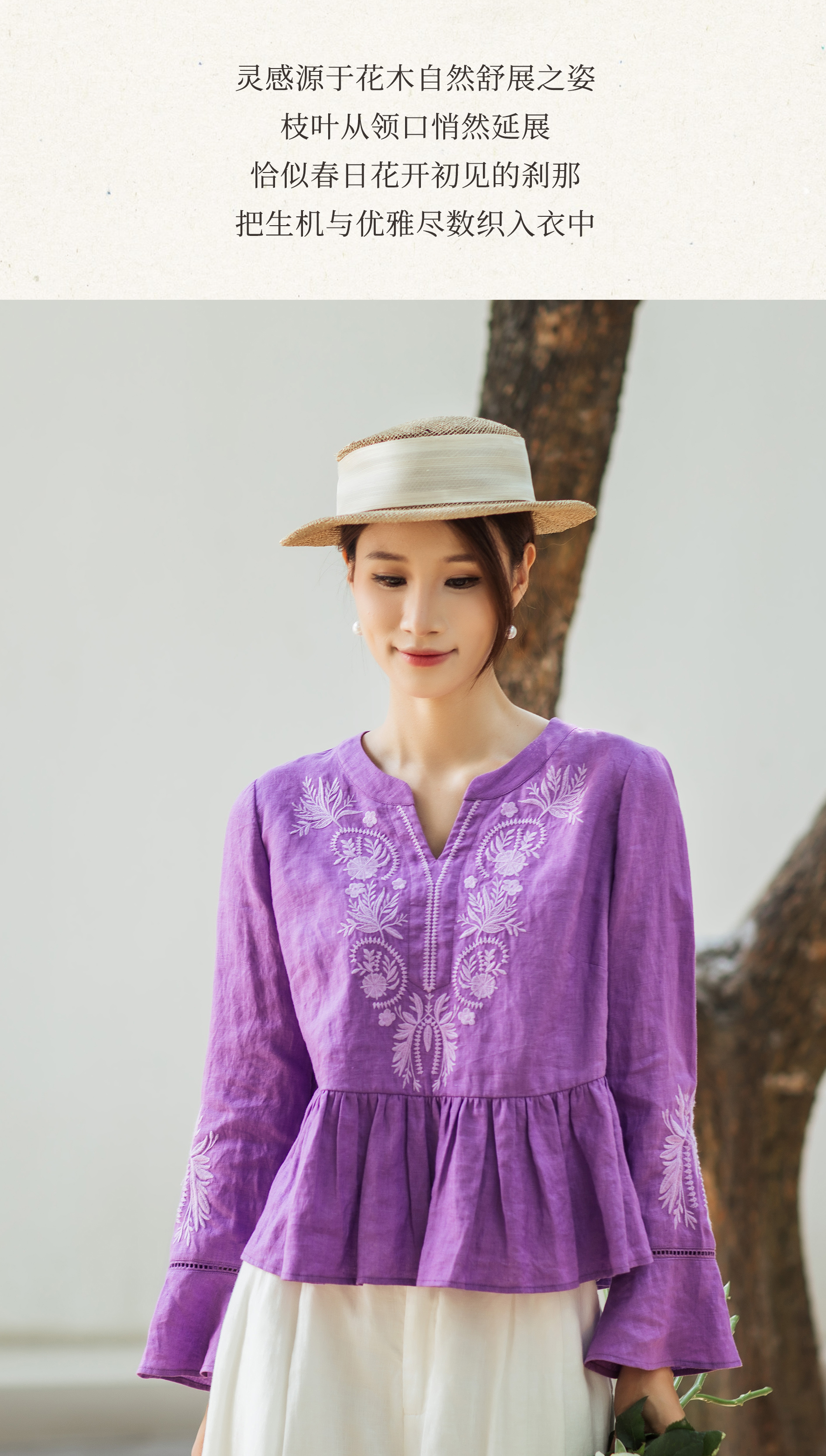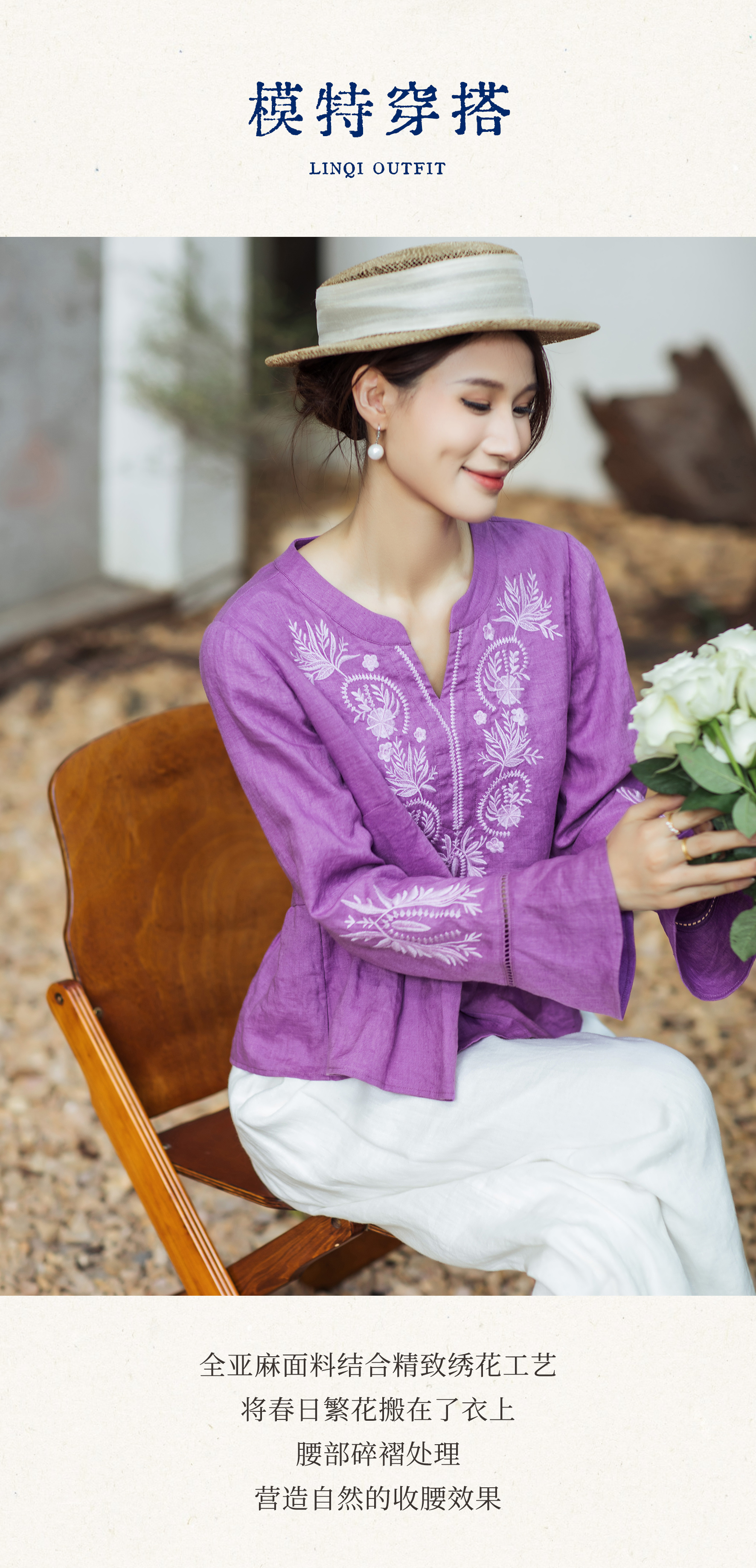 【林栖设计小店】【林栖推荐】薰衣草紫亚麻呼吸透气清爽V领上衣女N1953332