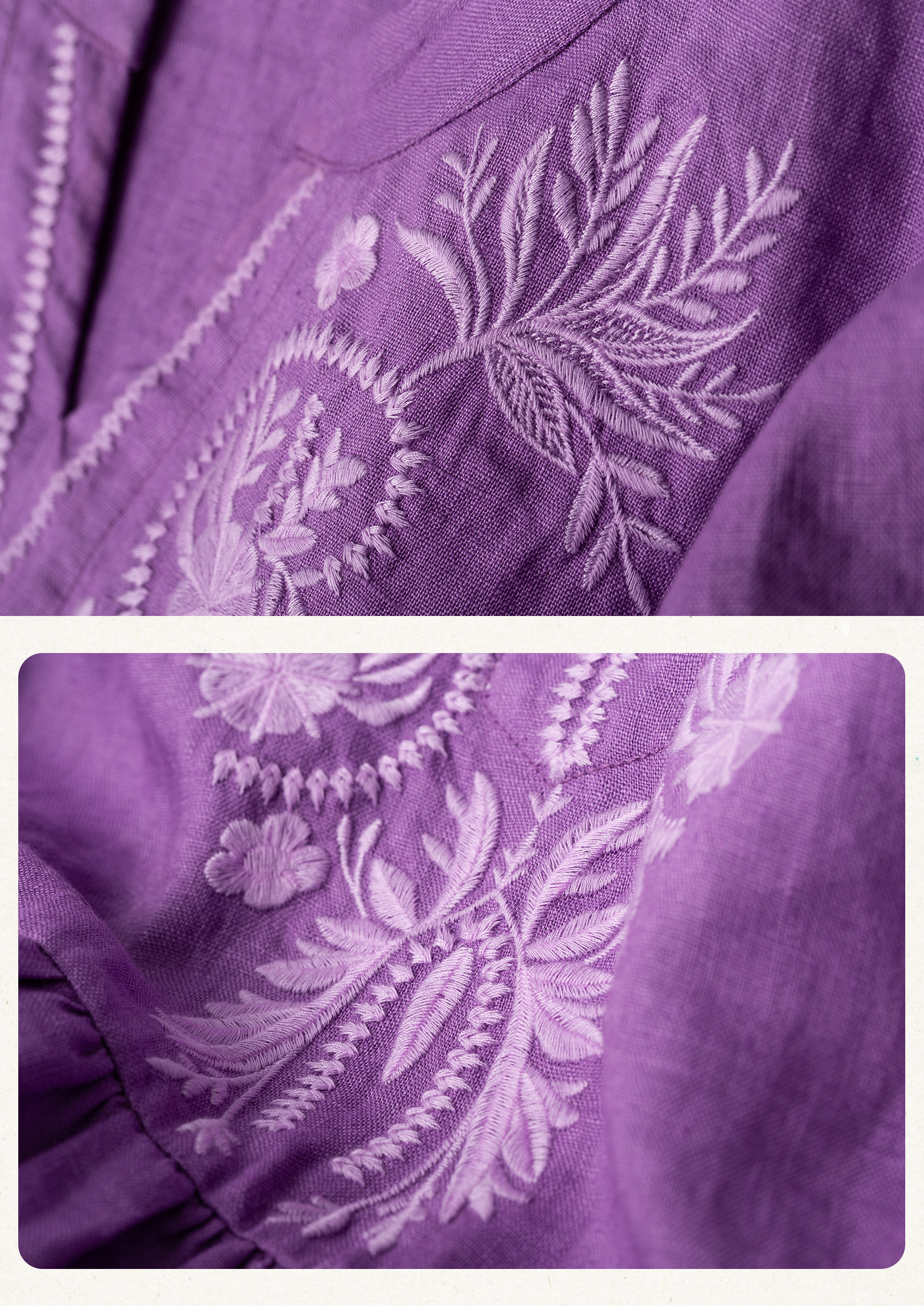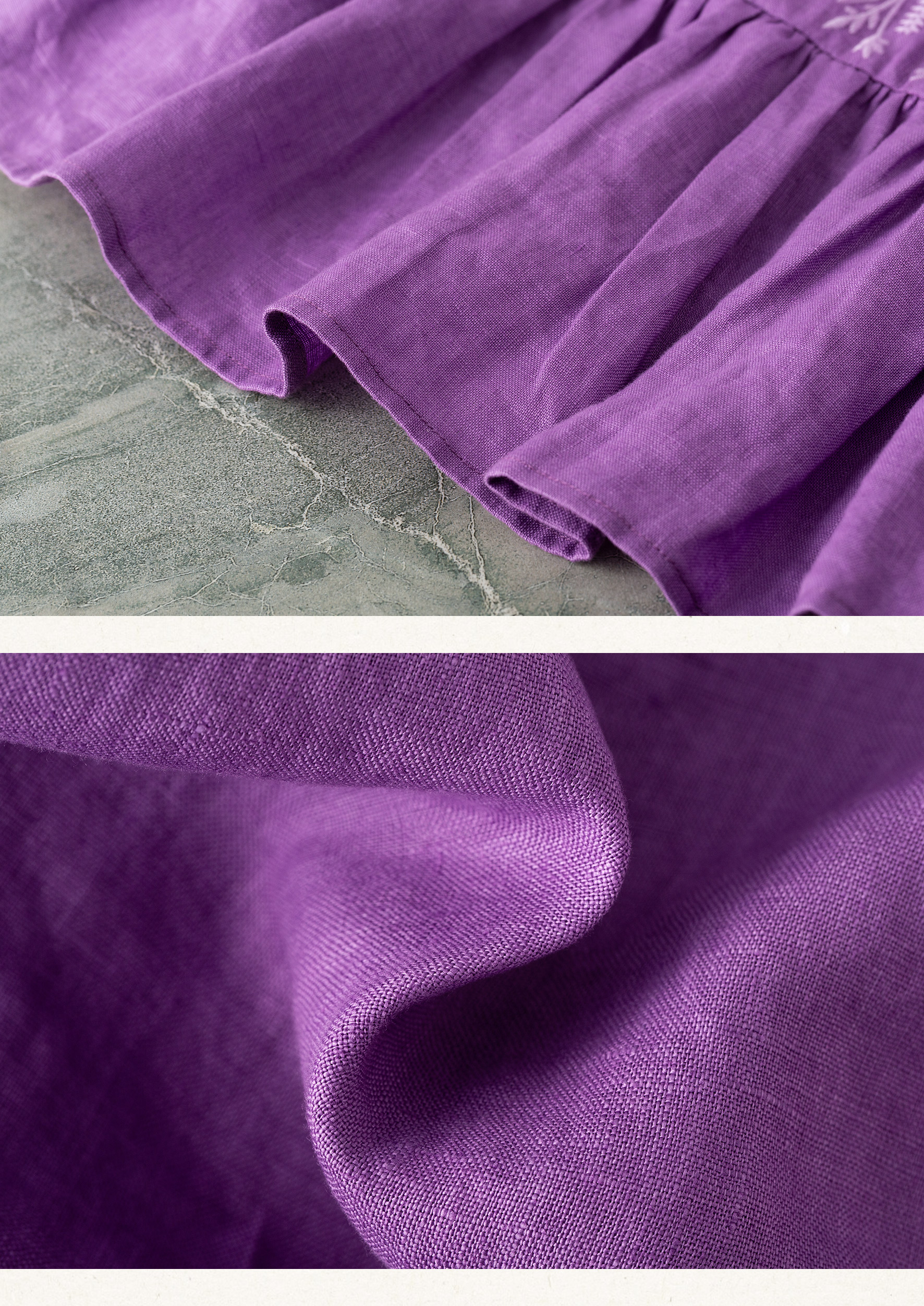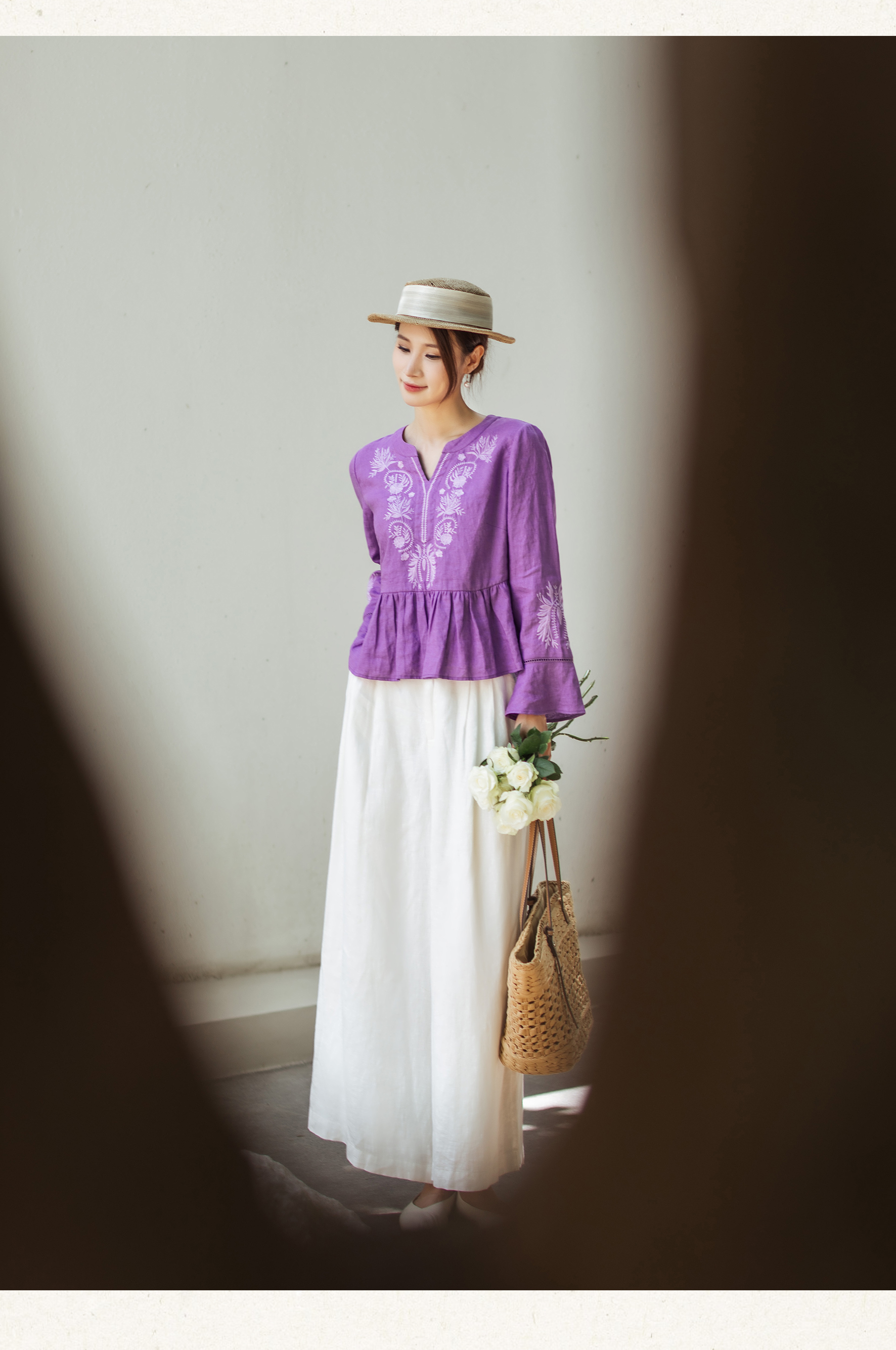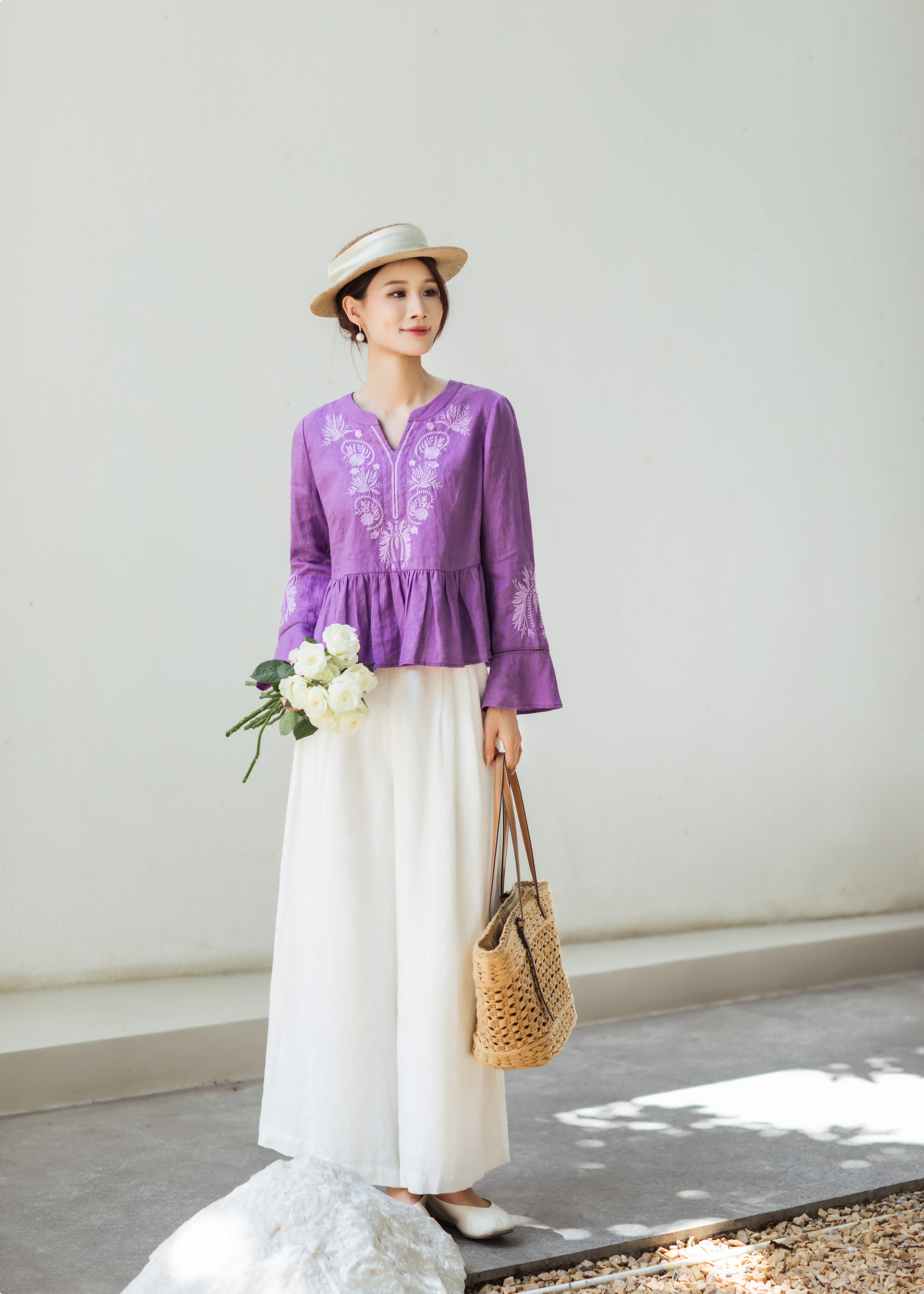 【林栖设计小店】【林栖推荐】薰衣草紫亚麻呼吸透气清爽V领上衣女N1953332
