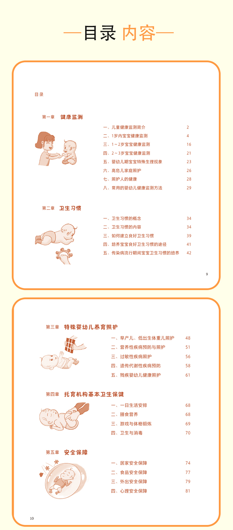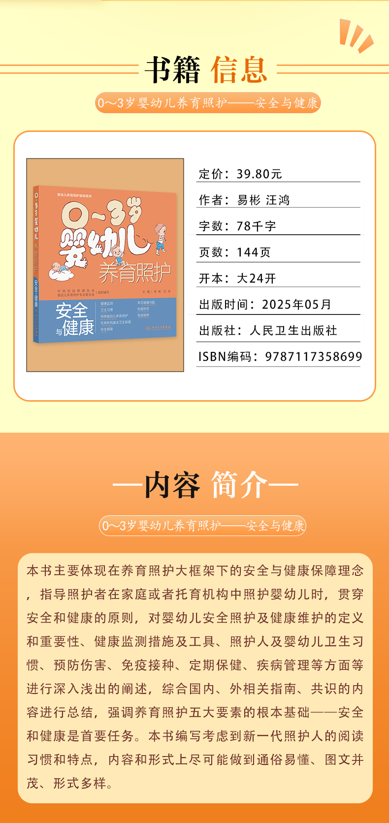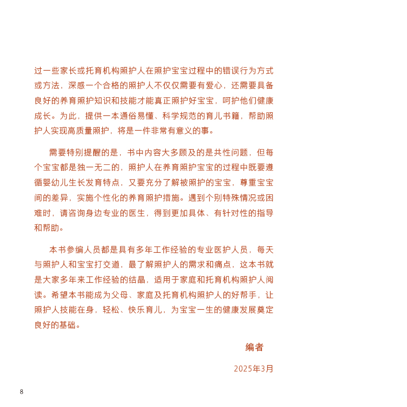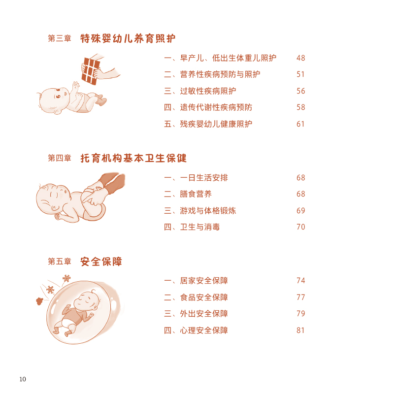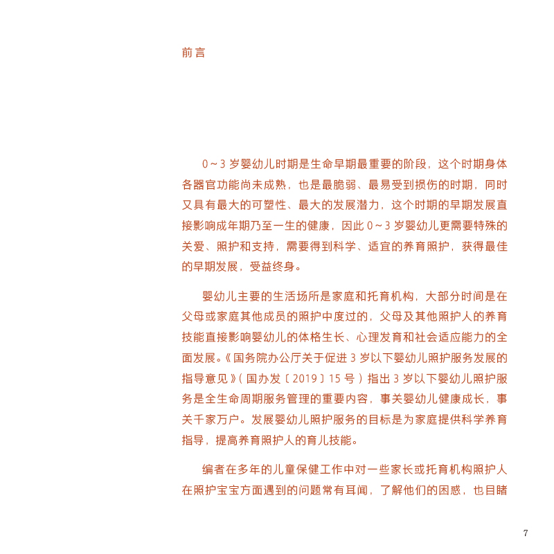 本书主要体现在养育照护大框架下的安全与健康保障理念,指导照护者在家庭或者托育机构中照护婴幼儿时,贯穿安全和健康的原则,对婴幼儿安全照护及健康维护的定义和重要性、健康监测措施及工具、照护人及婴幼儿卫生习惯、预防伤害、免疫接种、定期保健、疾病管理等方面等进行深入浅出的阐述,综合国内、外相关指南、共识的内容进行总结,强调养育照护五大要素的根本基础——安全和健康是首要任务。本书编写考虑到新一代照护人的阅读习惯和特点,内容和形式上尽可能做到通俗易懂、图文并茂、形式多样。