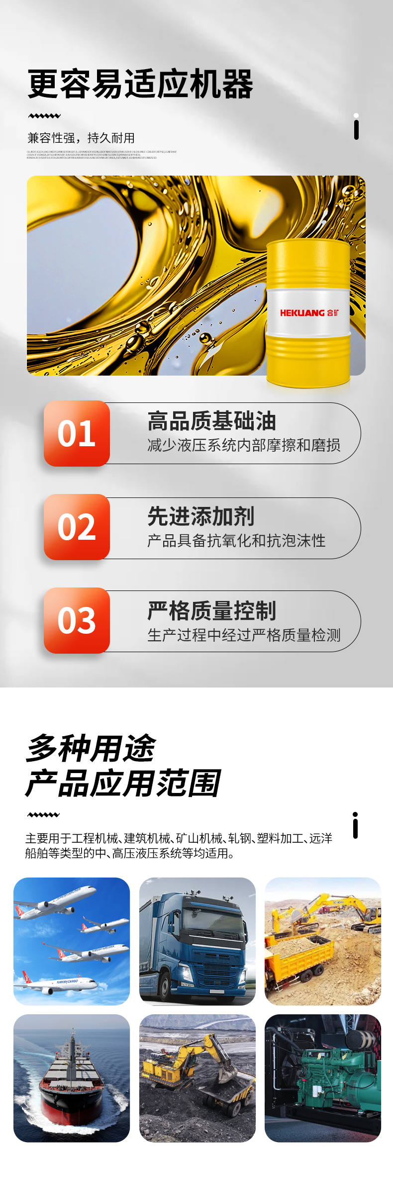 可广泛应用于工业、机械设备、工程机械、建筑机械、矿山机械和车辆中的液压系统;合矿抗耐磨液压油广泛适用于对清洁度有要求的工业、航运和工程机械、建筑机械、矿山机械、冶金设备等液压系统。