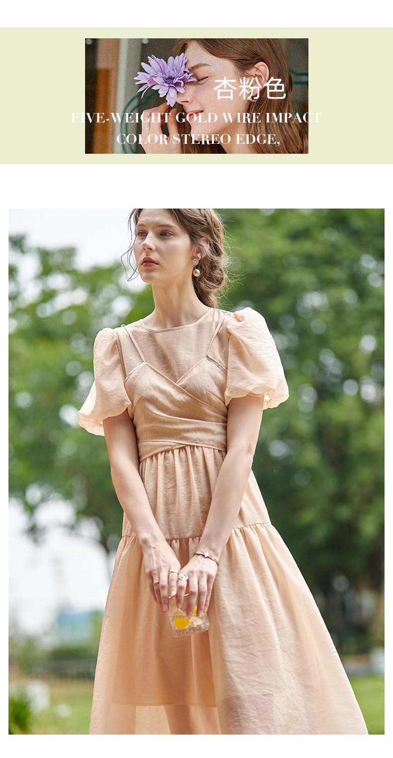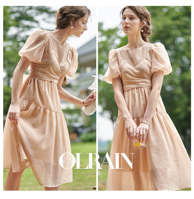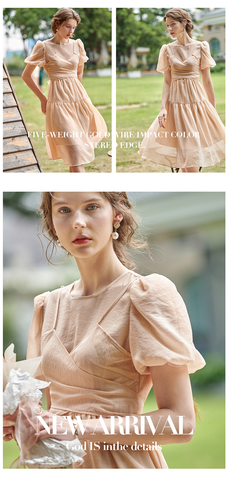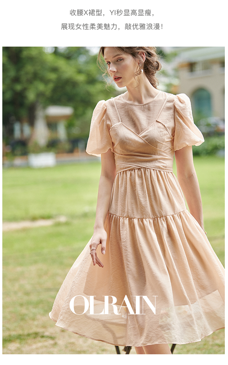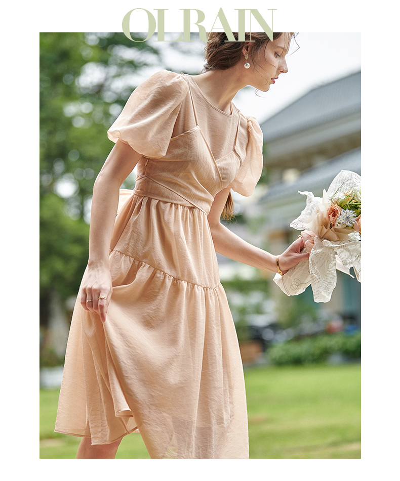 欧芮儿杏粉色连衣裙2021新款夏收腰显瘦法式泡泡纱优雅仙气女神裙