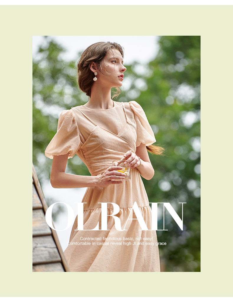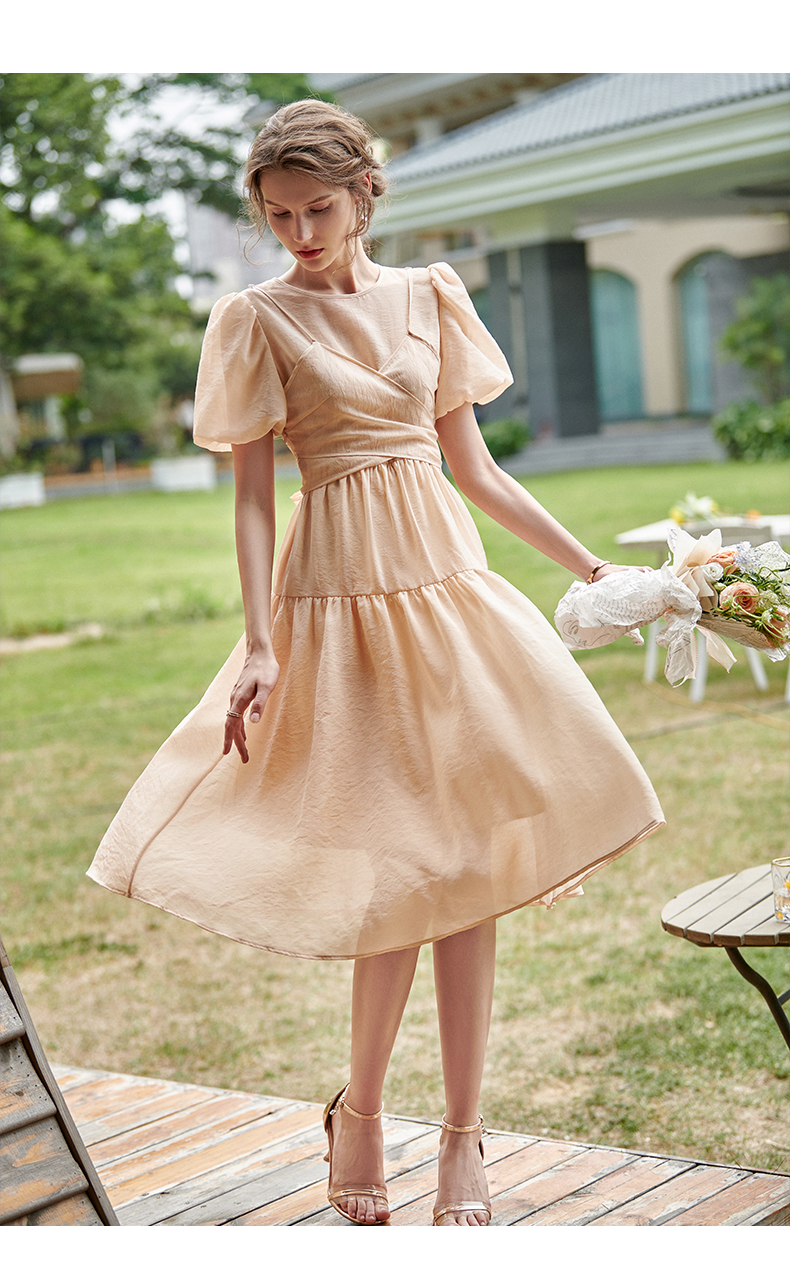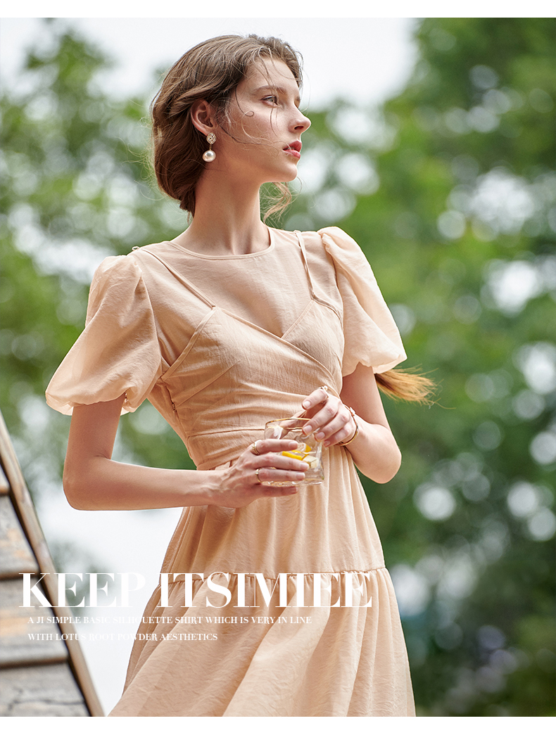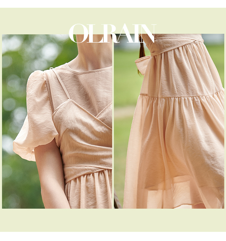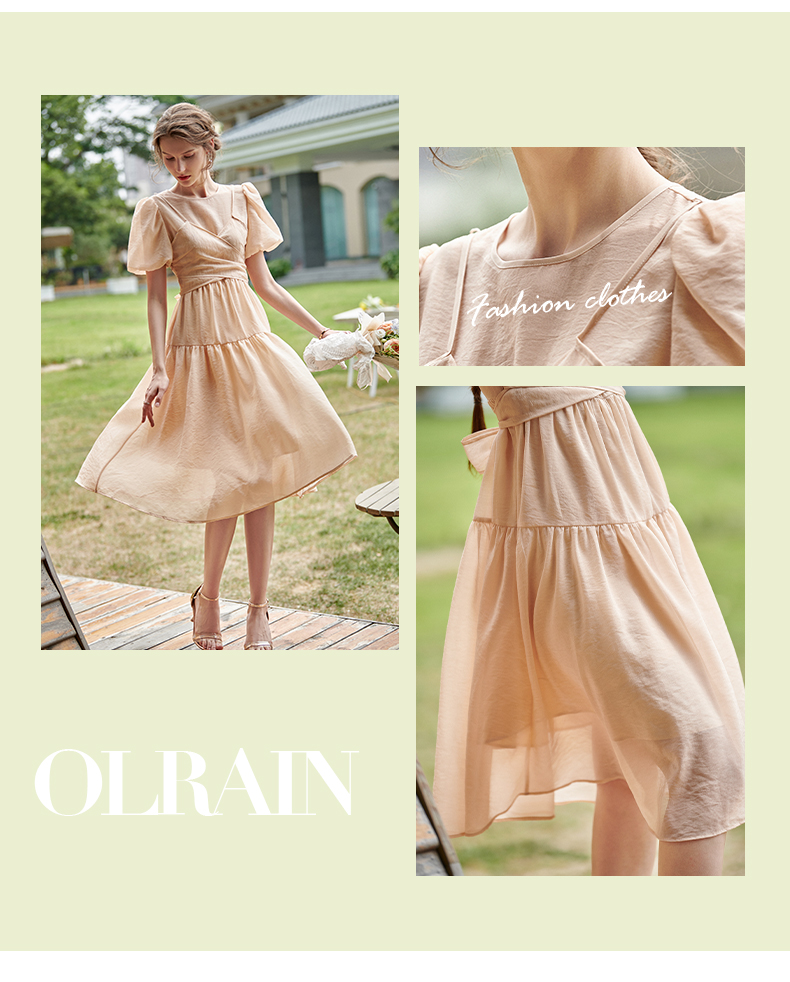 欧芮儿杏粉色连衣裙2021新款夏收腰显瘦法式泡泡纱优雅仙气女神裙