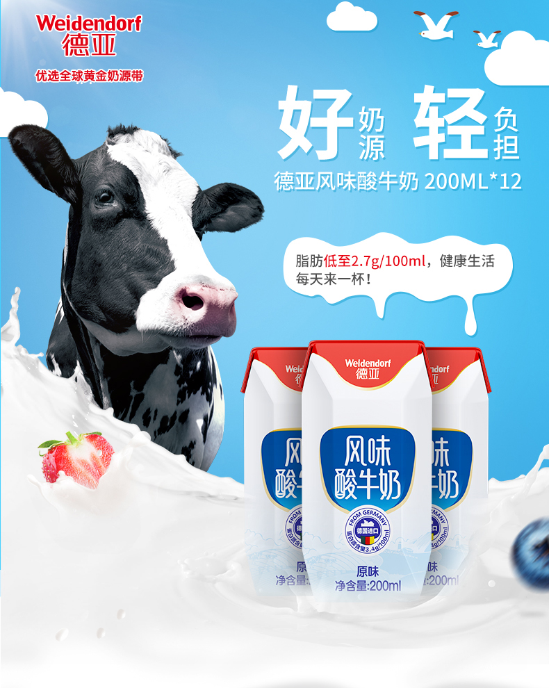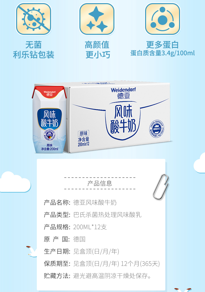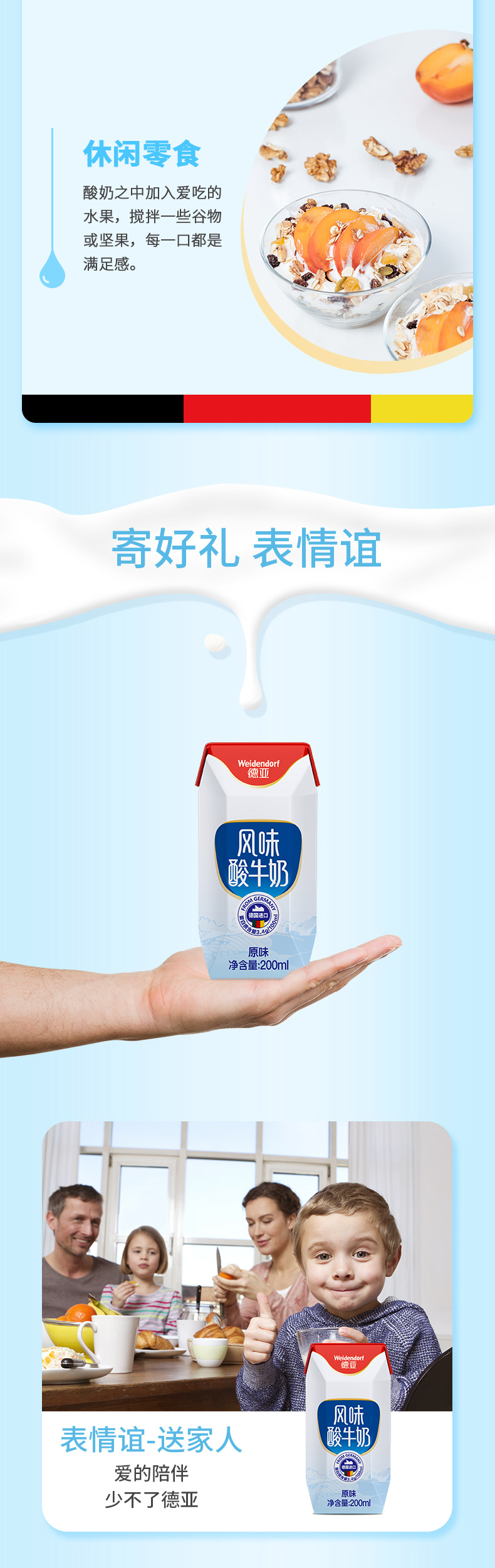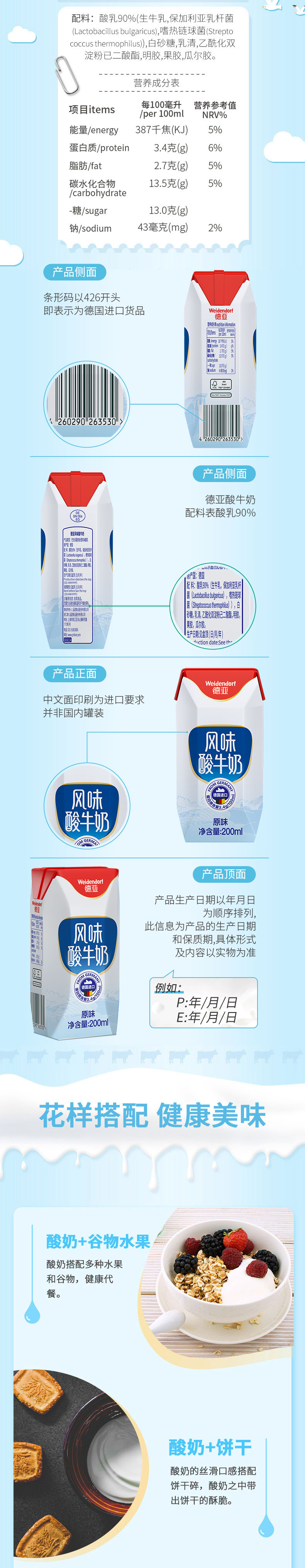 德国进口酸奶 德亚(Weidendorf)常温原味酸牛奶 200ml*12盒 整箱装 自营酸奶