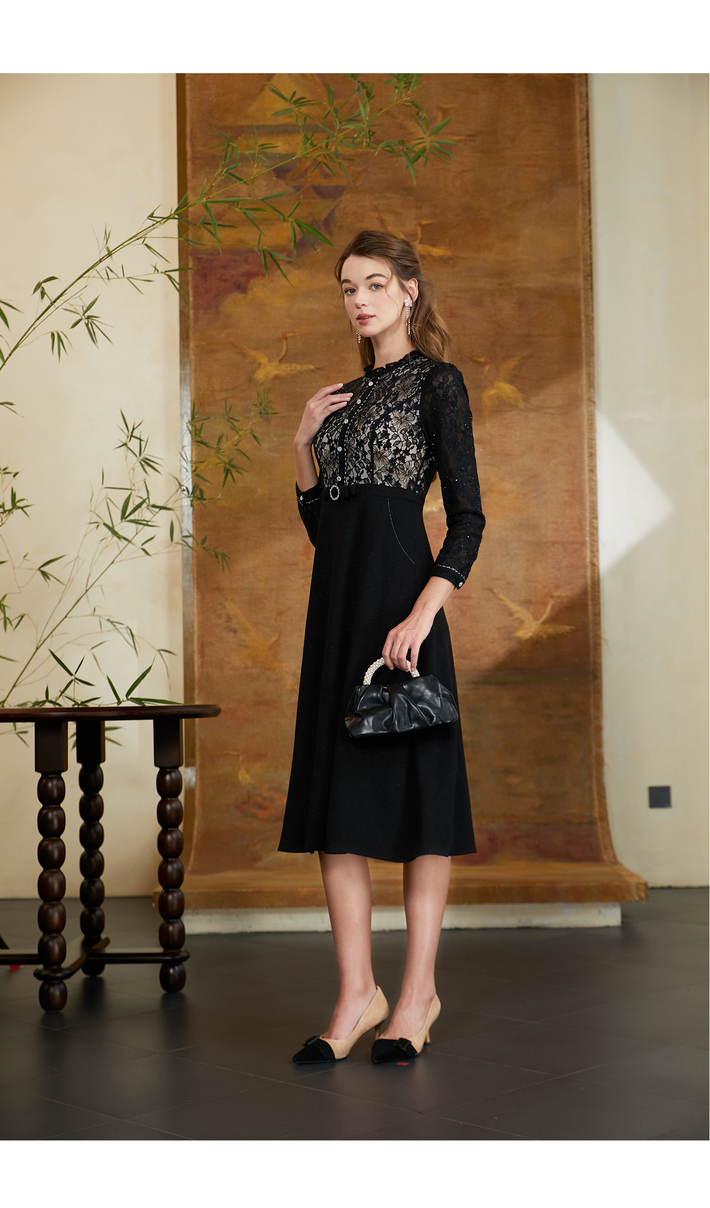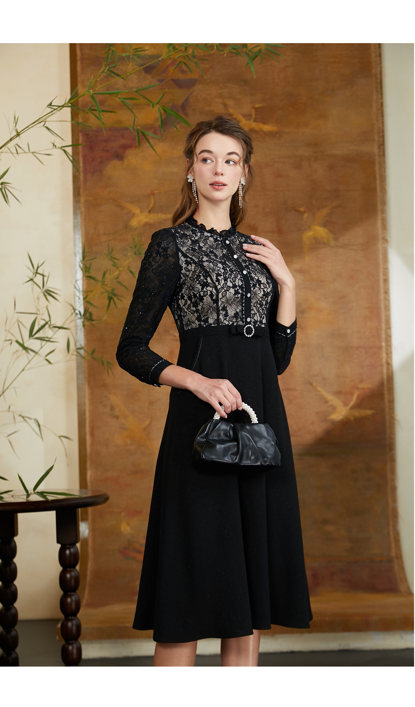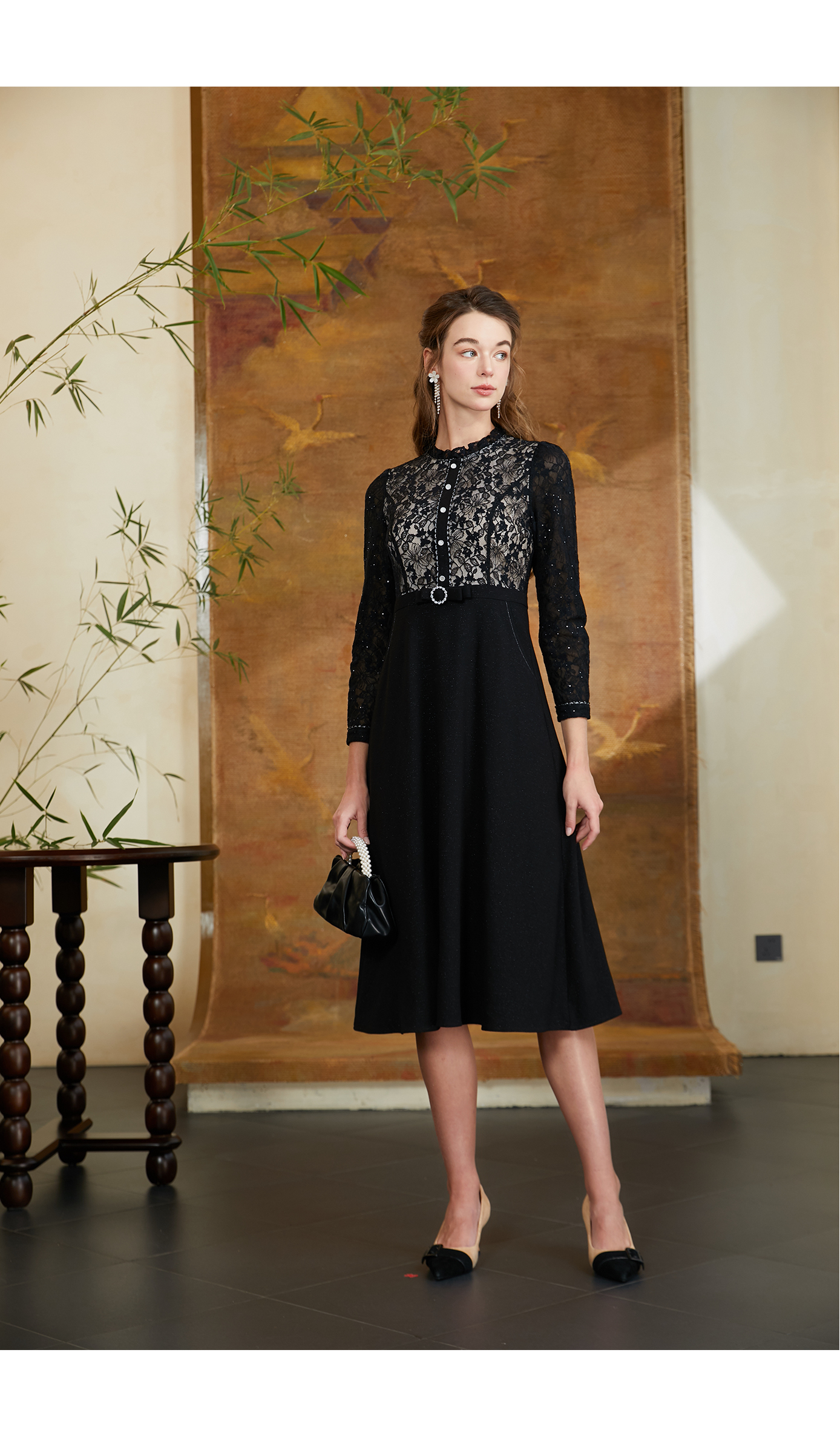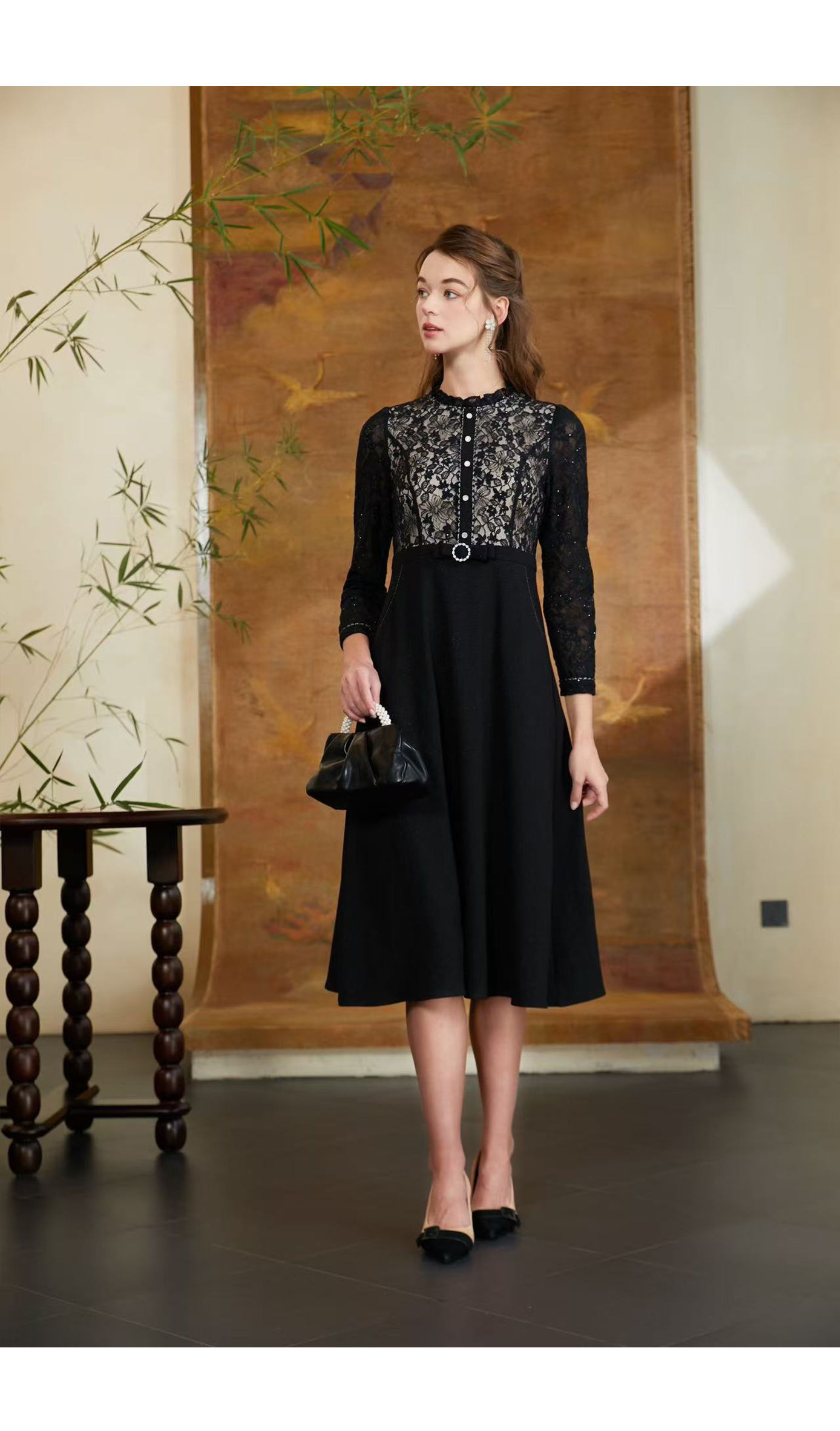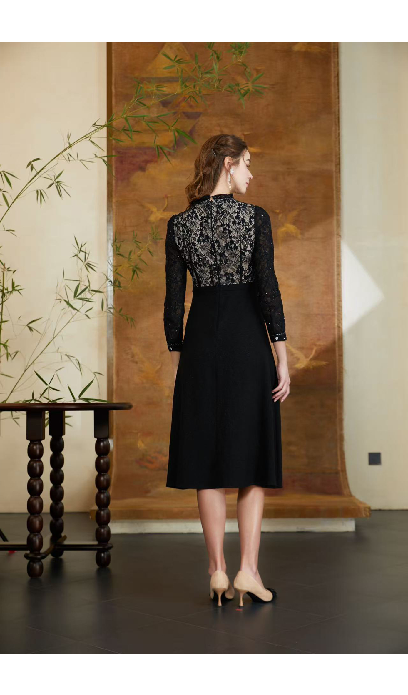 司歌蕾丝长袖修身优雅气质连衣裙A901338X