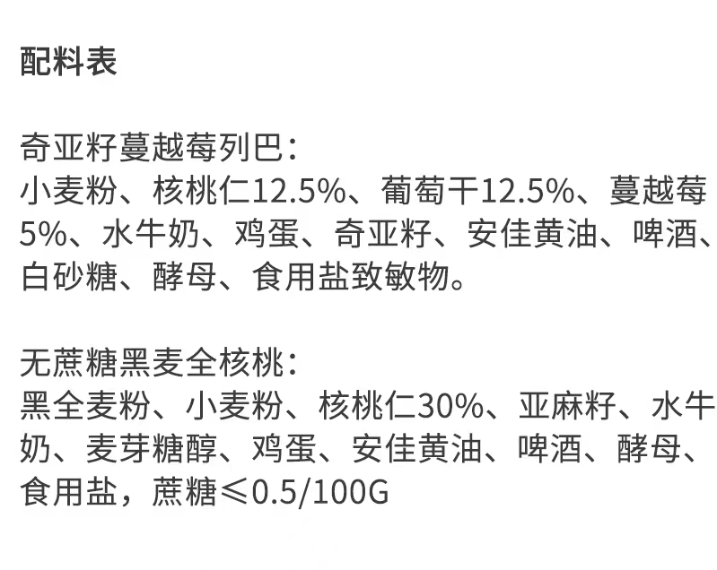 想要无蔗糖的选【全核桃列巴】,想要口感更丰富选【蔓越莓列巴】