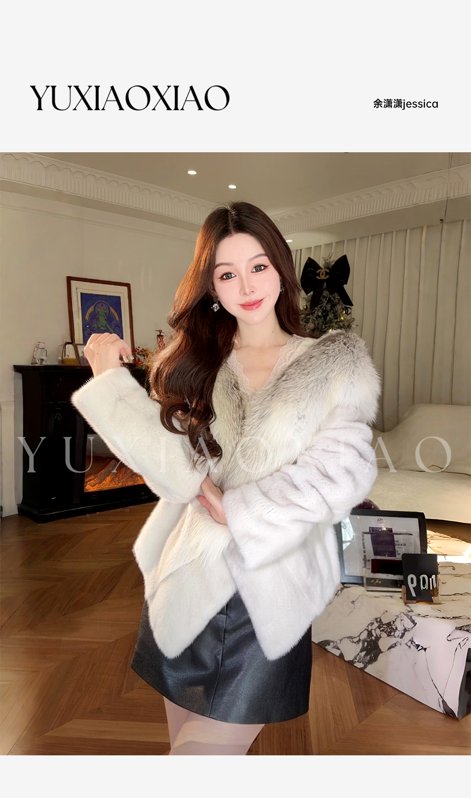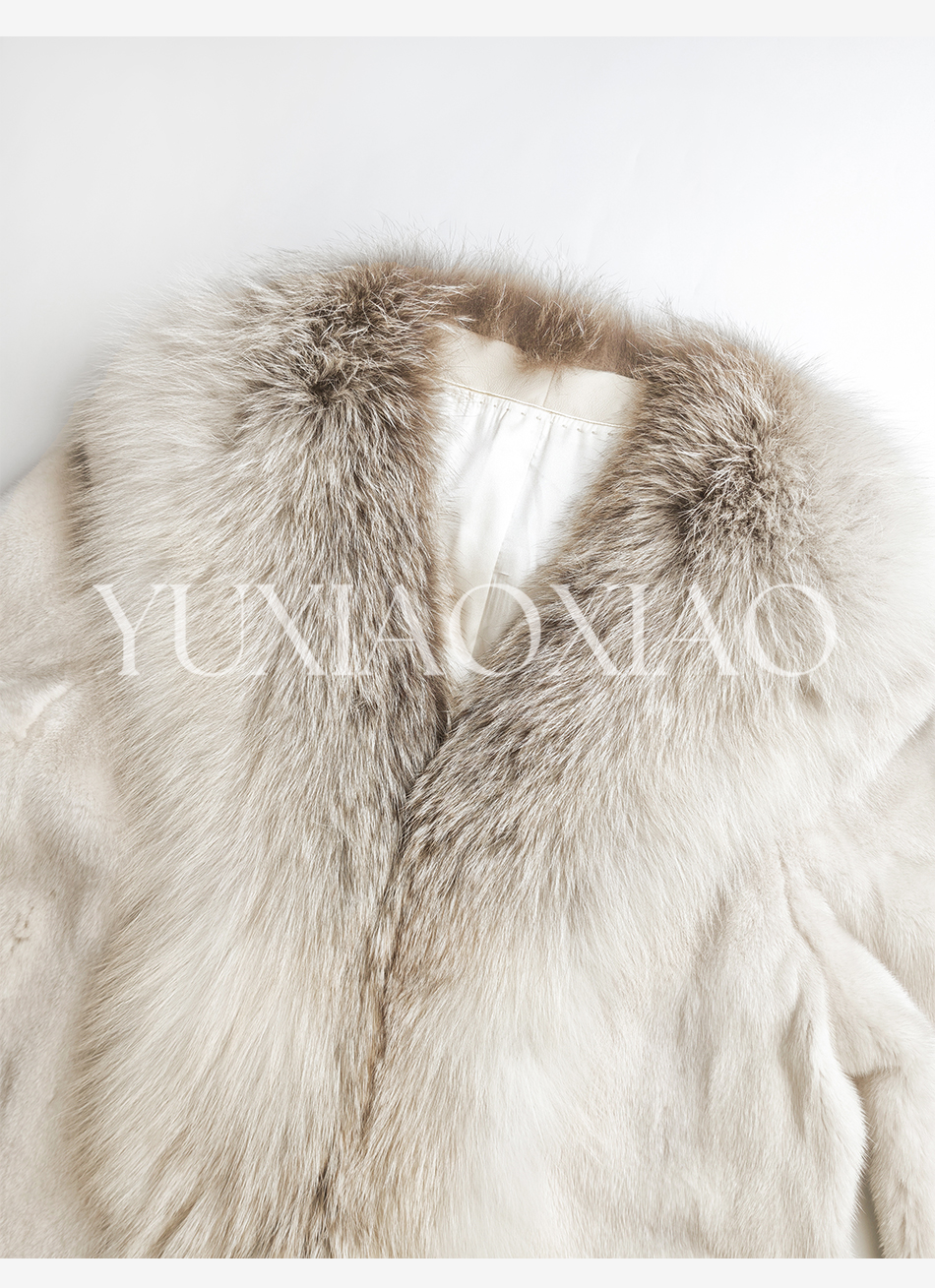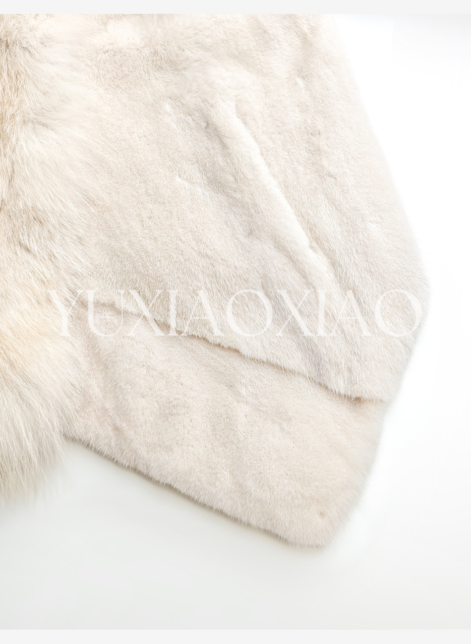 余潇潇【济州风情】层次感天鹅绒水貂毛拼接日辉狐V领皮草外套