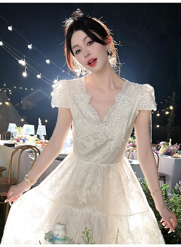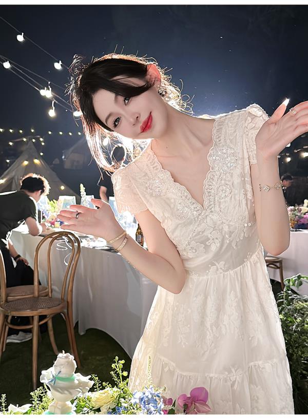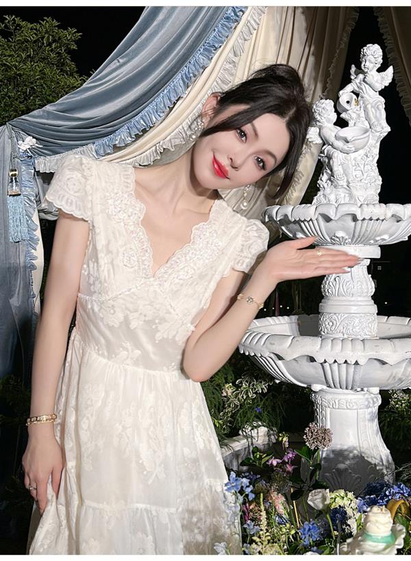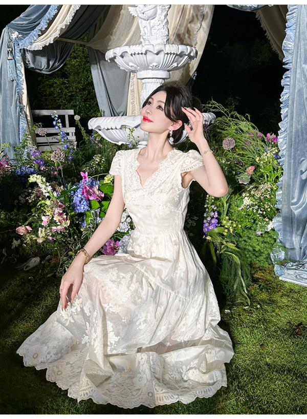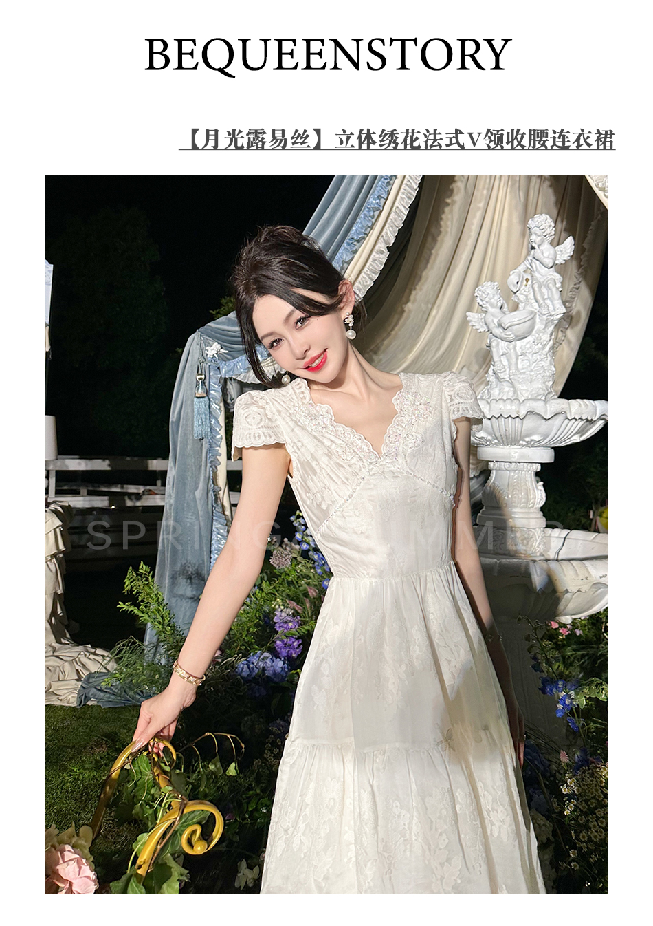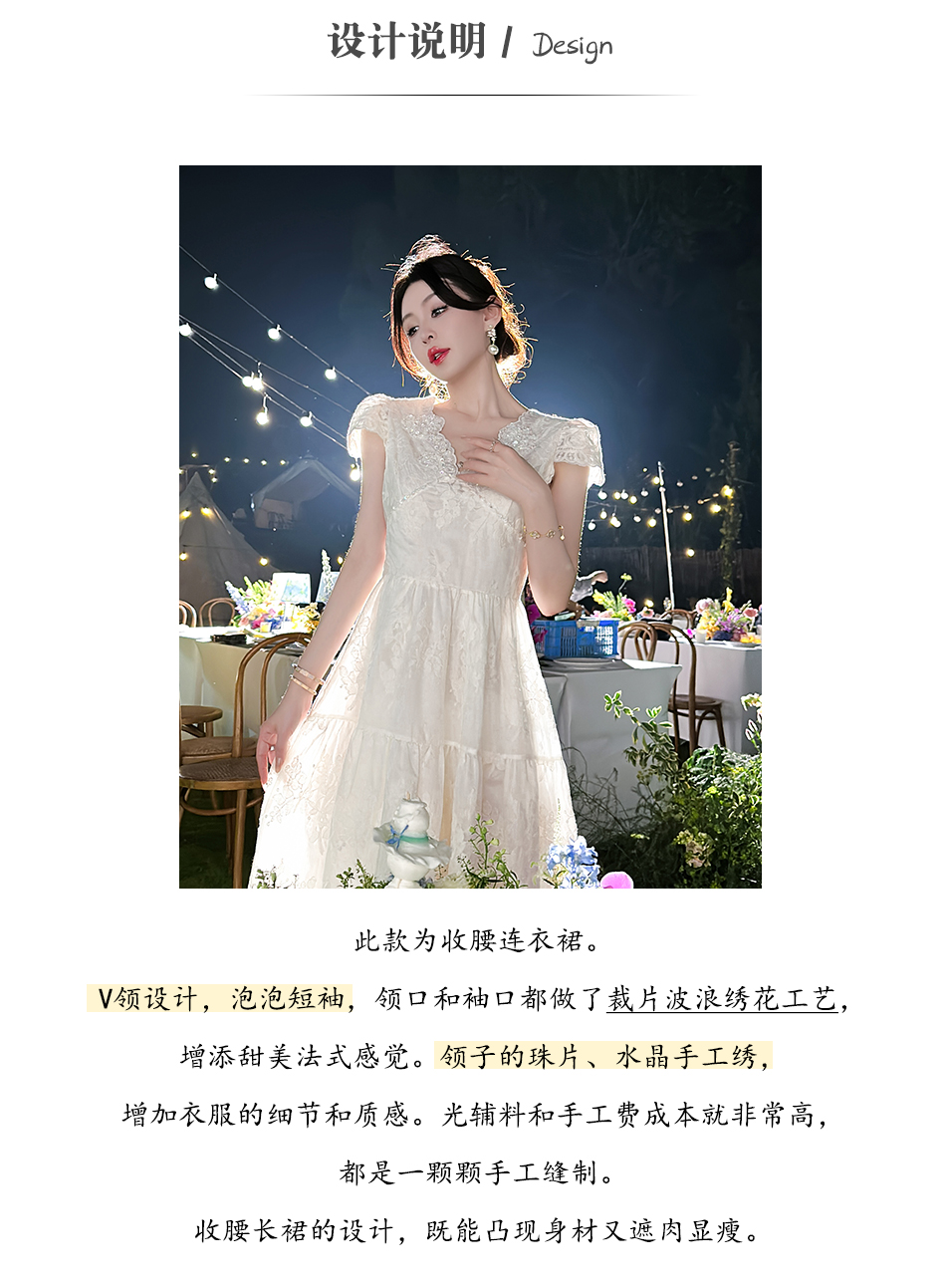 BeQueenStory【月光露易丝】高级感重工立体绣花法式V领收腰连衣裙