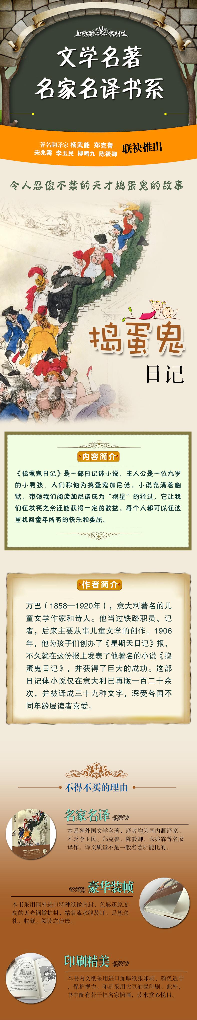 《捣蛋鬼日记》是一部日记体小说,主人公是一位九岁的小男孩,人们称他为捣蛋鬼加尼诺。小说充满着幽默,带领我们阅读加尼诺成为“祸星”的经过,它让我们在发笑之余还能获得一定的教益。每个人都可以在这里找回童年所有的快乐和委屈。