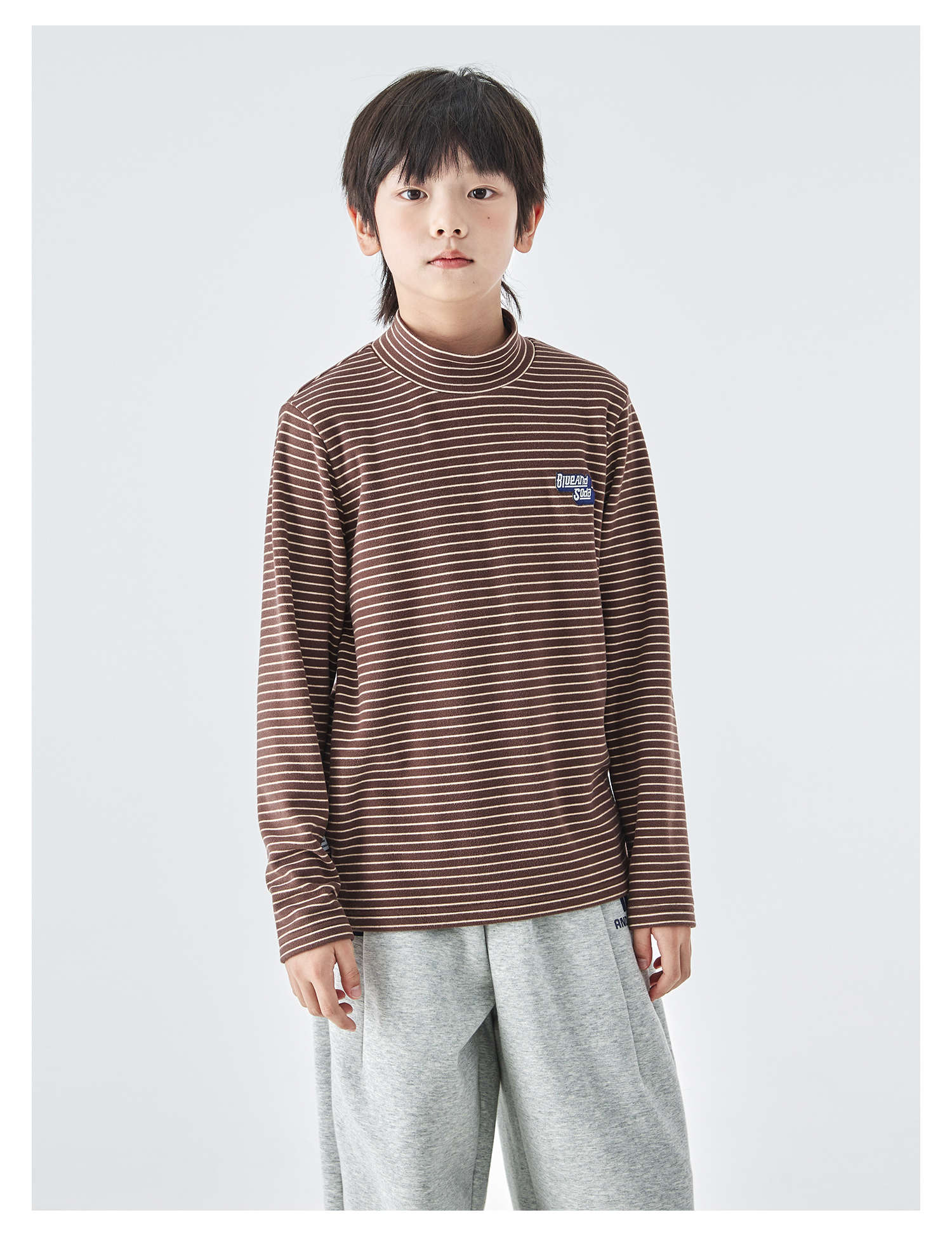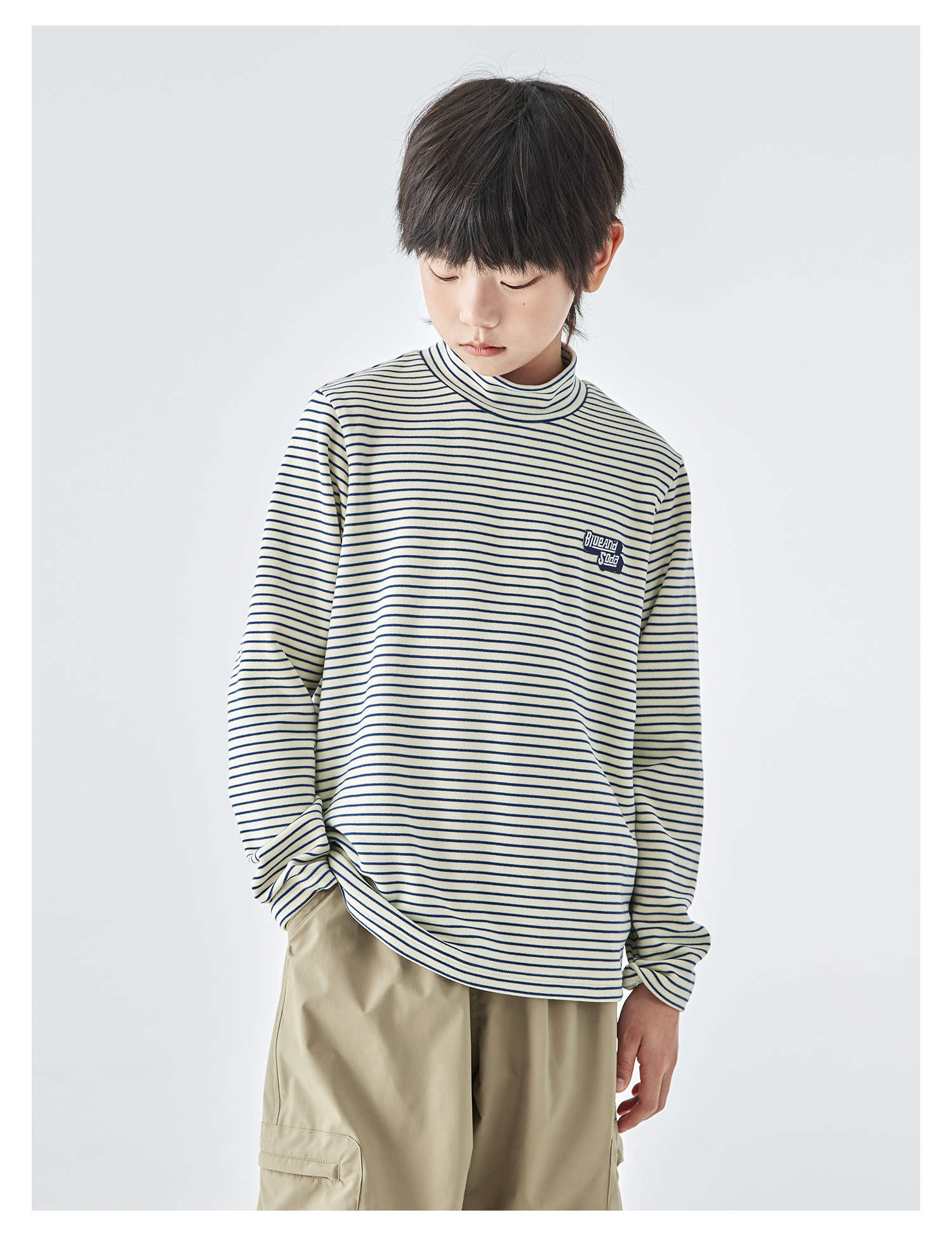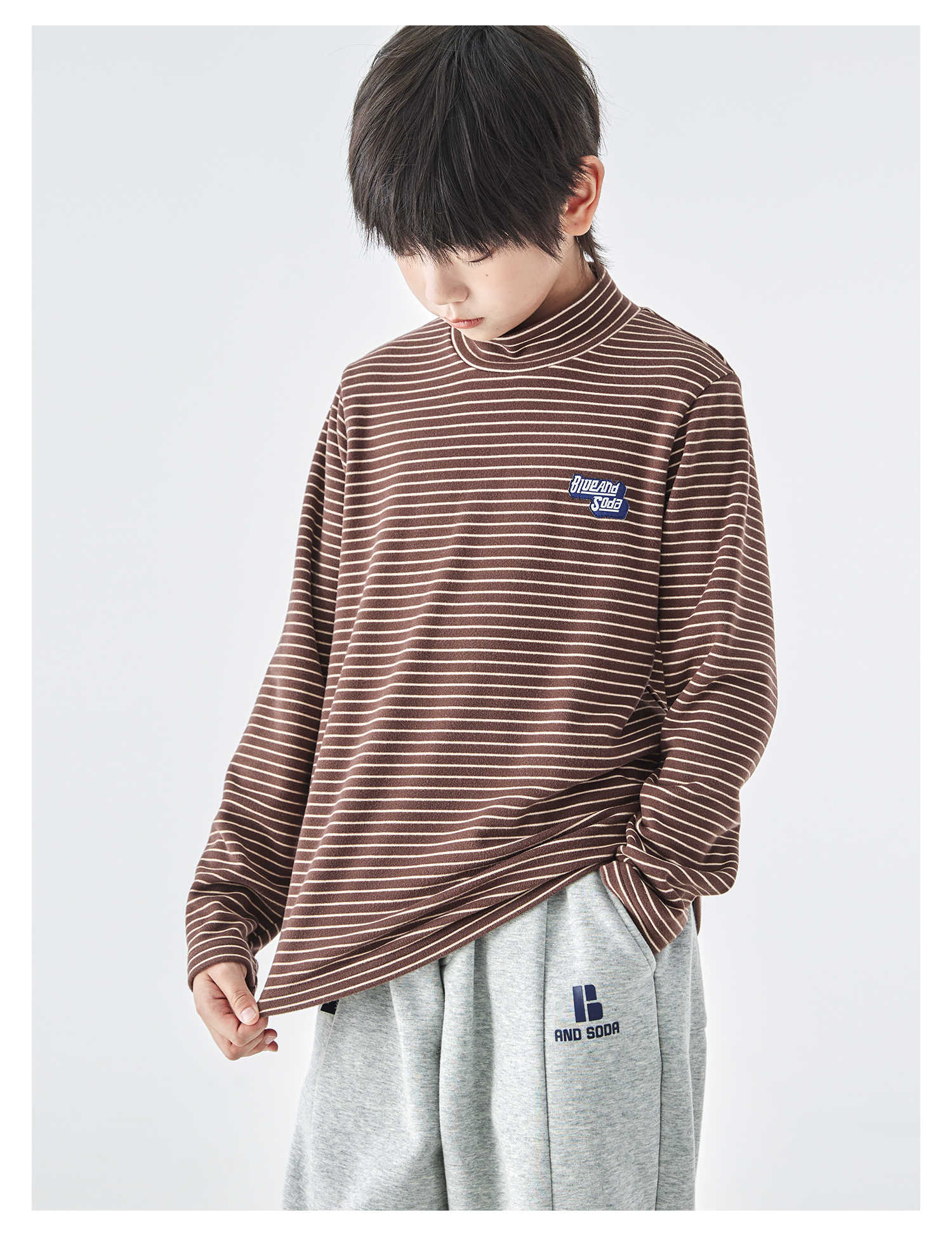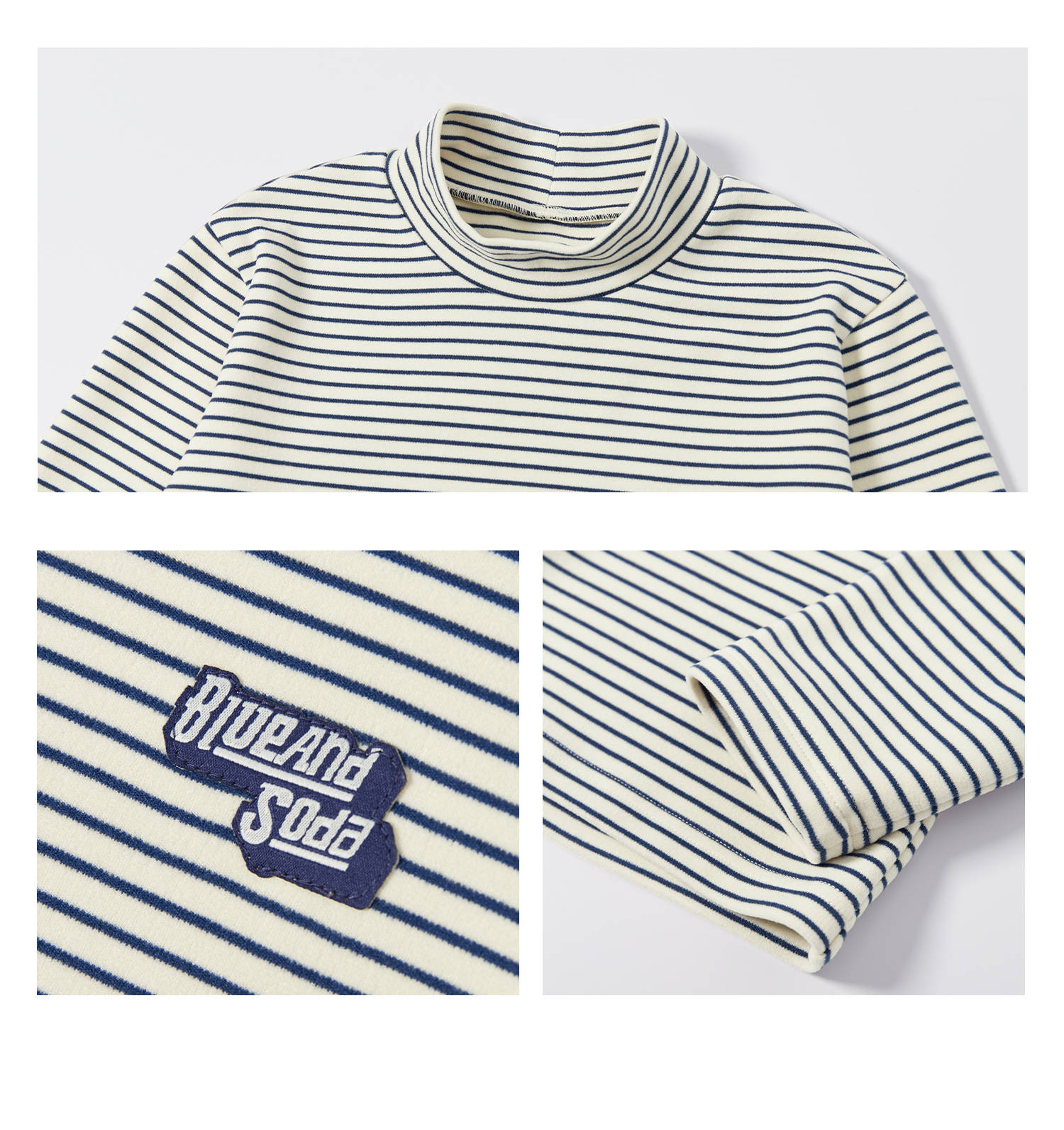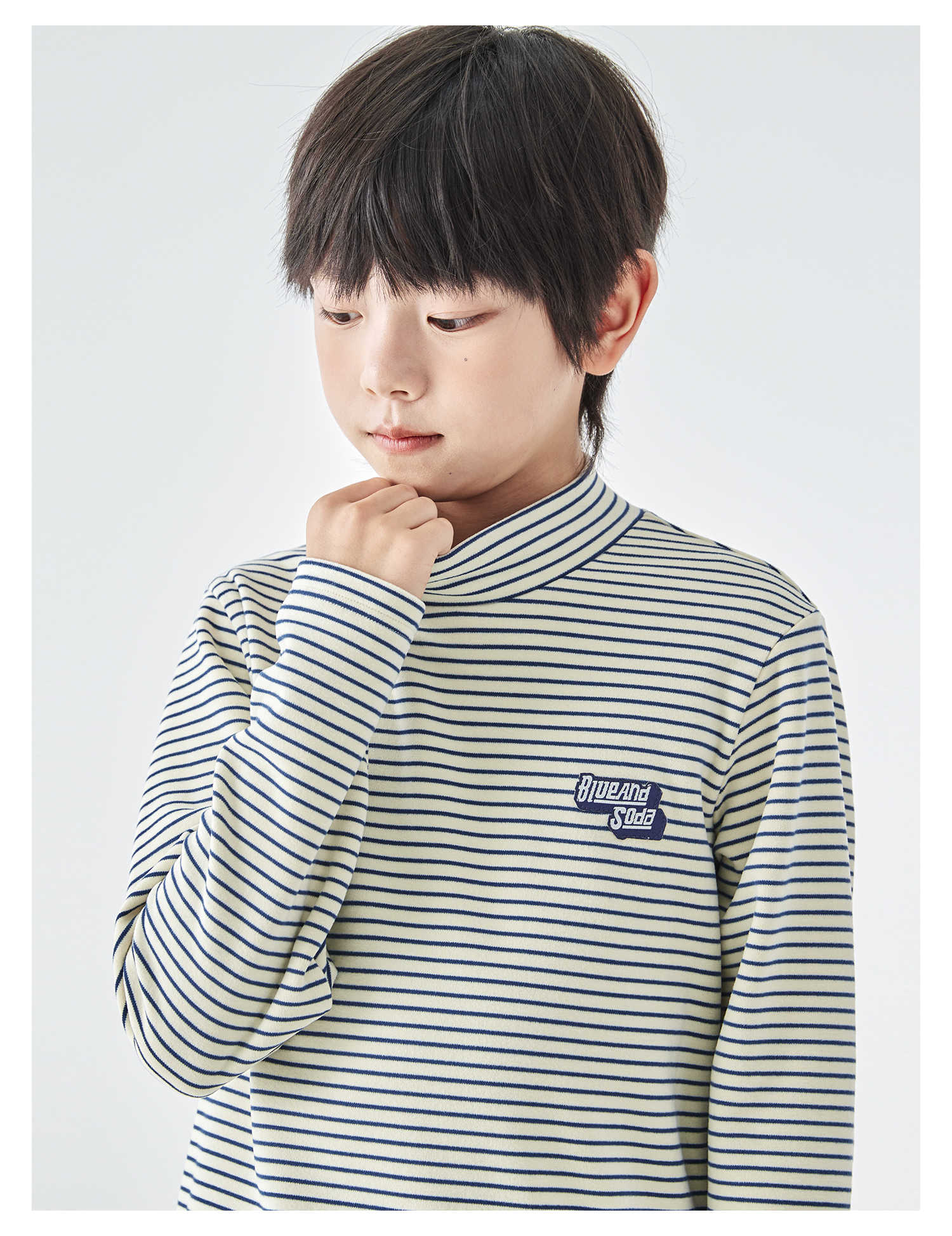 蓝汽水25年冬季新款亲子中大男童条纹T恤打底衫双面绒半高领上衣