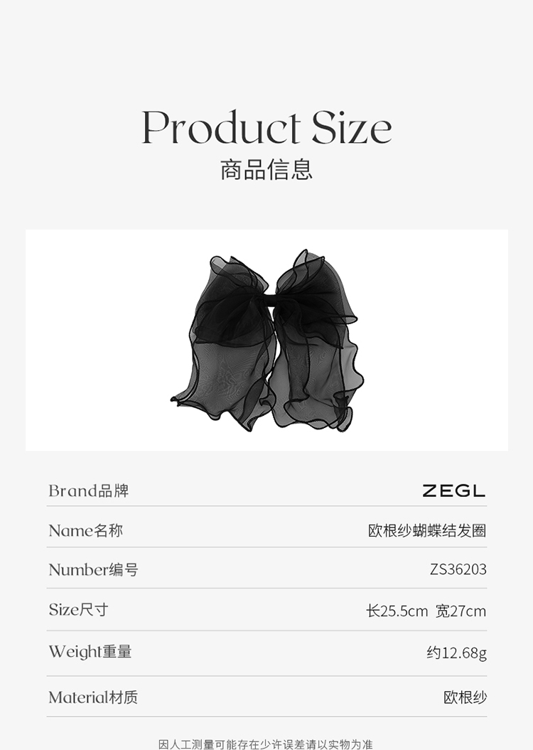 ZEGL黑色网纱蝴蝶结发圈女后脑勺夏发绳头绳简约ins气质头饰发饰