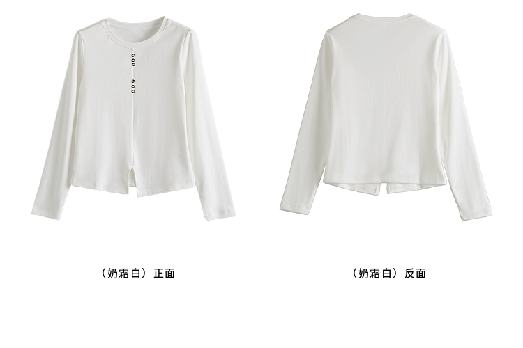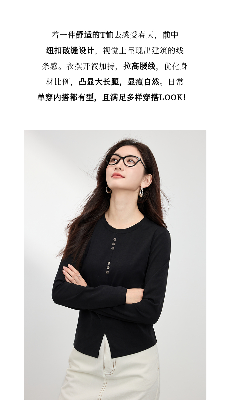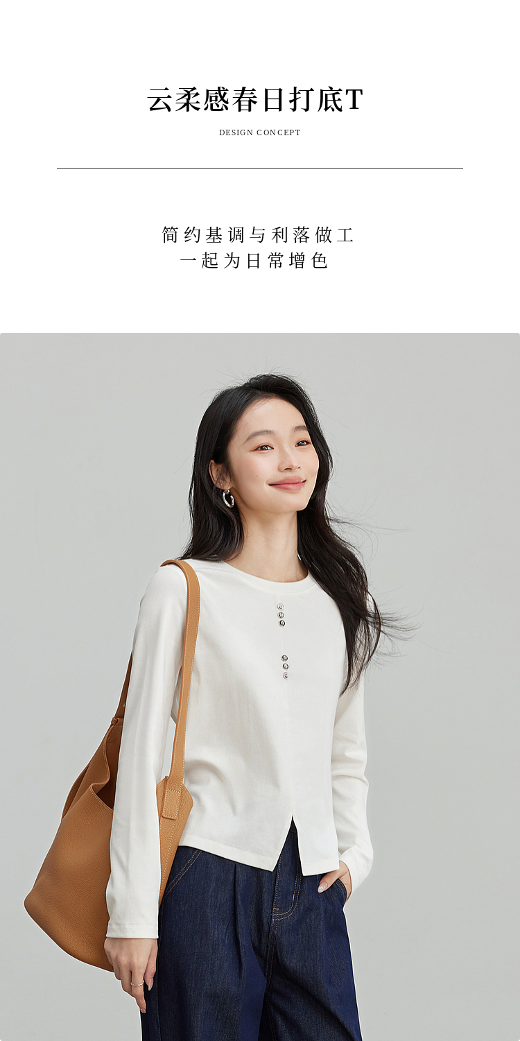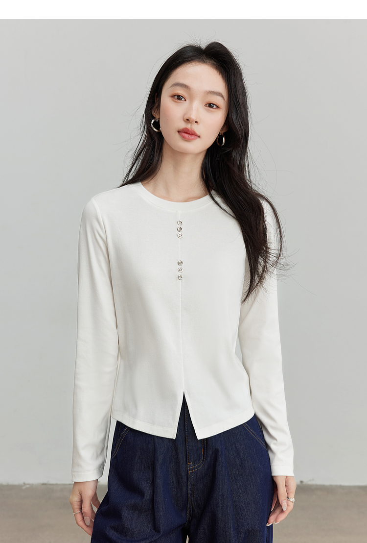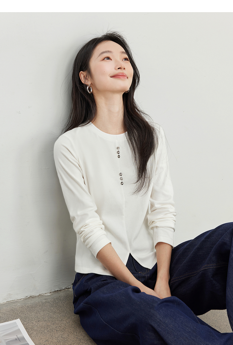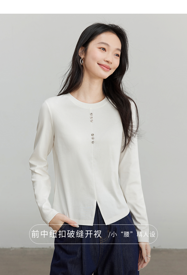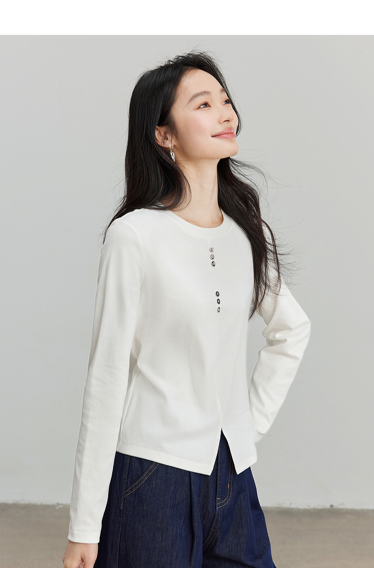 【年终特卖】熙世界设计感开叉纽扣白色t恤长袖2025春日新款圆领体恤打底衫