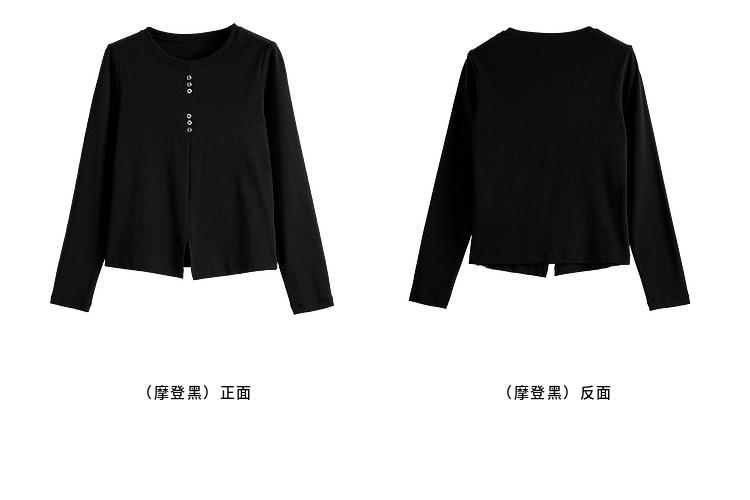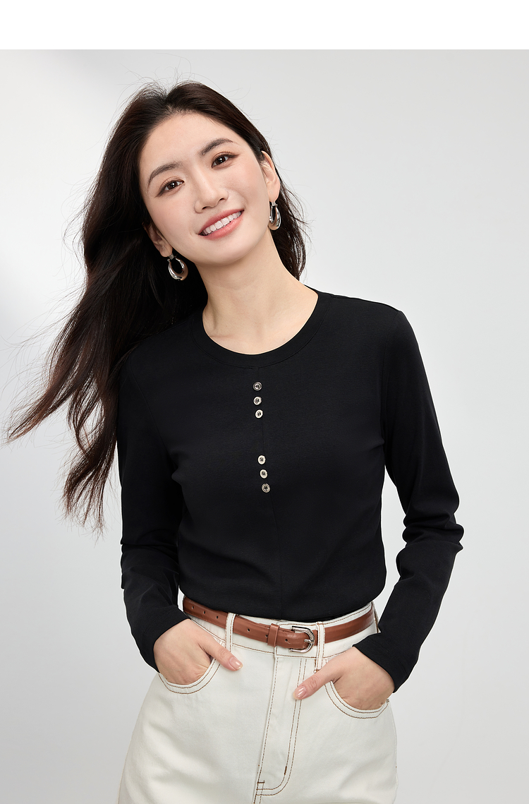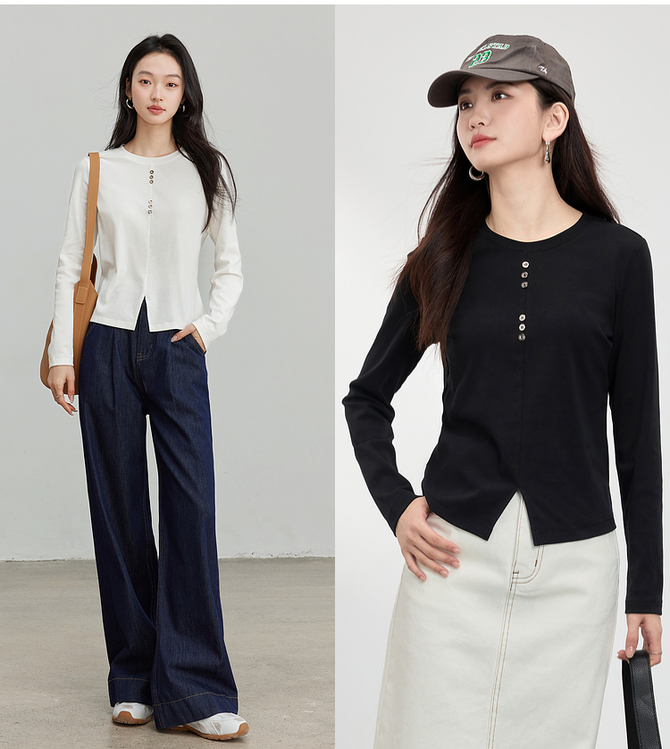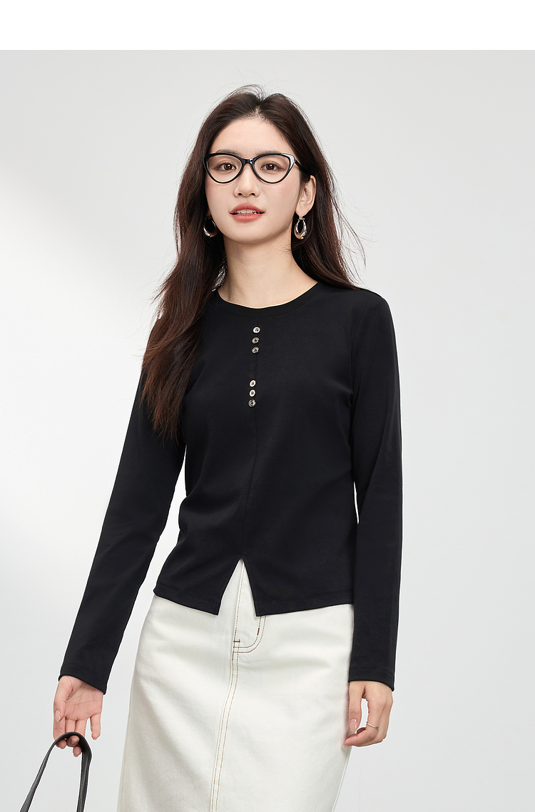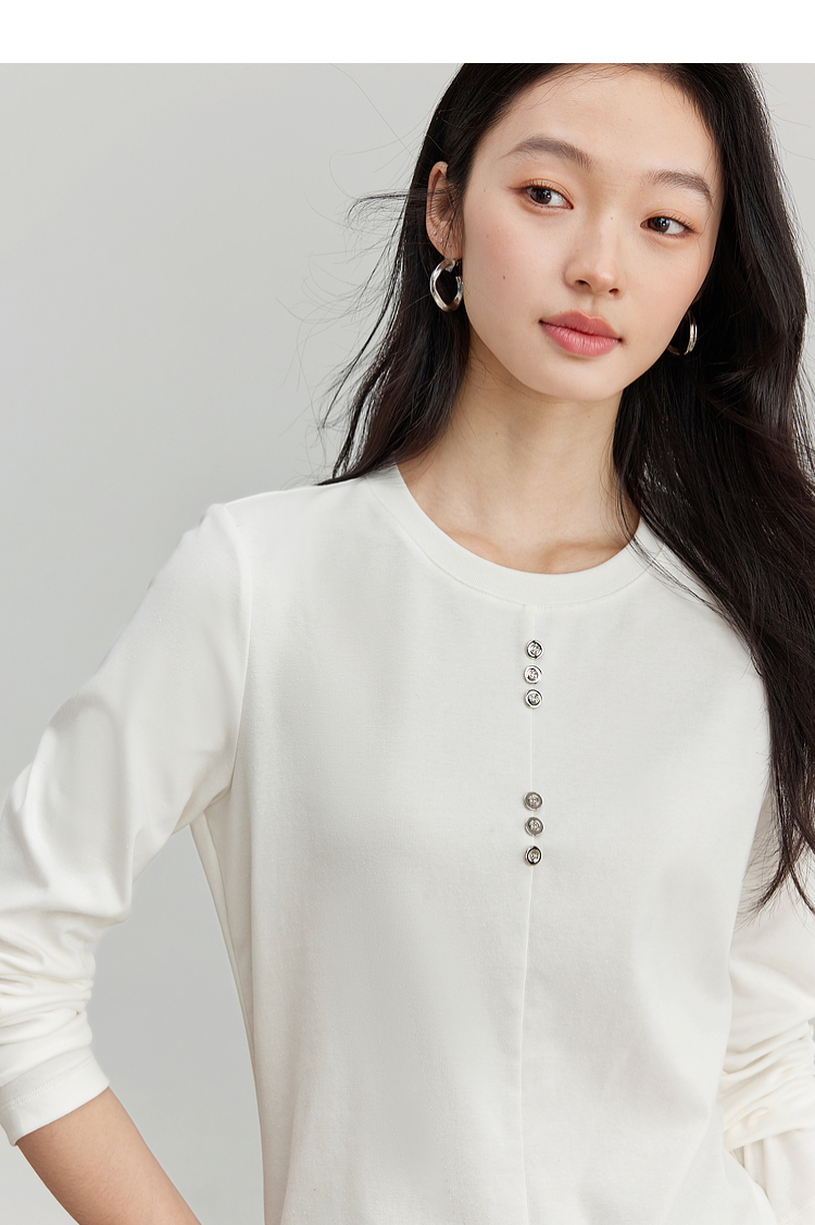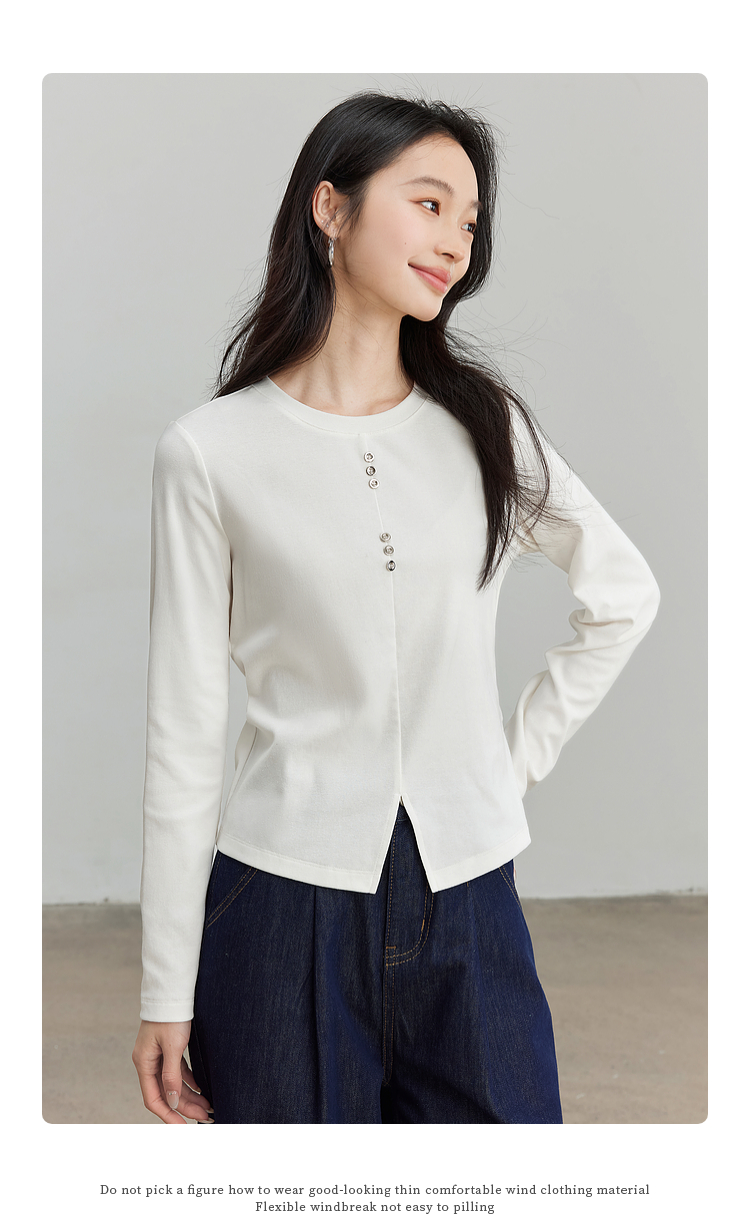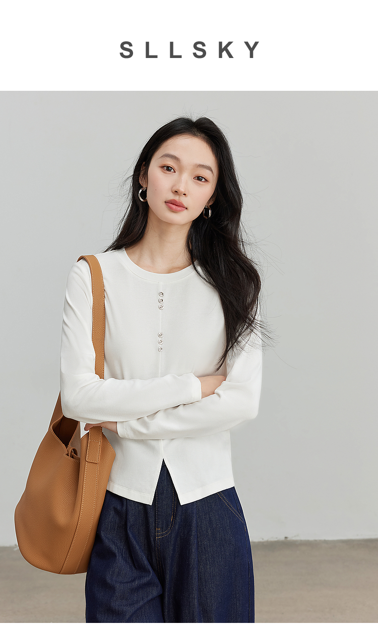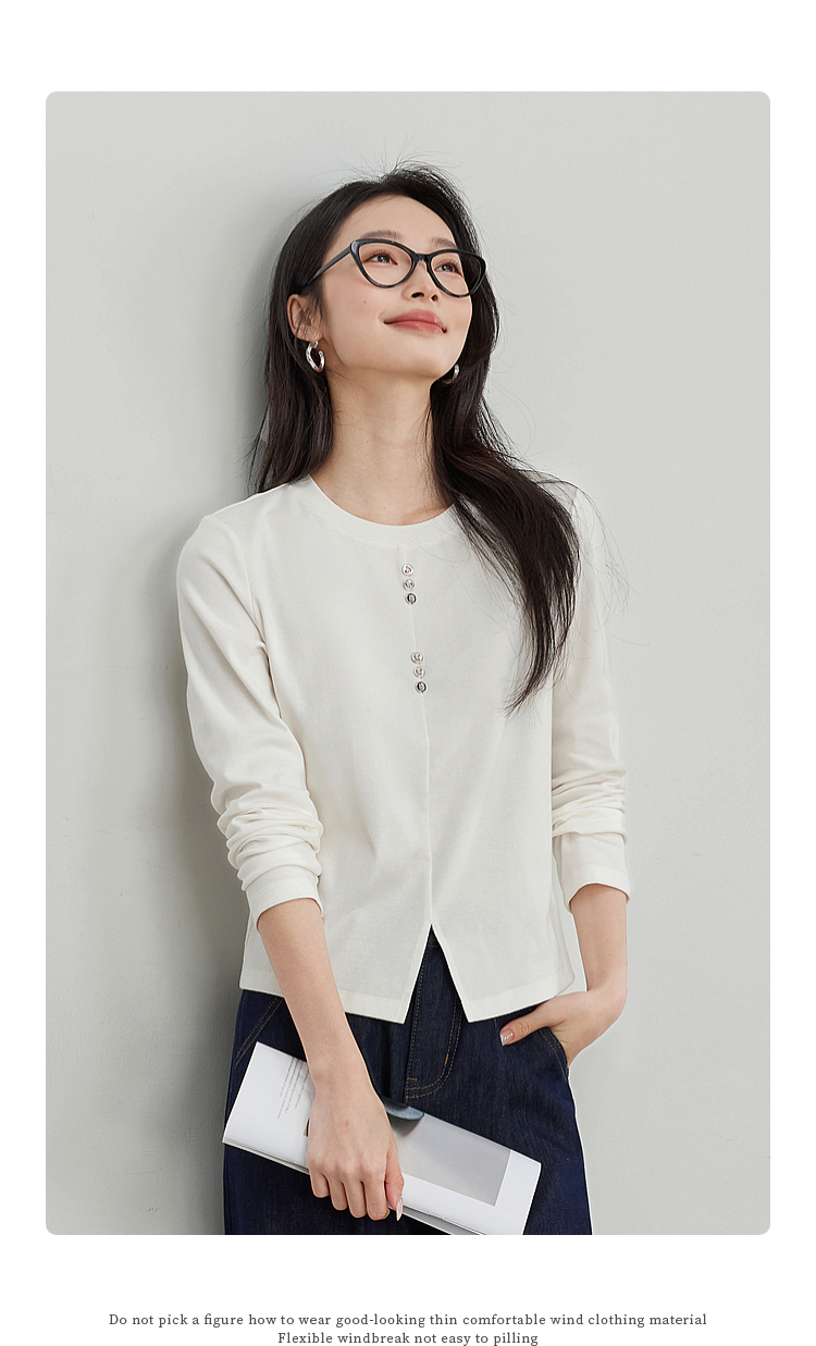 【年终特卖】熙世界设计感开叉纽扣白色t恤长袖2025春日新款圆领体恤打底衫