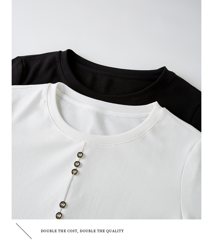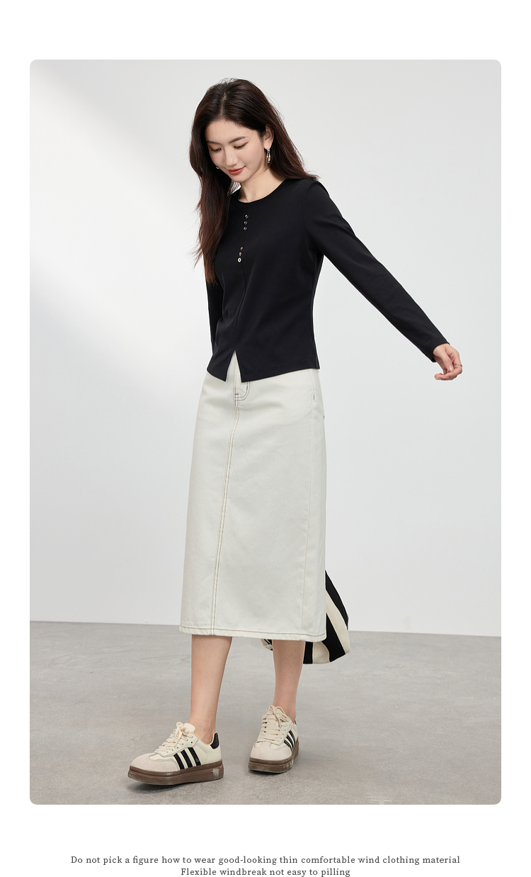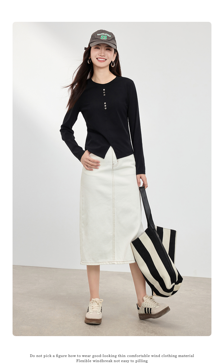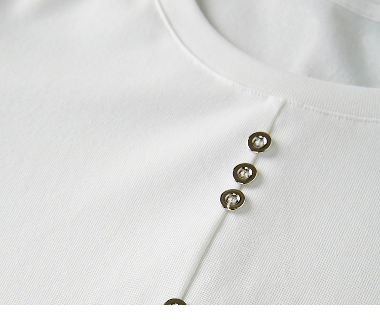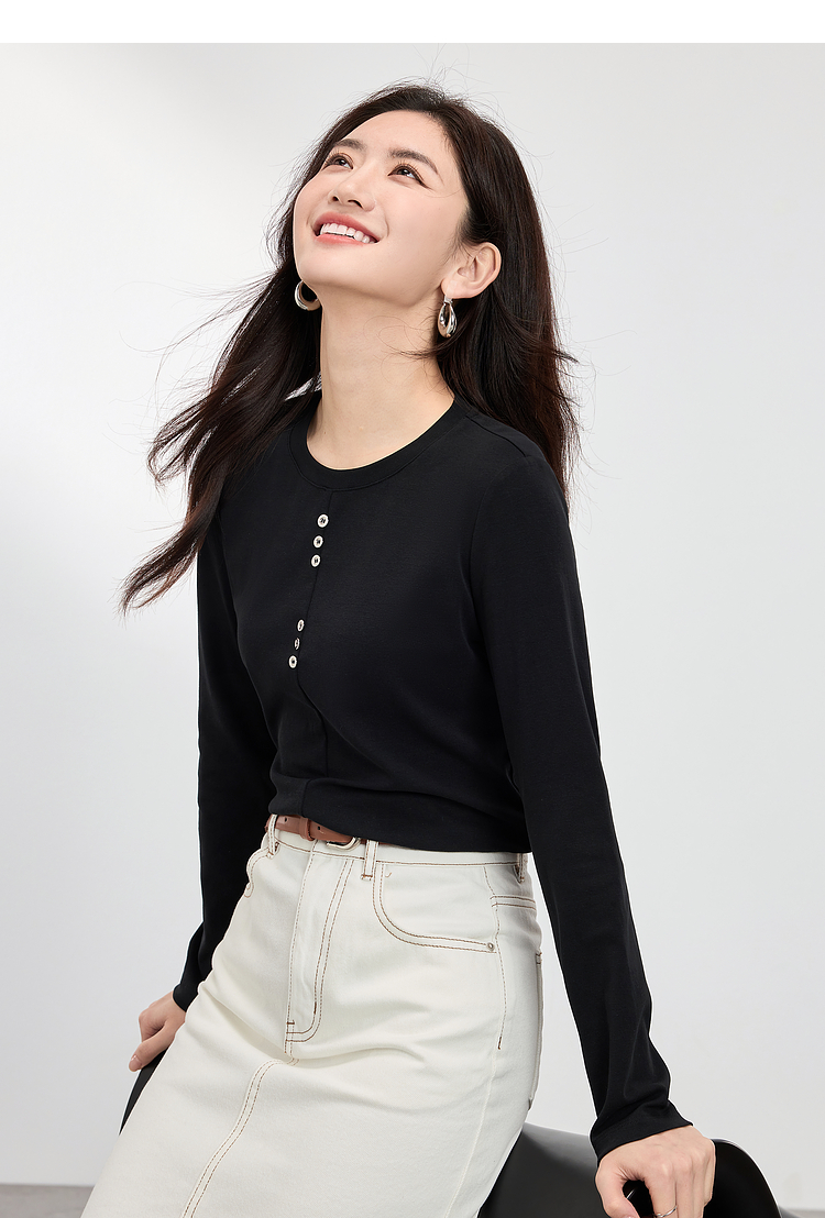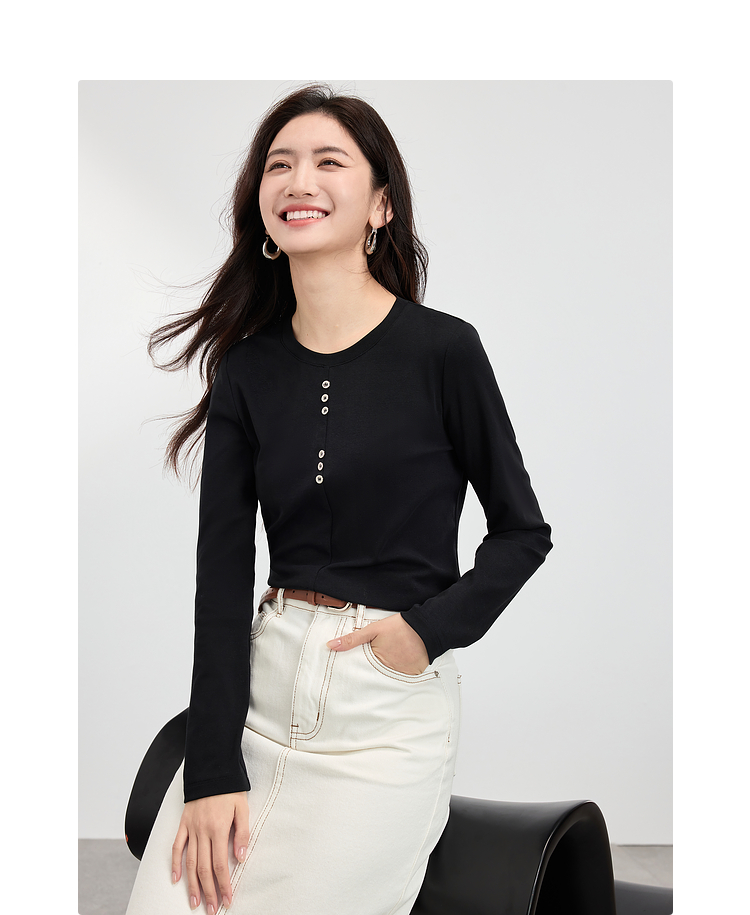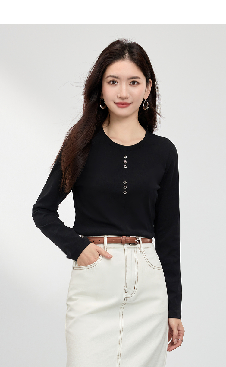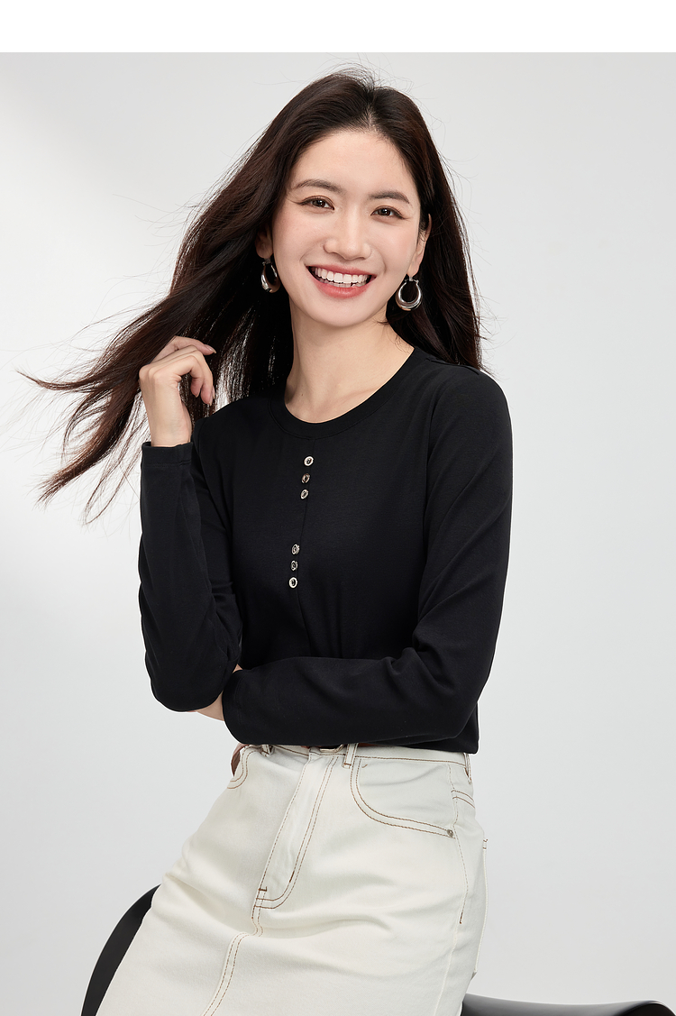 【年终特卖】熙世界设计感开叉纽扣白色t恤长袖2025春日新款圆领体恤打底衫
