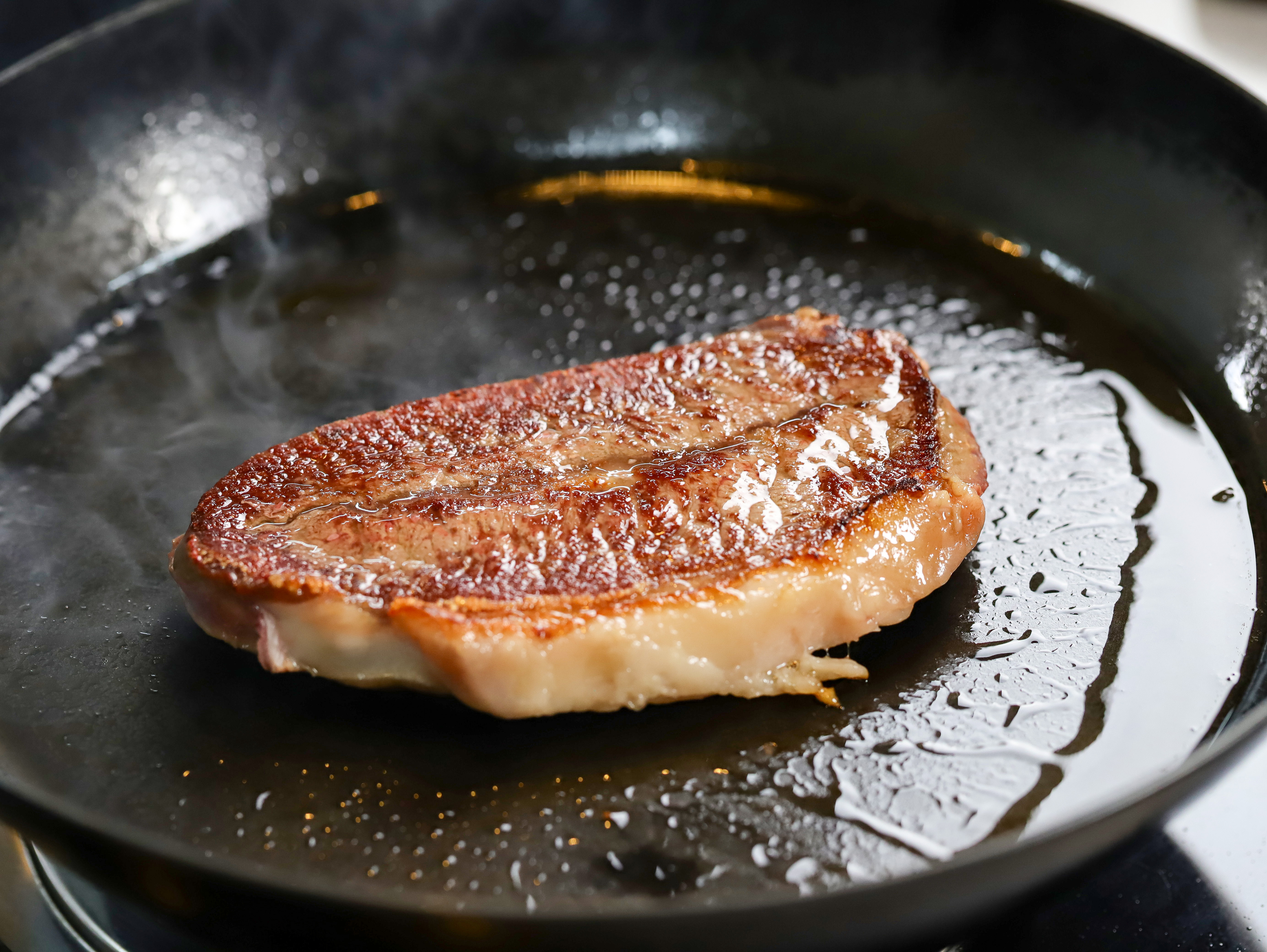 3.放入油锅,1.8cm厚度的牛排单面煎40-50秒再翻面