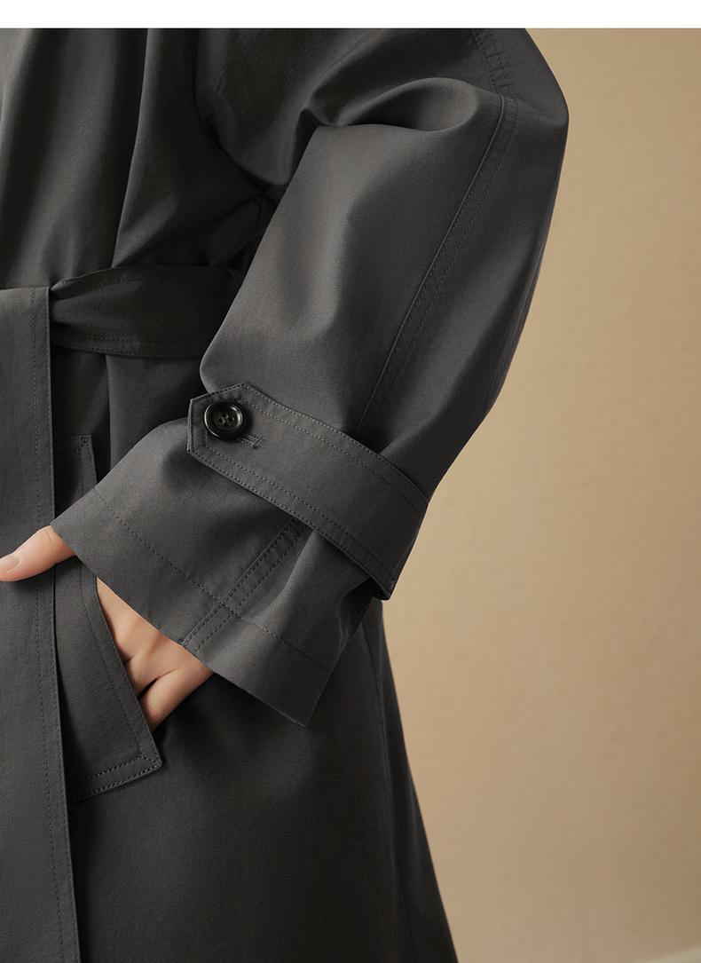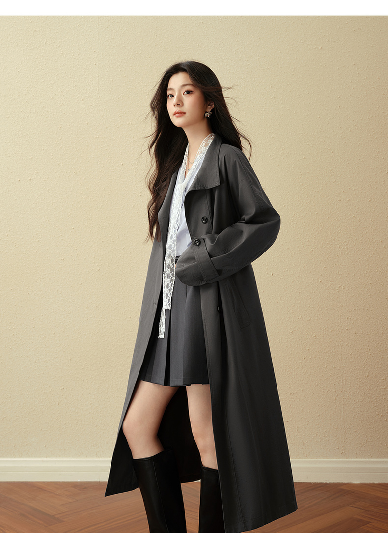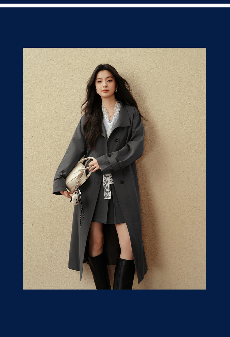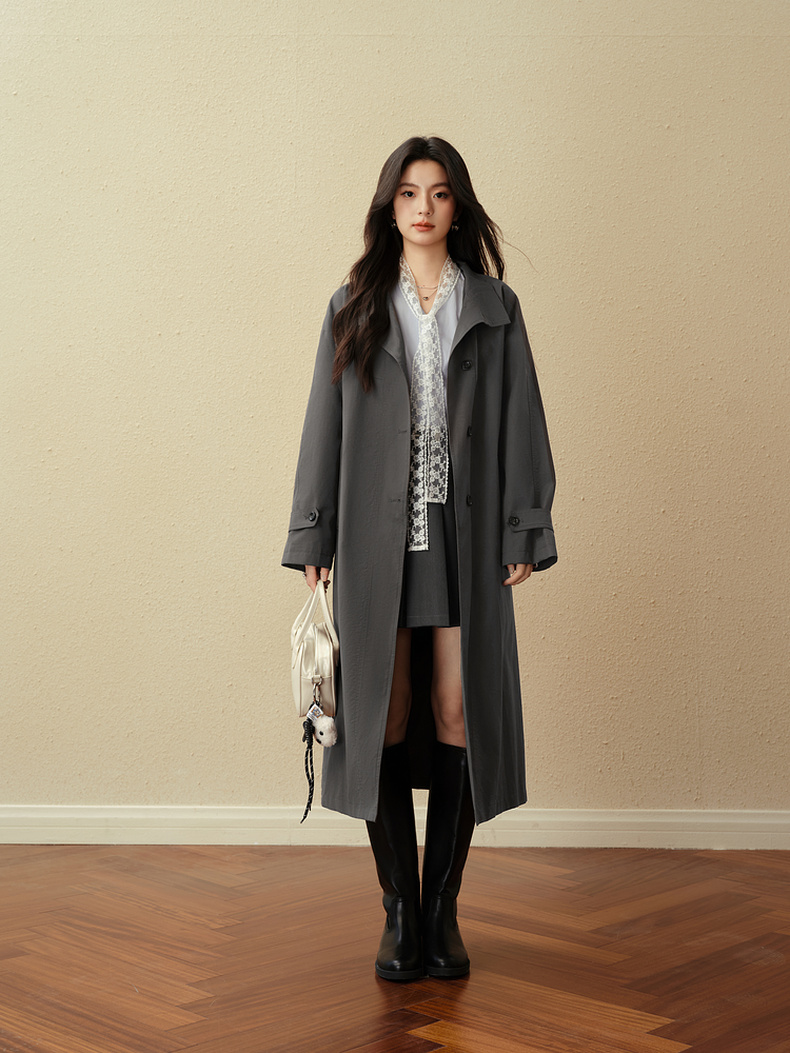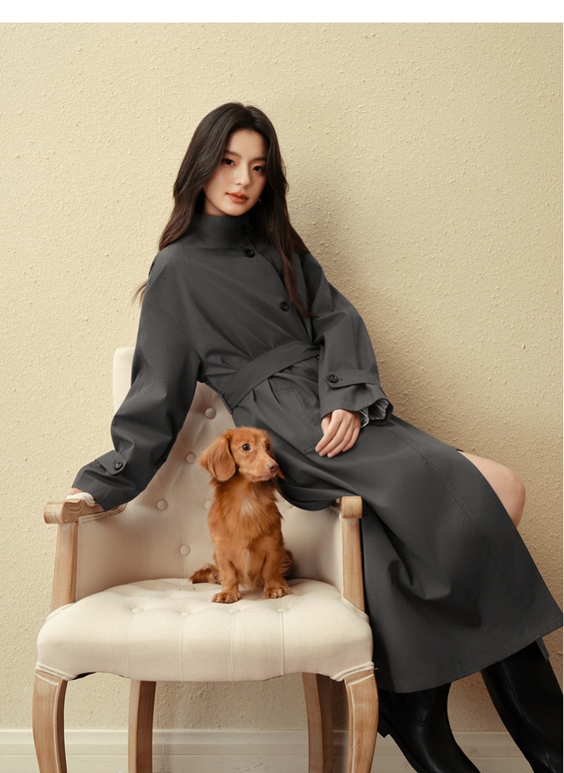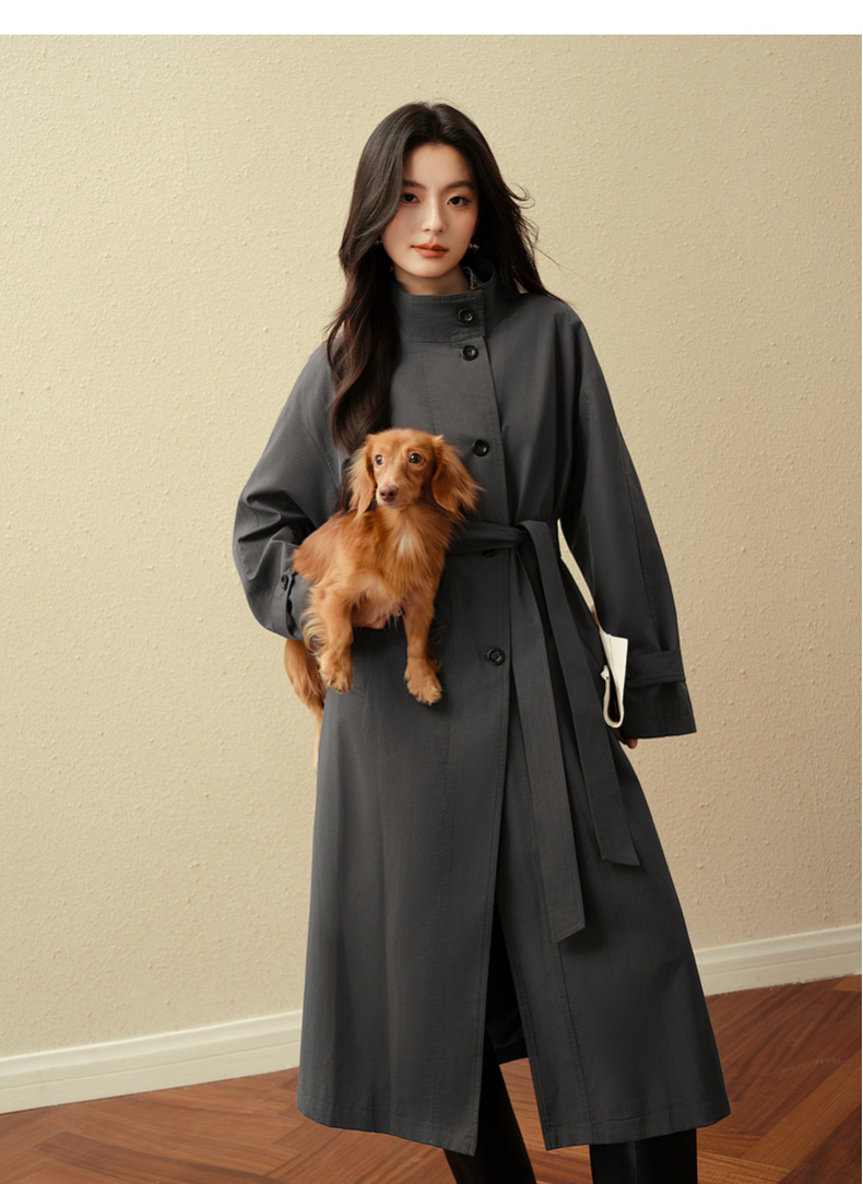 【严选】诗凡黎英伦风灰色立领系带风衣2025秋新款长款酷飒宽松通勤外套女7G7160271