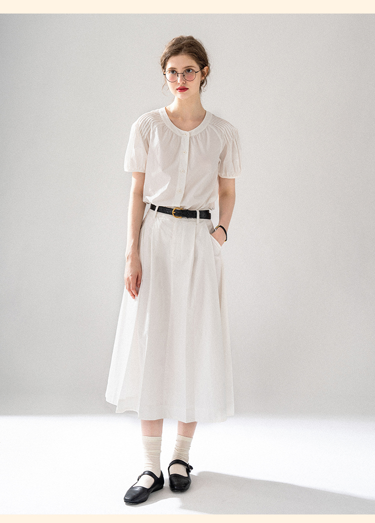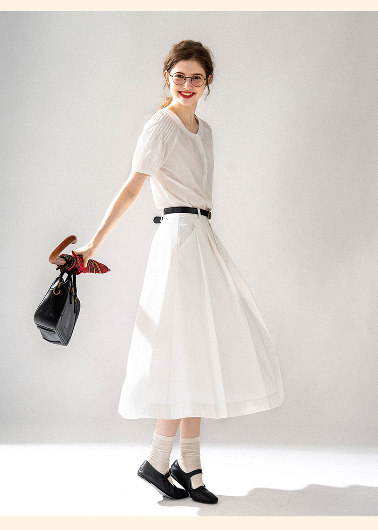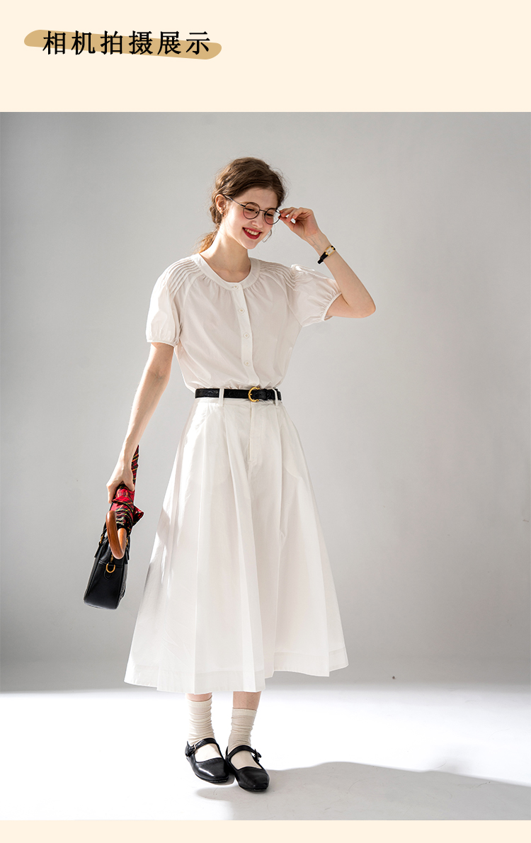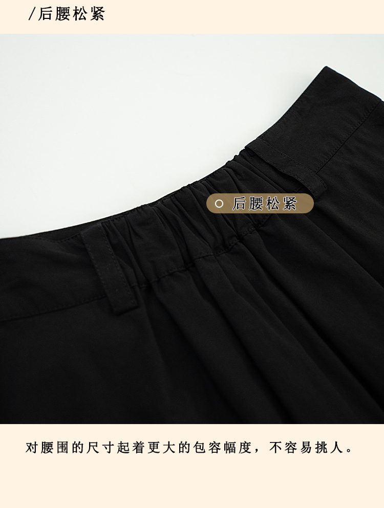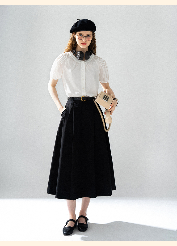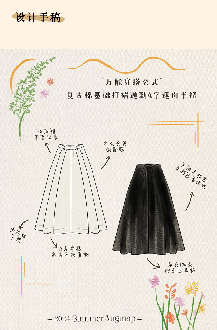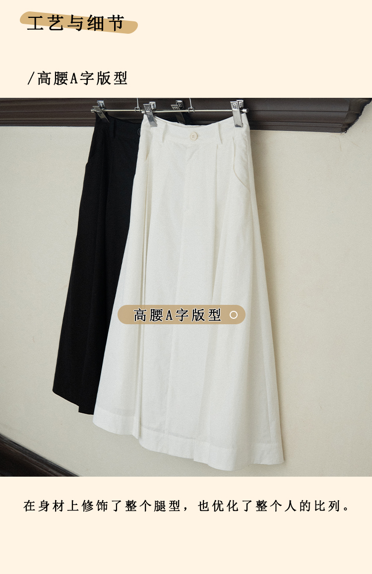 浮生八记/24A054/复古棉基础打褶通勤A字遮肉半裙
