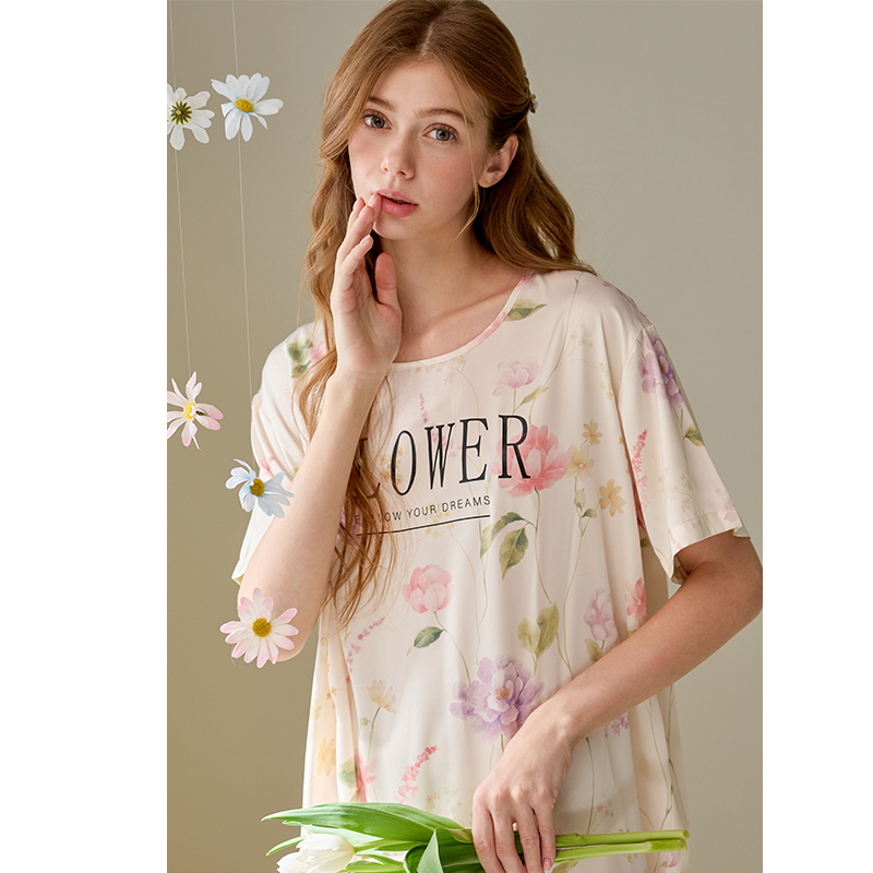 芬腾睡裙女春季简约短袖睡衣裙夏季冰丝薄款植物花卉加大码家居服