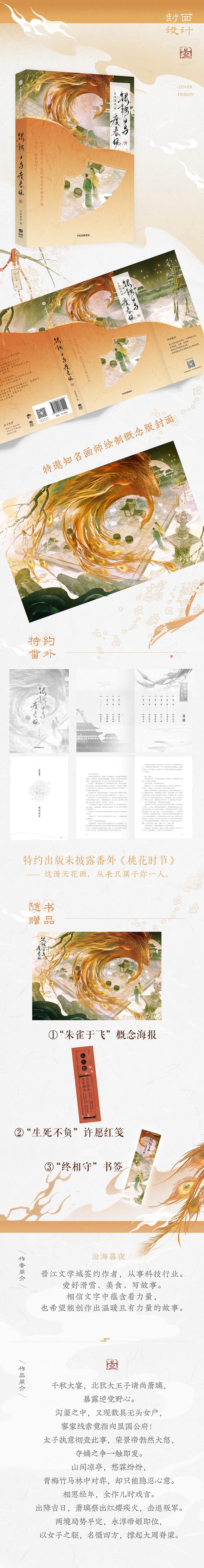 "① 古色古香封面设计,特别绘制“朱雀于飞”概念图,结合书中许愿红笺重要意向进行设计,突出相知相守的萧璃与裴晏。 ②随书收录未披露特约出版番外《桃花时节》,看萧璃与裴晏约定相伴终生。 ③随书3款精美赠品:概念海报、许愿红笺、封面同款书签。"