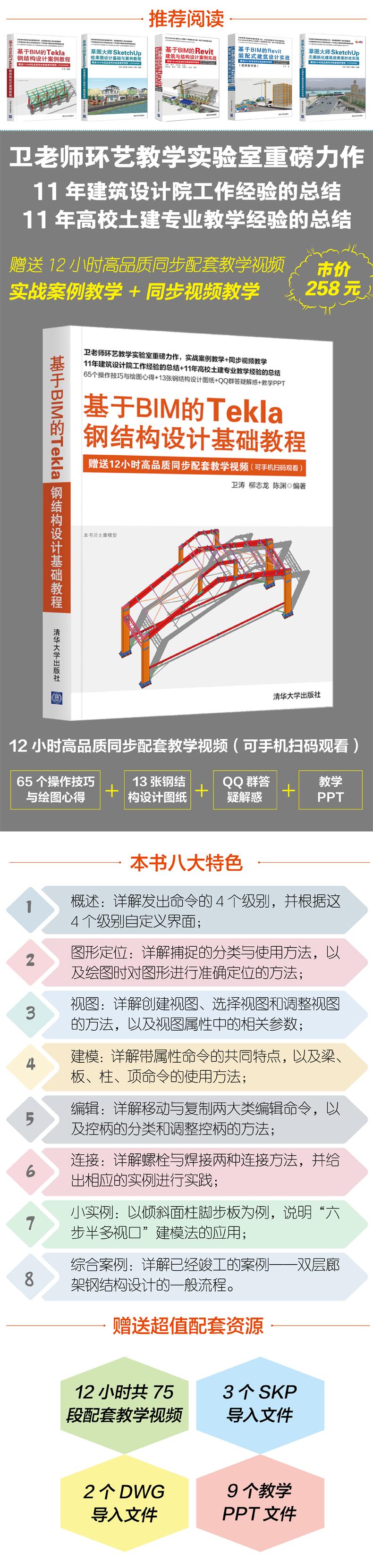 本书是一本全面介绍Tekla基础知识与实际应用的技术图书,针对零基础的读者而编写,可以帮助他们快速入门并系统掌握Tekla的常用技能。作者为本书专门录制了大量的高品质教学视频,以帮助读者更加高效地学习。读者可以按照本书前言中的说明获取这些教学视频和其他配套教学资源,也可以直接使用手机扫描二维码在线观看教学视频。 本书共10章:首先从Tekla的发展讲起,逐步介绍在使用Tekla时捕捉、辅助定位、视图、建模、编辑、螺栓连接、焊接等相关知识;然后介绍在建模完成后使用自定义组件管理模型的方法;接着介绍使用六步半多视口建模的方法,并给出一个小实例展示如何使用该方法建立一个模型;最后以武汉军运会期间的一个双层景观廊架为案例,应用前面章节介绍的大部分基础知识,带领读者动手实践。 本书内容翔实,讲解通俗易懂,特别适合结构设计、建筑设计、钢结构设计等相关从业人员阅读,也可供房地产开发、建筑施工、工程造价和......