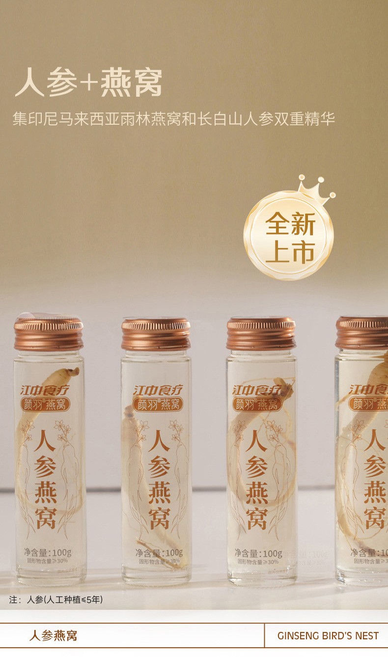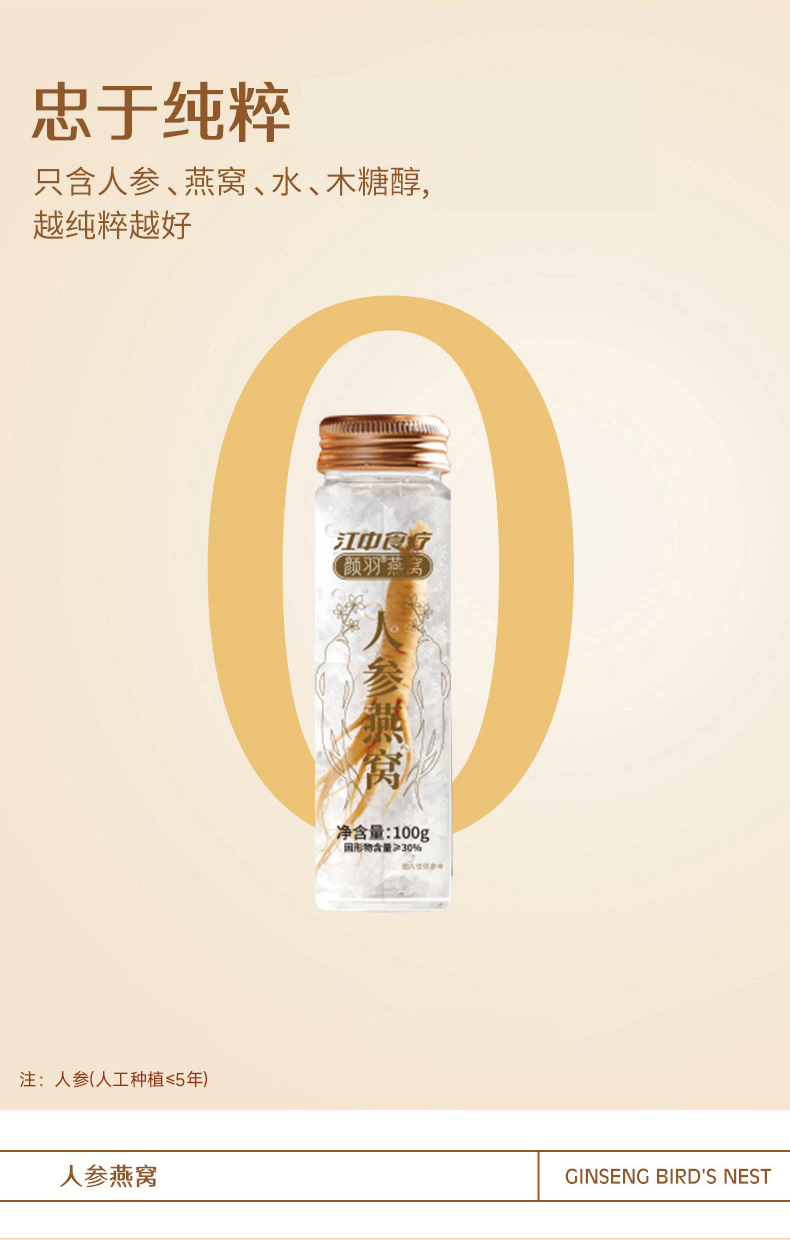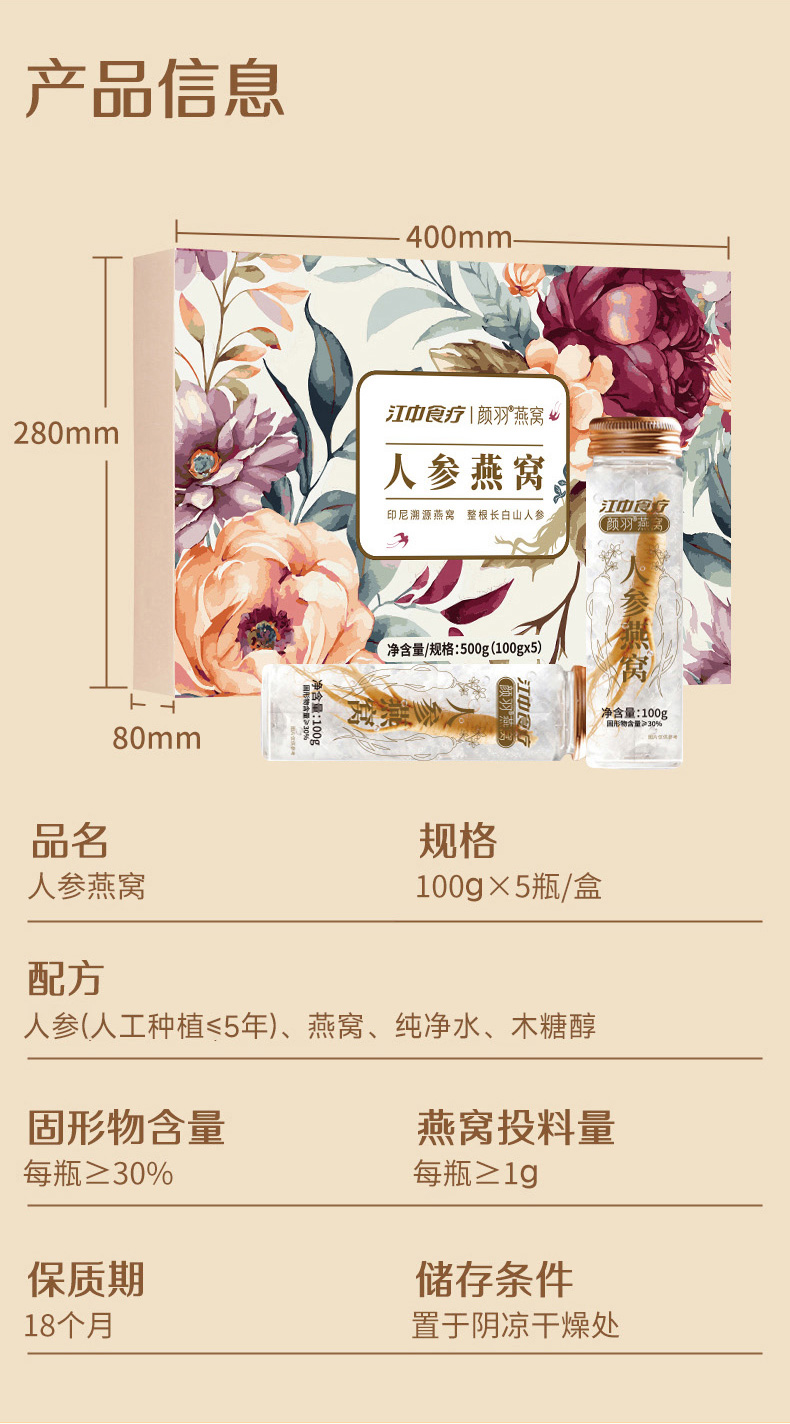 【人参燕窝·1克干燕窝】江中食疗颜羽人参燕窝 100g*5瓶 滋补营养品进口金丝燕盏礼盒 保质期18个月【京东/顺丰快递】