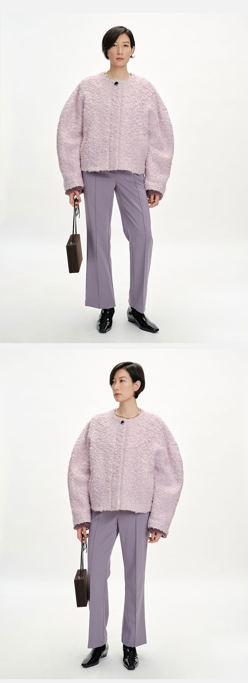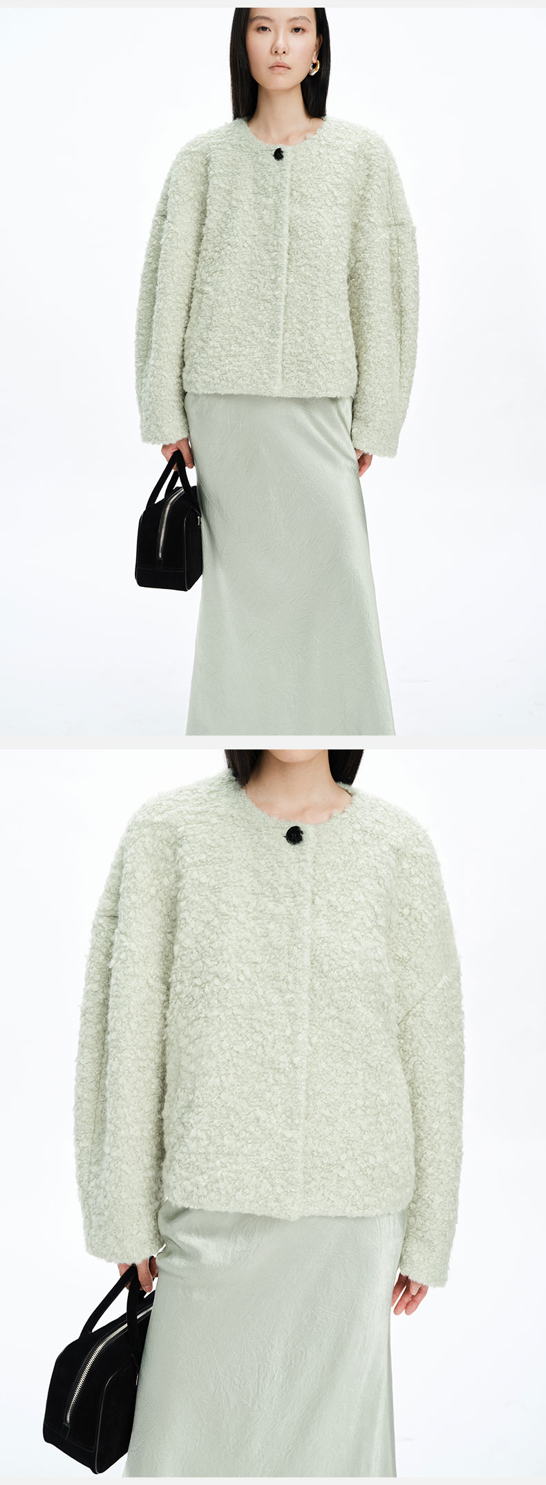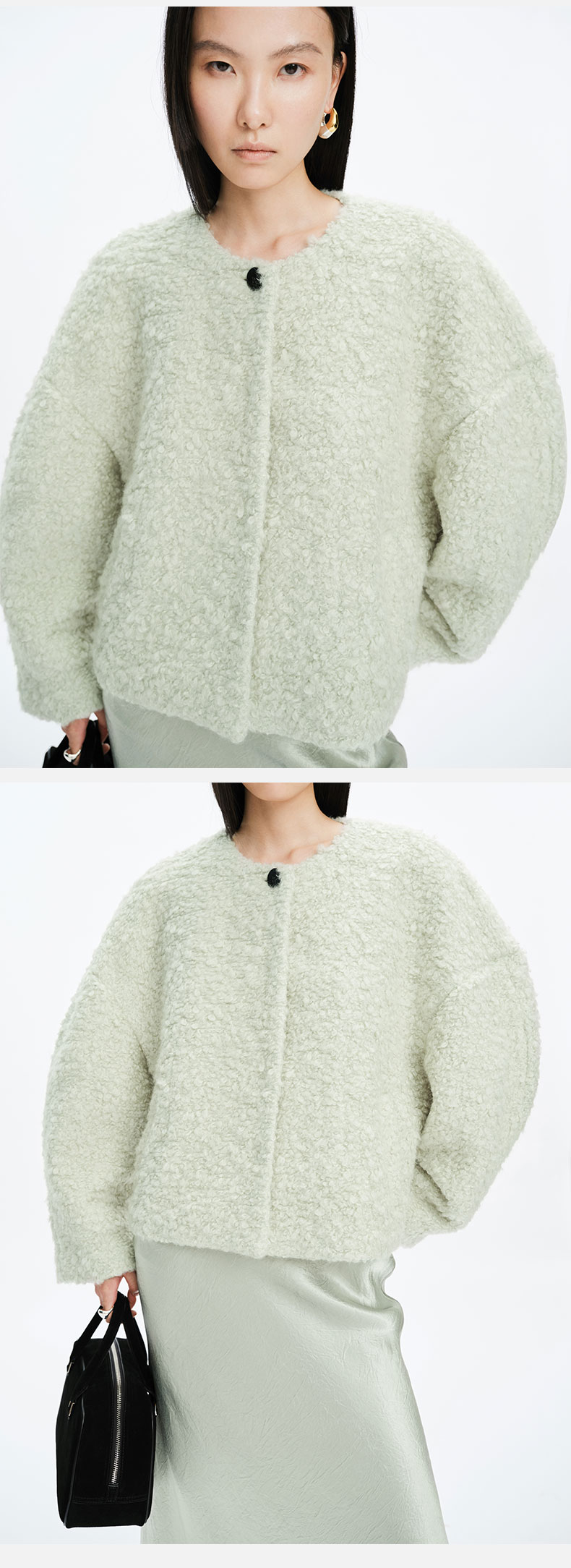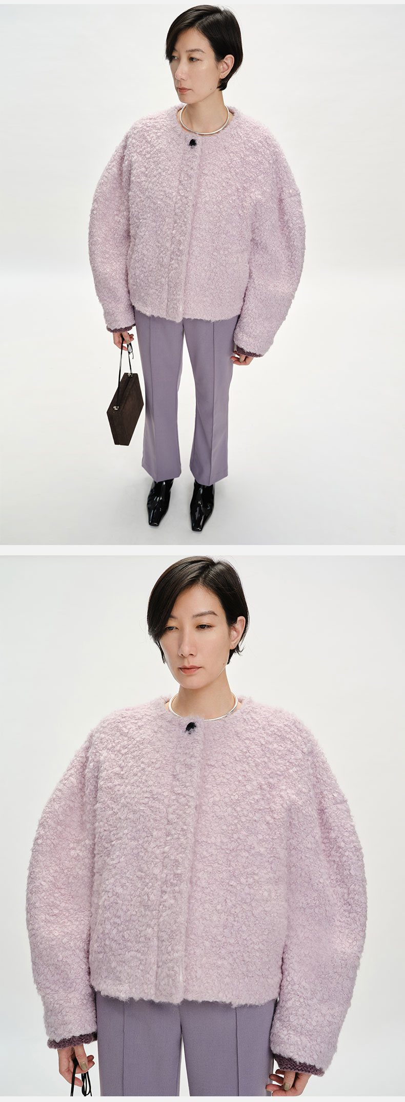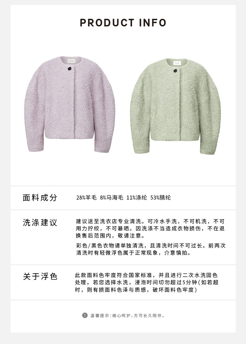 HIDEMI 圈圈马海毛廓形袖极简短大衣 水杉绿/浪漫紫