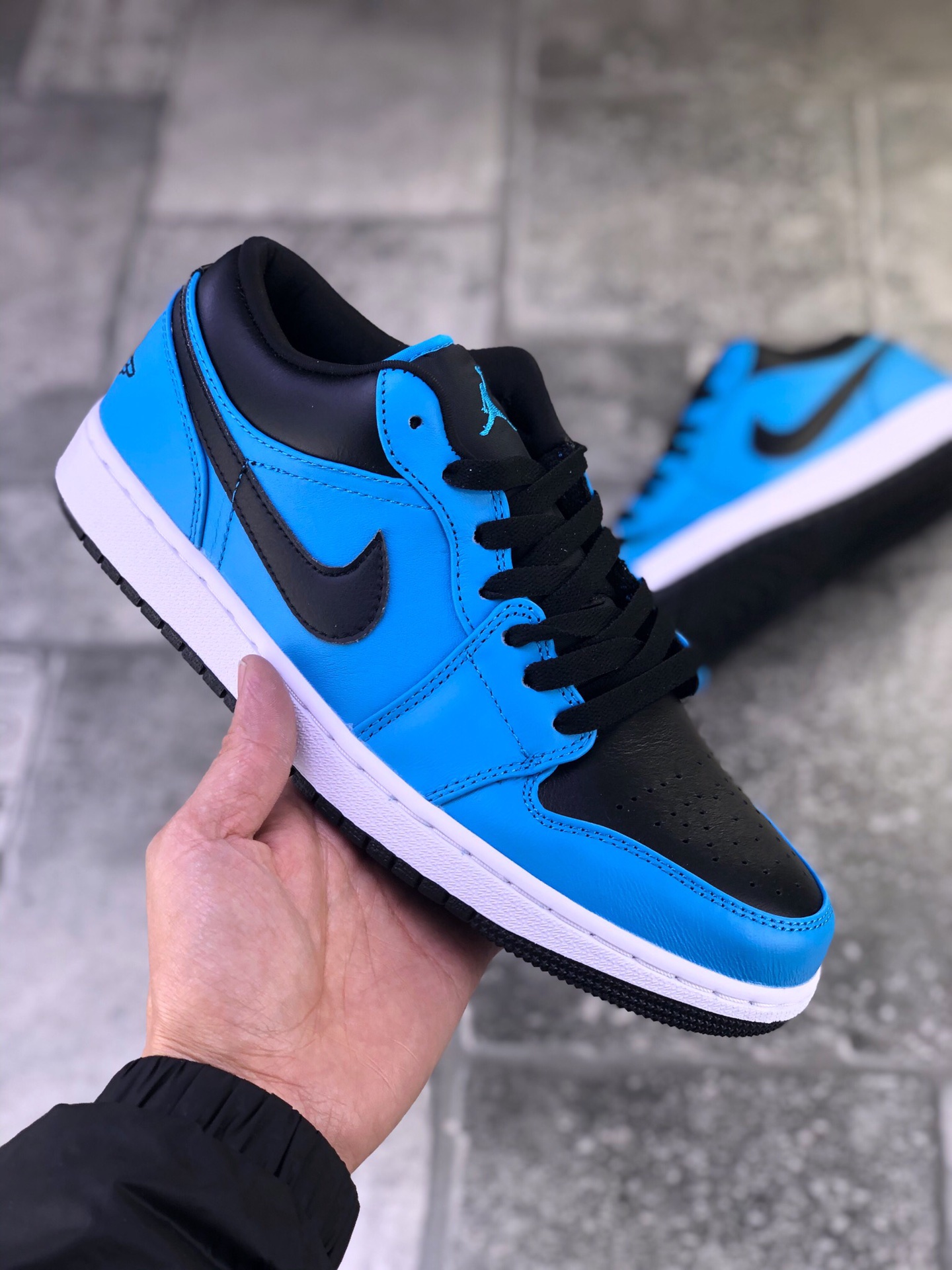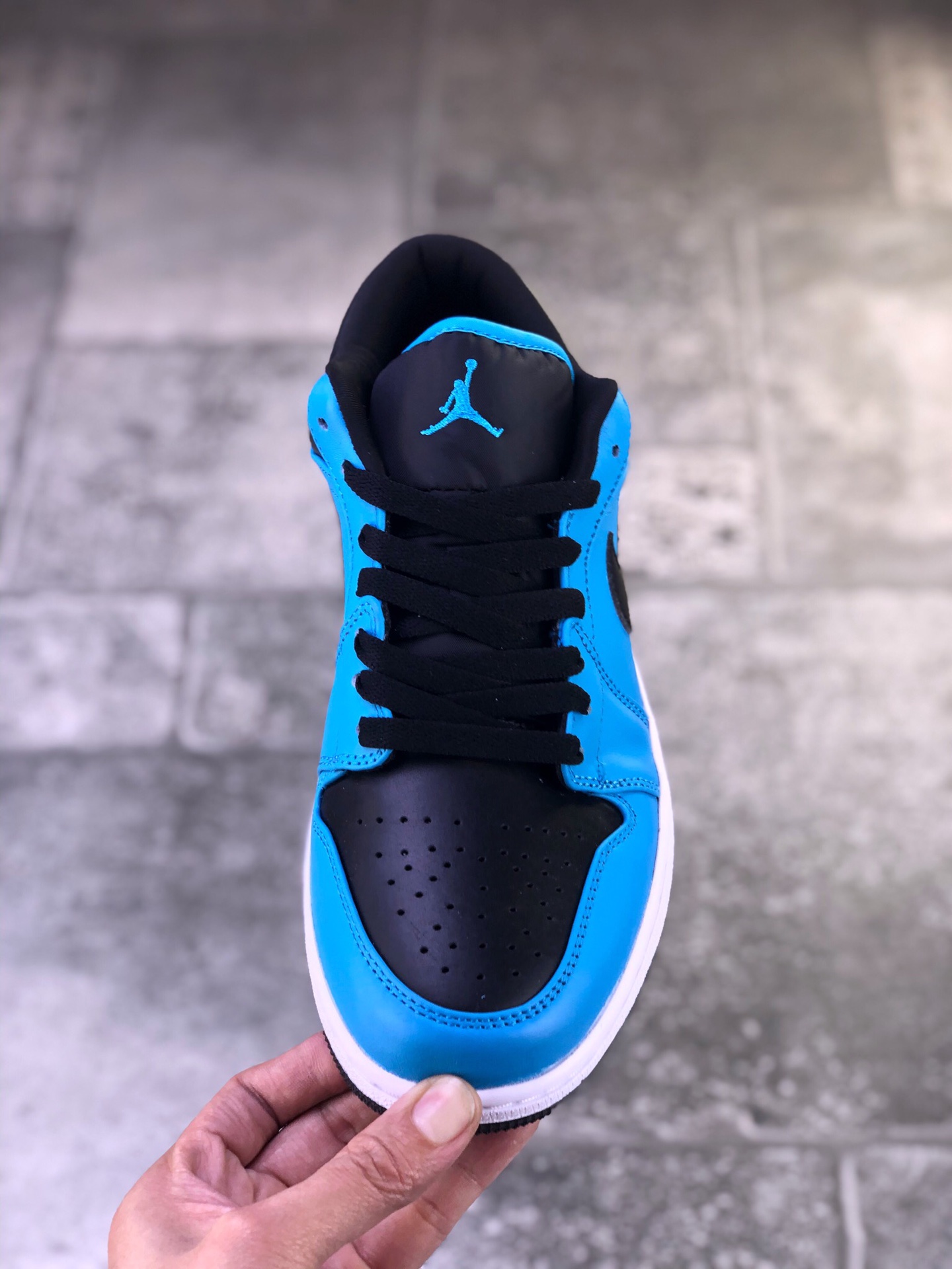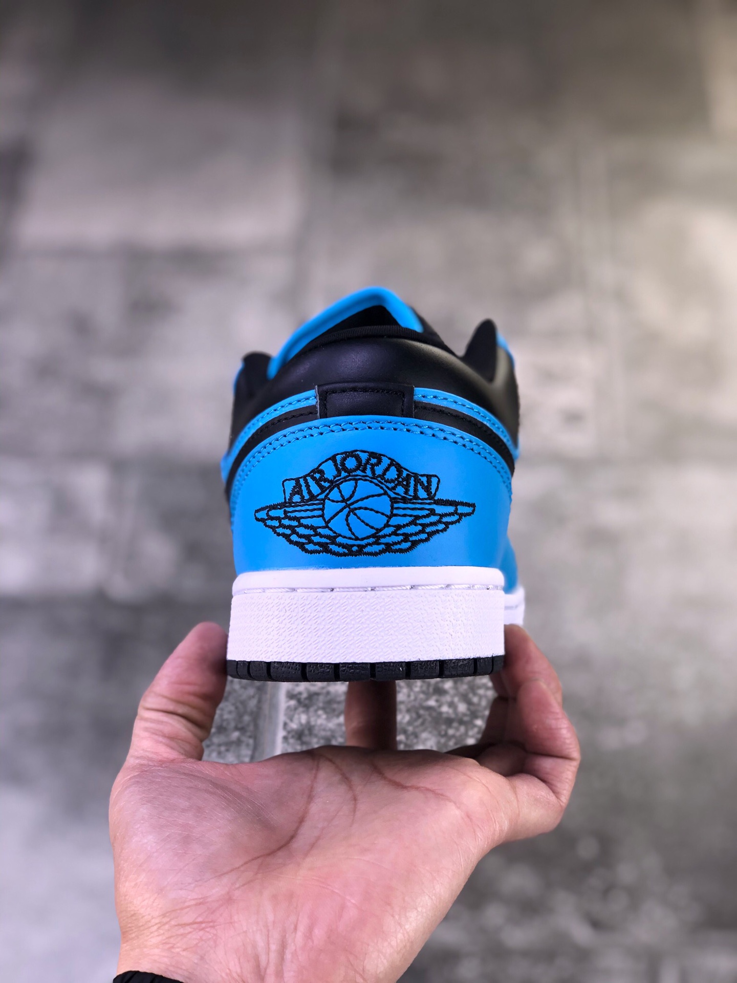 Air Jordan 1 Low “University Blue” 鞋款采用黑蓝撞色设计,北卡蓝配色皮质面料打造鞋身
