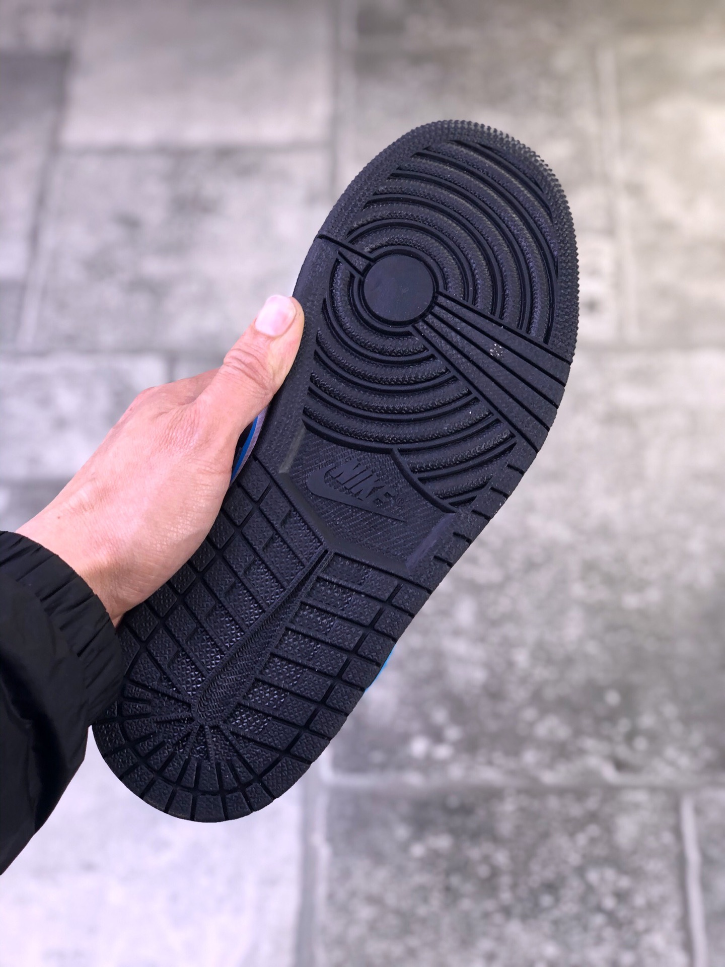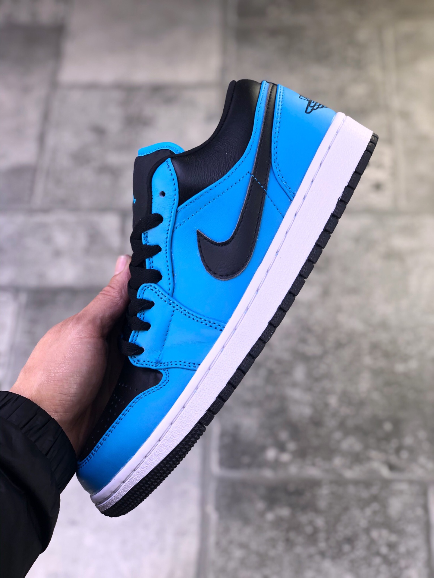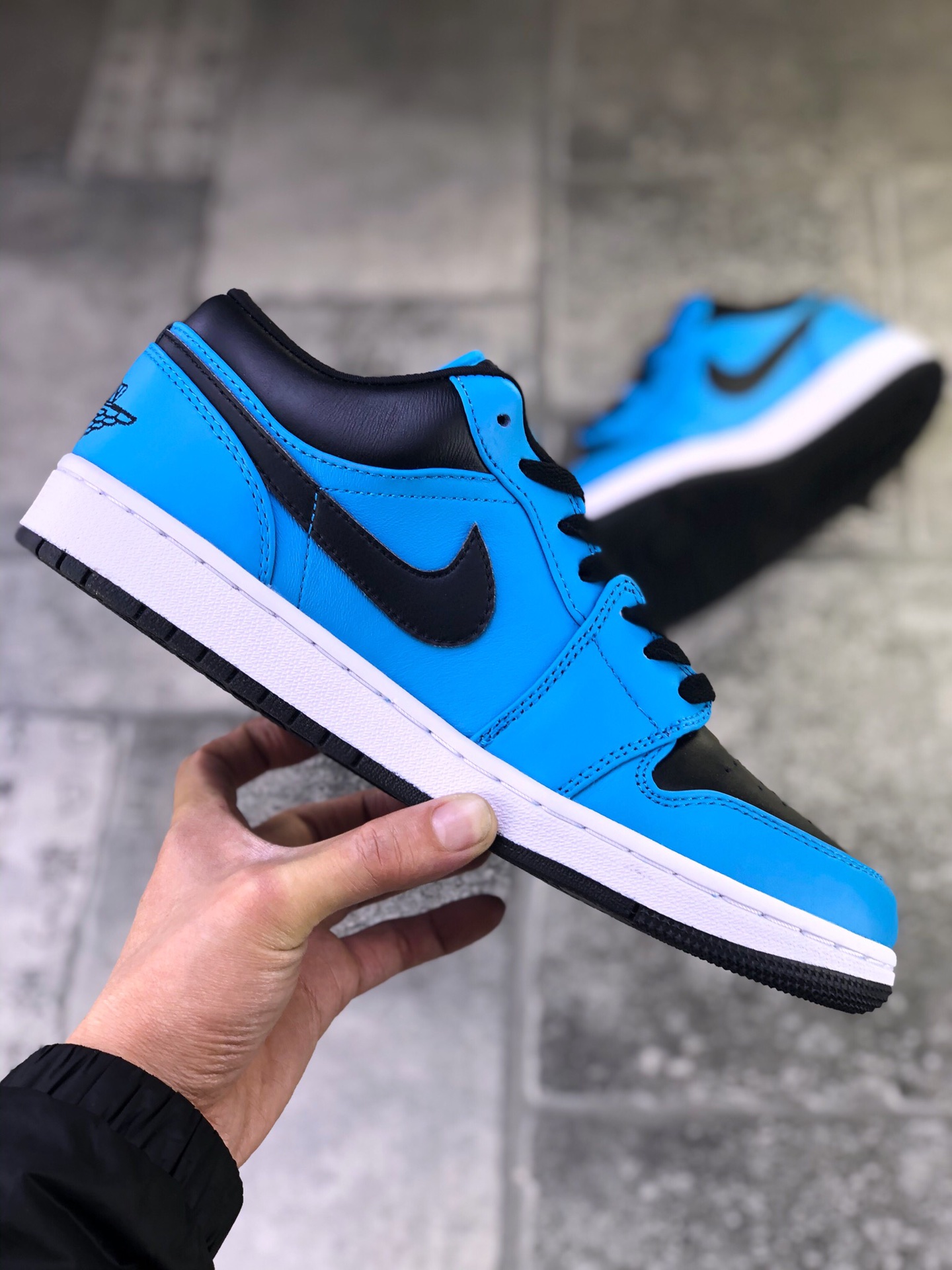 Air Jordan 1 Low “University Blue” 鞋款采用黑蓝撞色设计,北卡蓝配色皮质面料打造鞋身