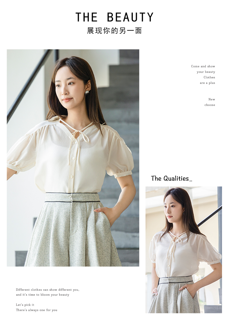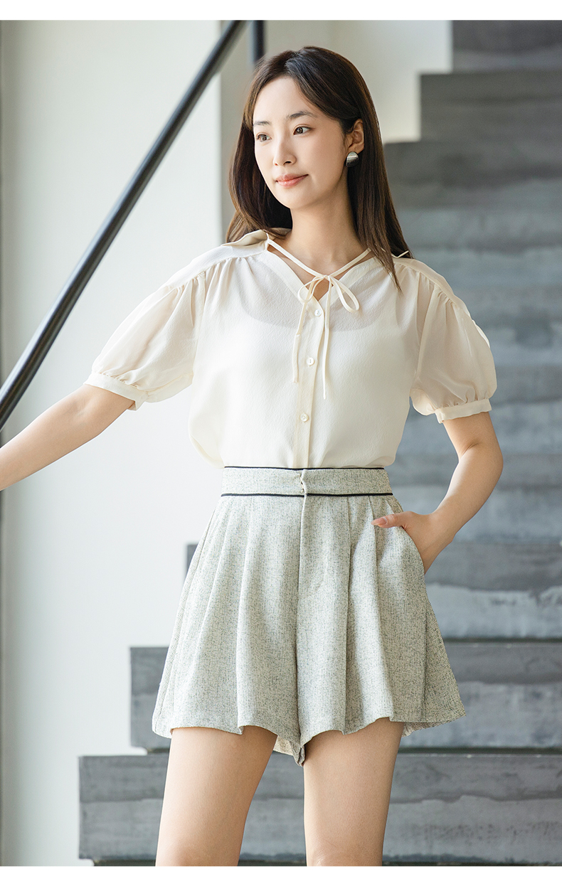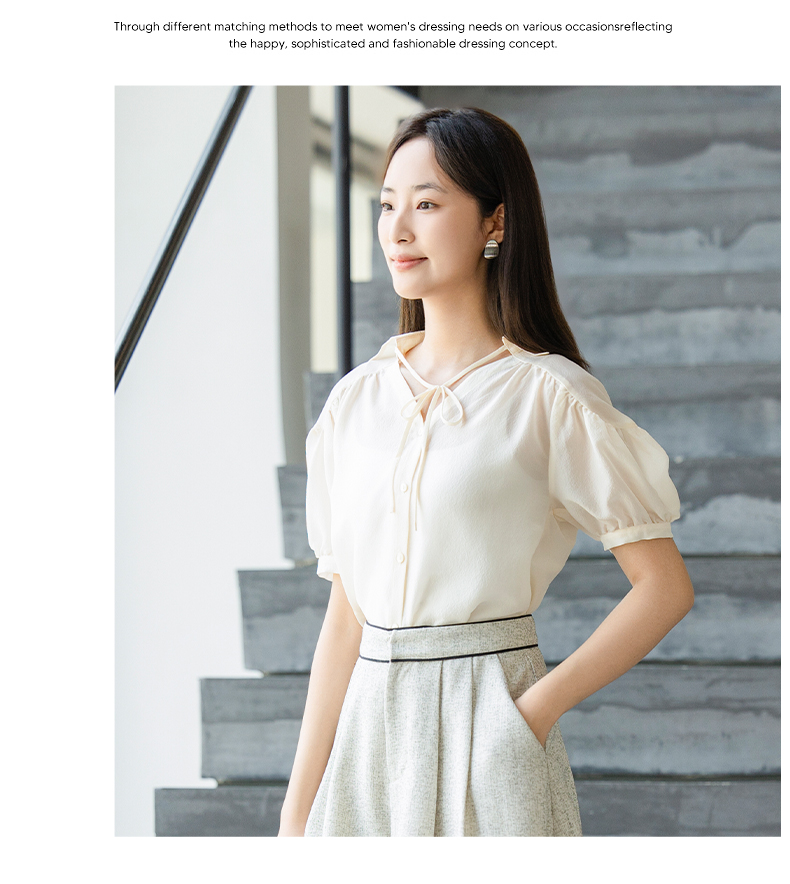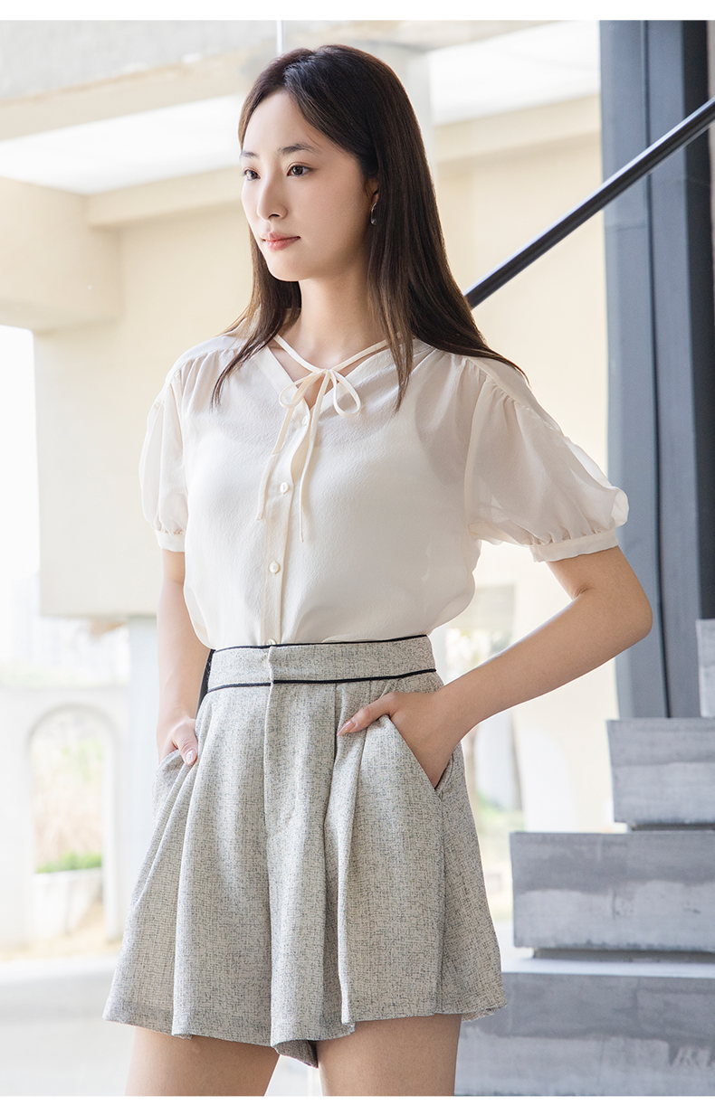 oldcolour夏季新款别致系系带法式短袖雪纺衬衫女P25011550