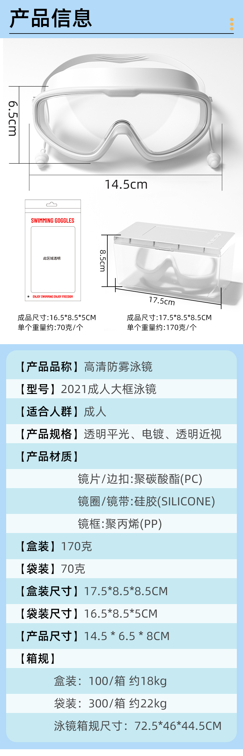 【全景视野高清透视泳镜】成人大框泳镜高清防水防雾男女游泳眼镜连体耳塞硅胶儿童护目。ry