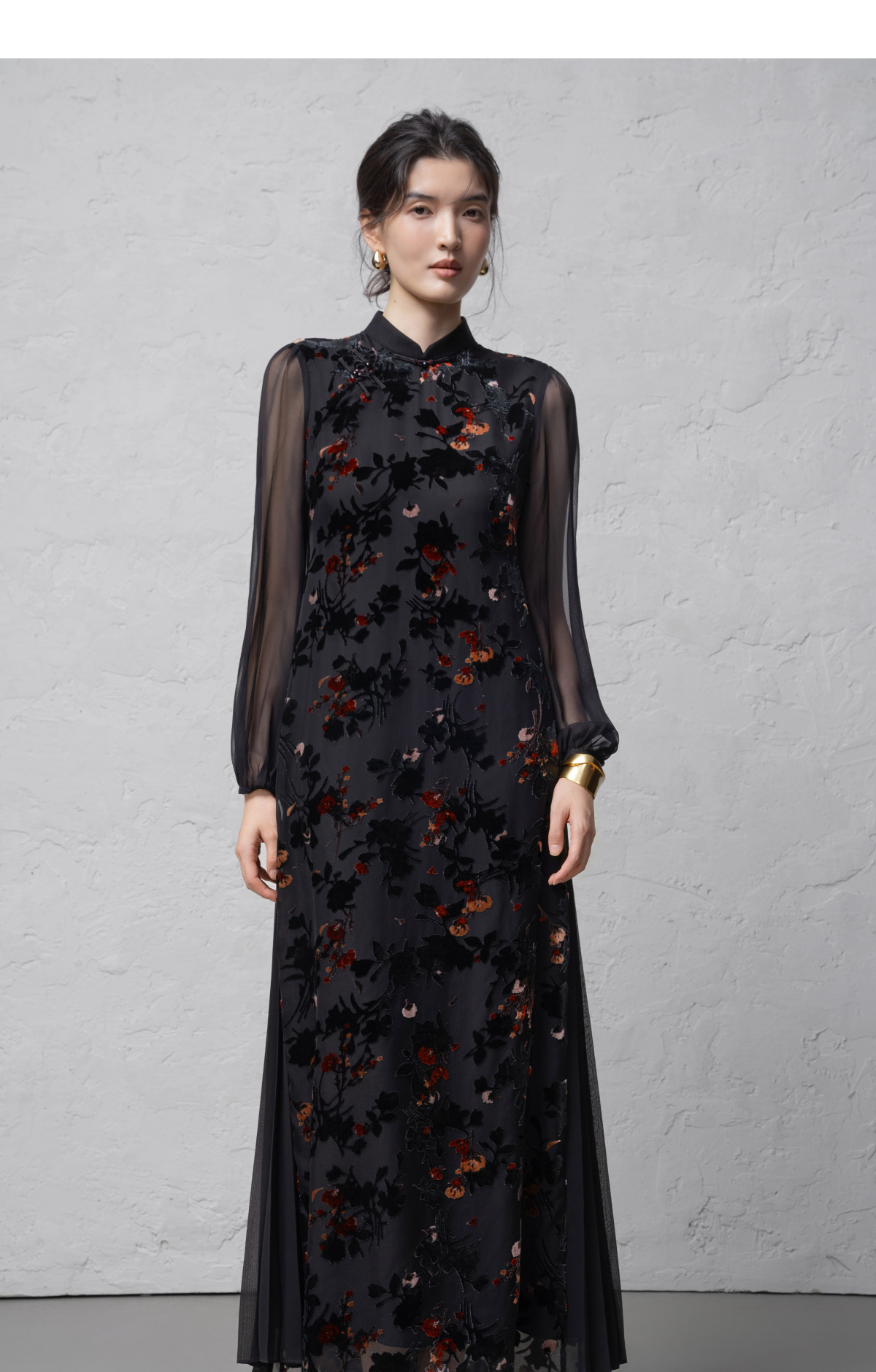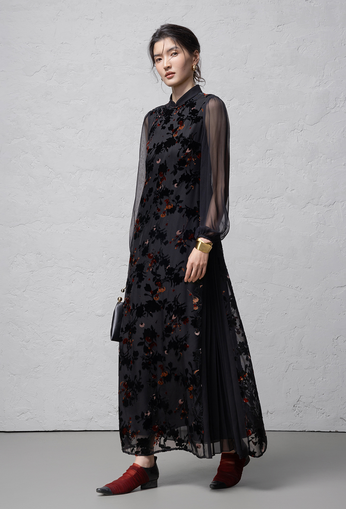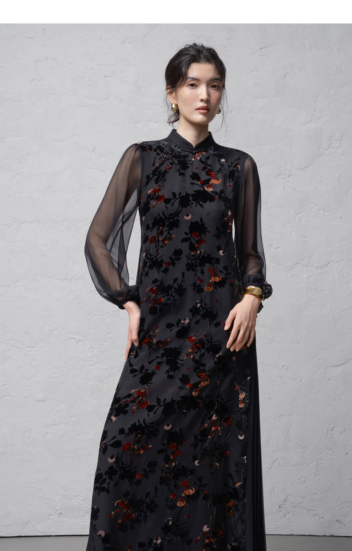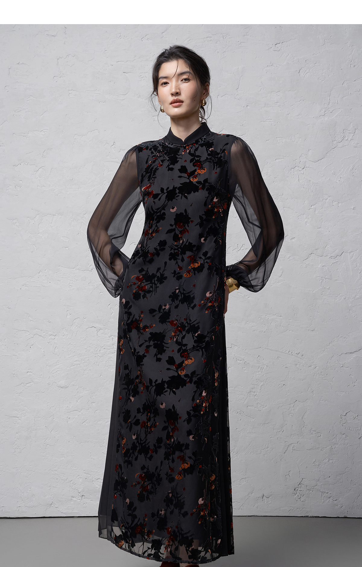 【林栖设计小店】(现货)植绒提花改良旗袍拼桑蚕丝飞片国风轻中式2026早春新款连衣裙1961125