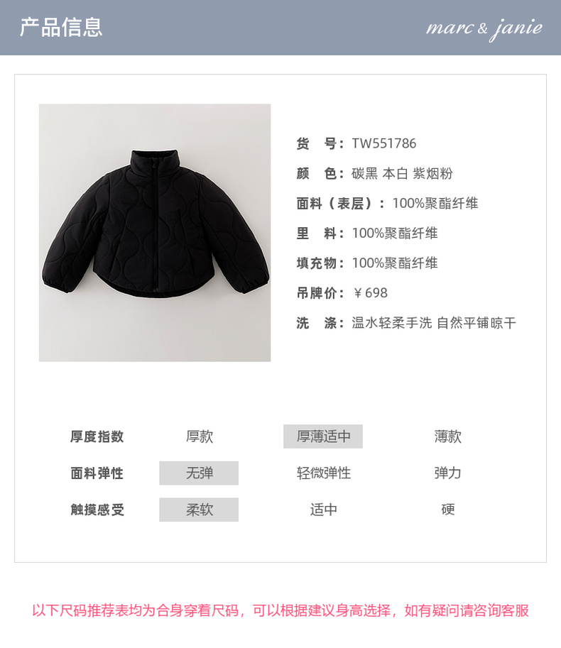 【无氟防泼水】马克珍妮女童轻盈舒暖夹棉运动外套秋冬新款551786