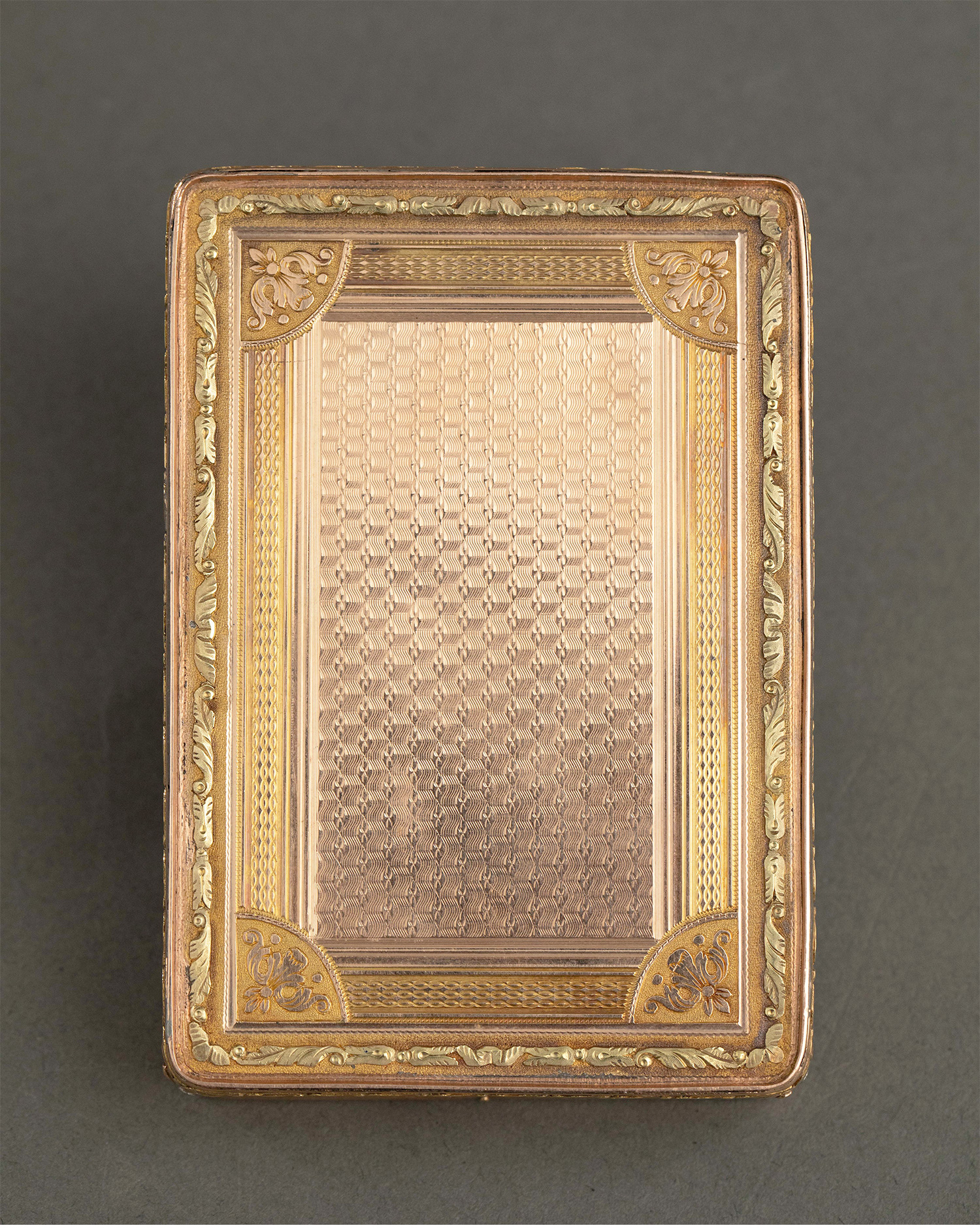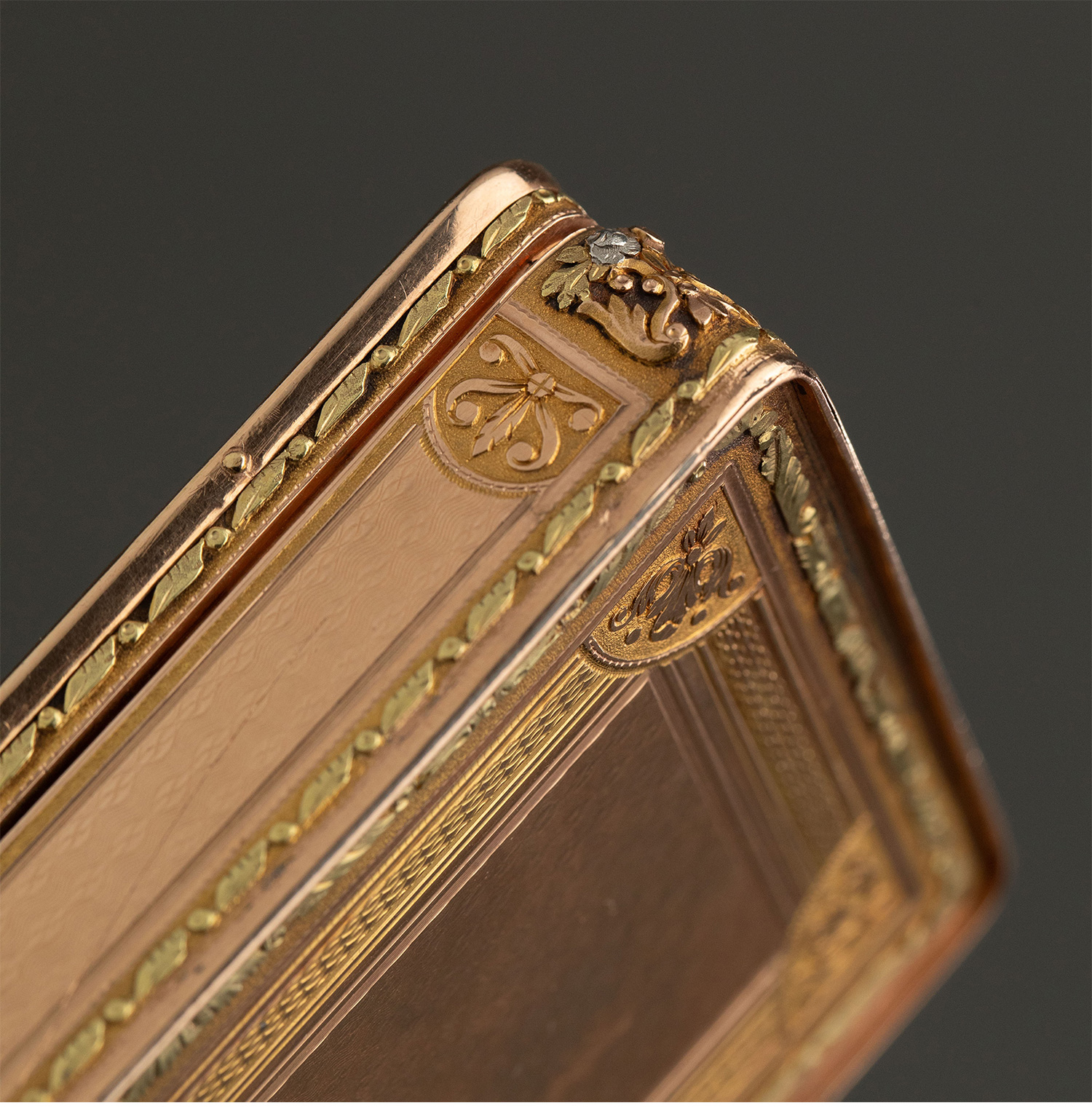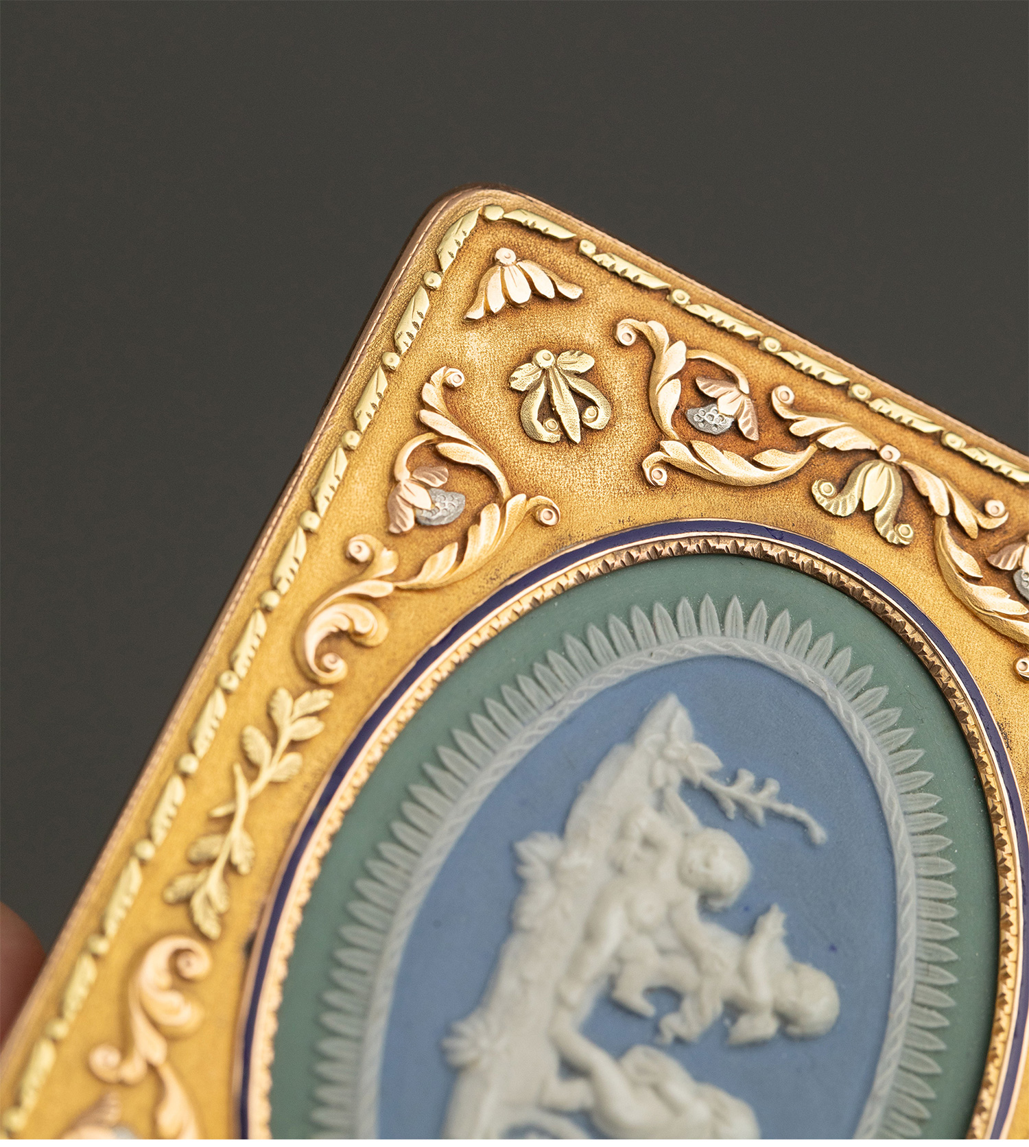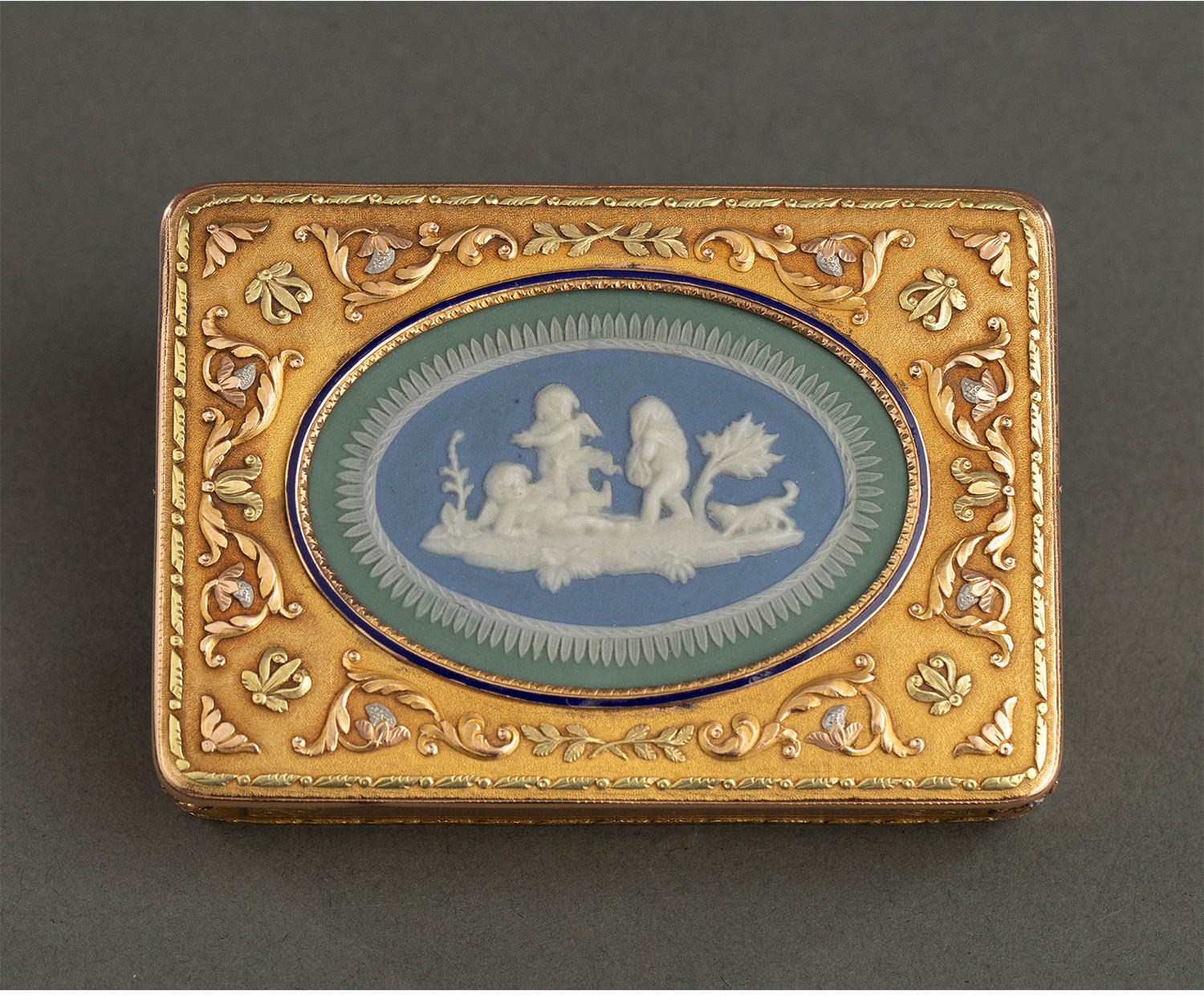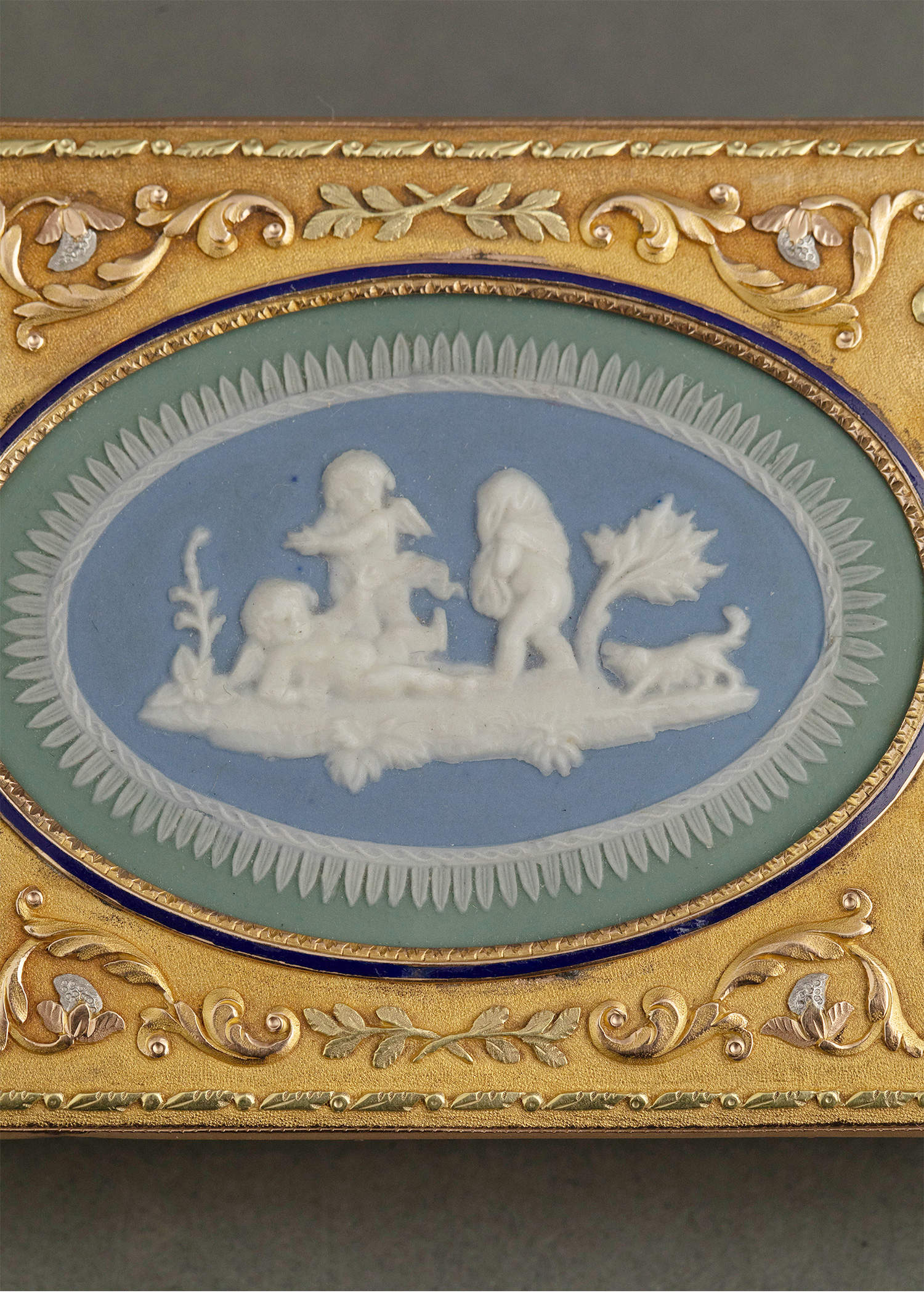 19世纪德国出品小天使主题韦奇伍德风陶瓷浮雕装饰花叶纹18K三色彩金精雕嵌珐琅鼻烟盒