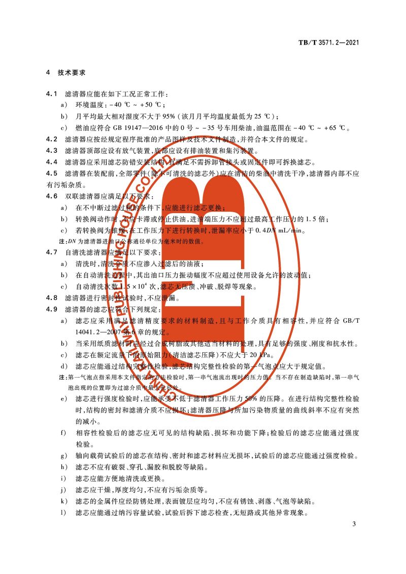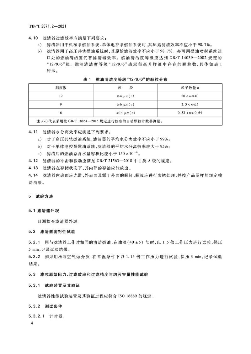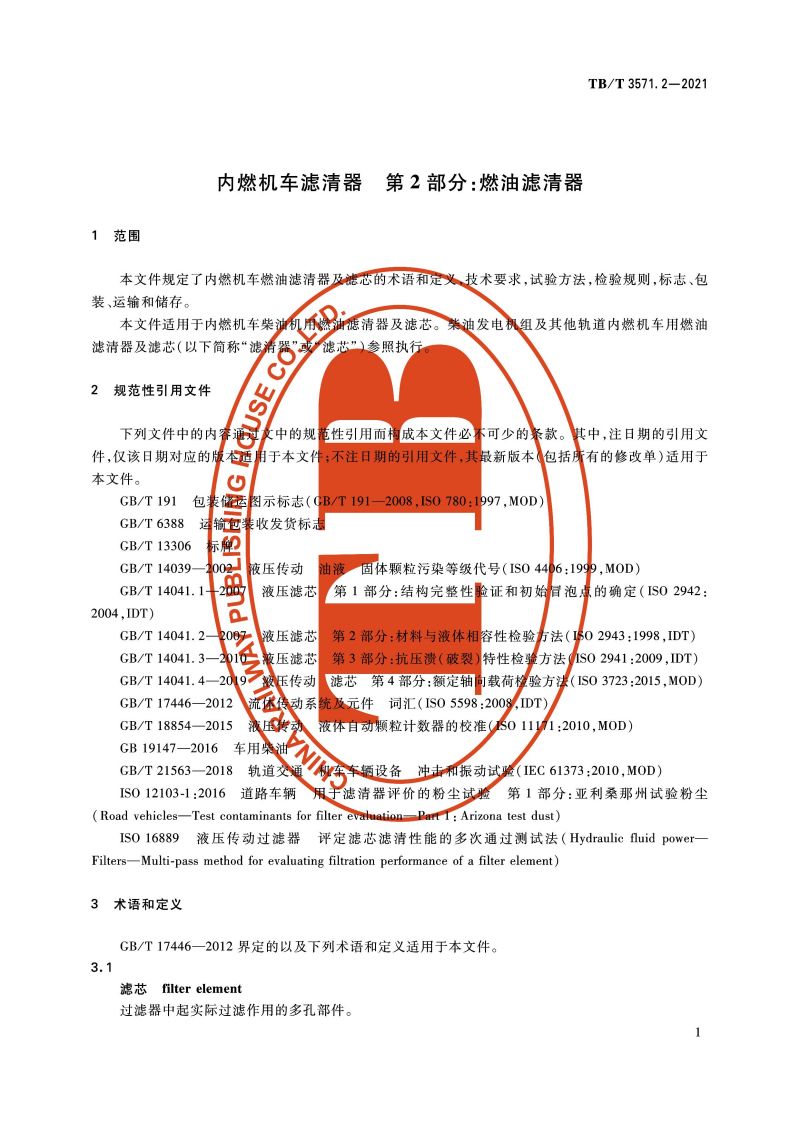 本标准为国家铁路局发布的铁道行业标准,技术标准2021年第6批(共5项标准),国铁科法2021 第43号,铁标名称:《内燃机车滤清器 第2部分:燃油滤清器》 TB/T 3571.2-2021,代替标准TB/T 1437-2013。本文件主要从内燃机车燃油滤清器及滤芯的术语和定义,技术要求,检验方法,检验规则,标志、包装、运输和储存等方面进行介绍。本文件适用于内燃机车柴油机用燃油滤清器及滤芯,柴油机发电机组用燃油滤清器及滤芯参照执行。
