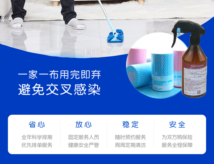 3、由于疫情严重,本次服务需自备清洁抹布,或选购本司提供的七色专业清洁布,分区打扫,避免细菌交叉感染。
