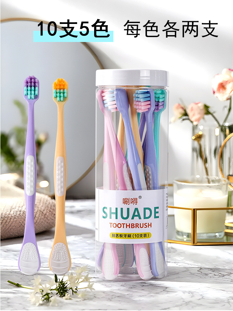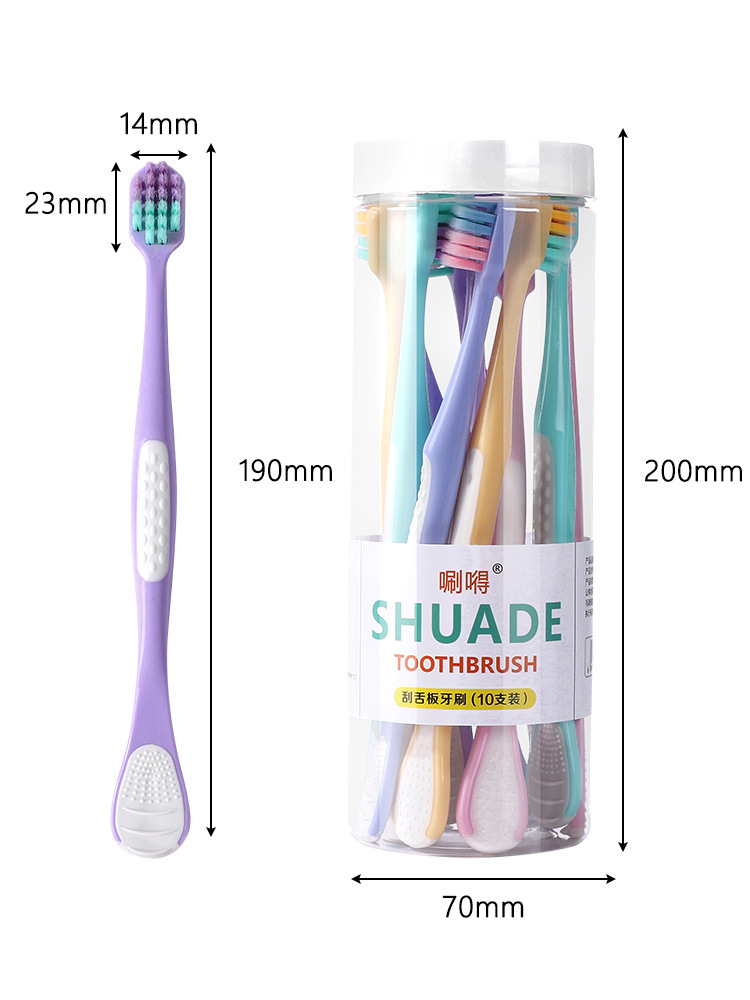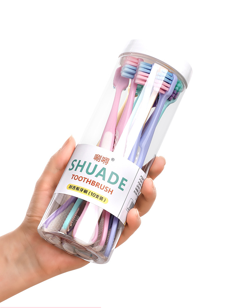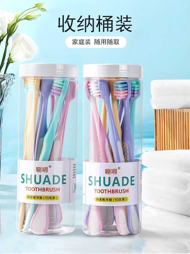 「10支桶装!自带舌苔板」桶装10支装舌苔板牙刷软毛宽头成人家用家庭装口腔护理舌苔清洁器 商品图0