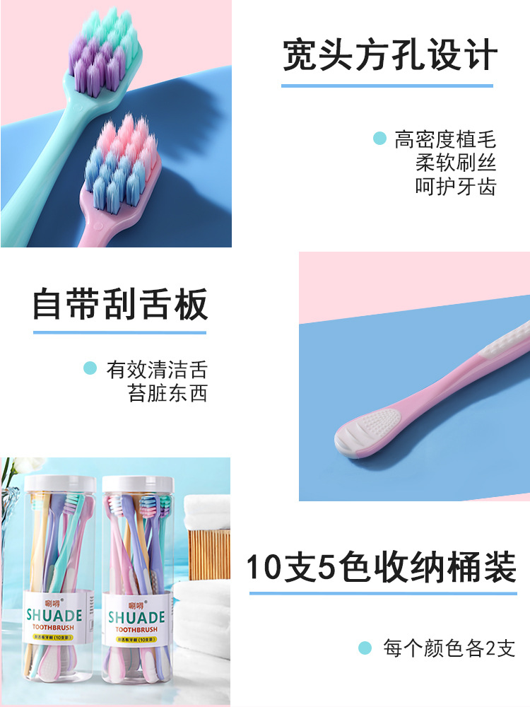 「10支桶装!自带舌苔板」桶装10支装舌苔板牙刷软毛宽头成人家用家庭装口腔护理舌苔清洁器 商品图2