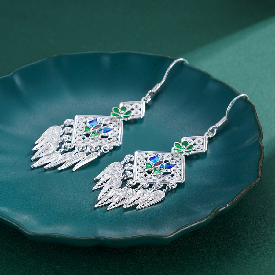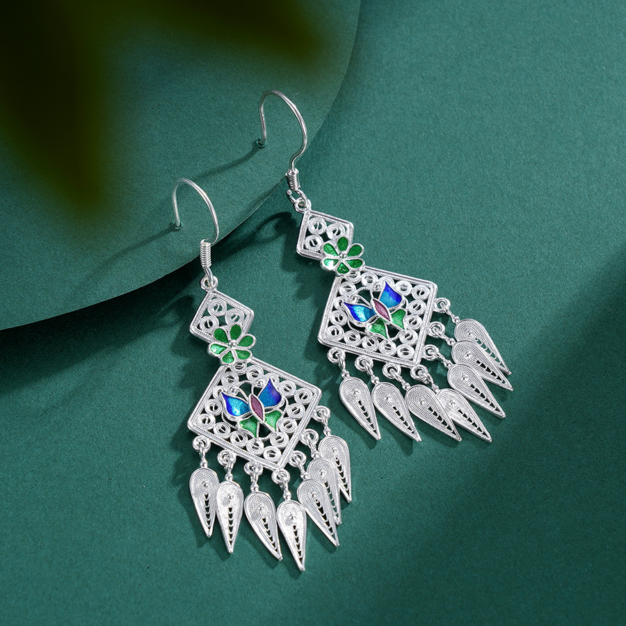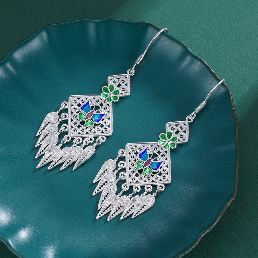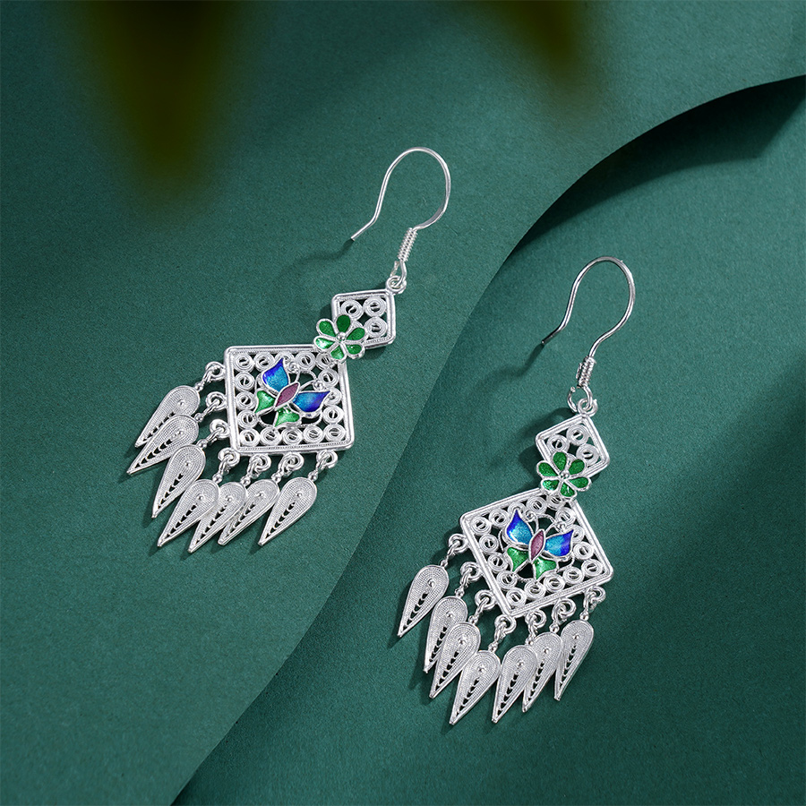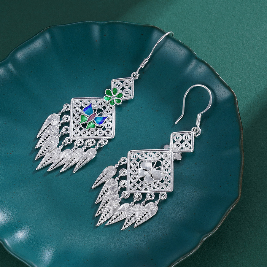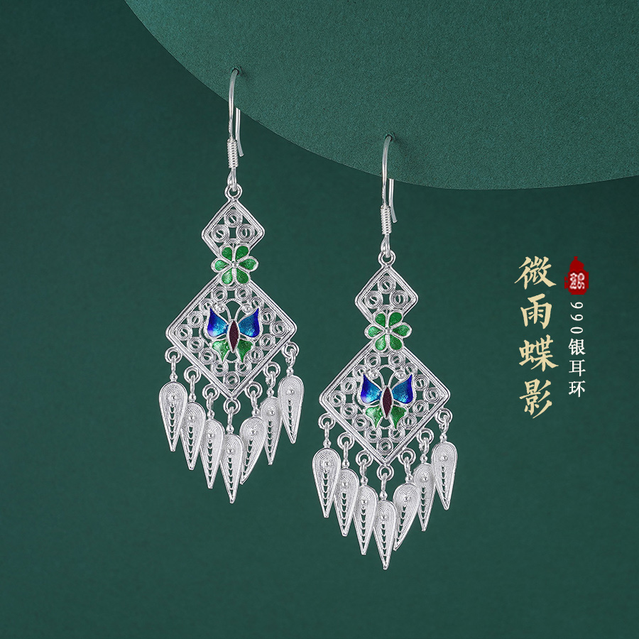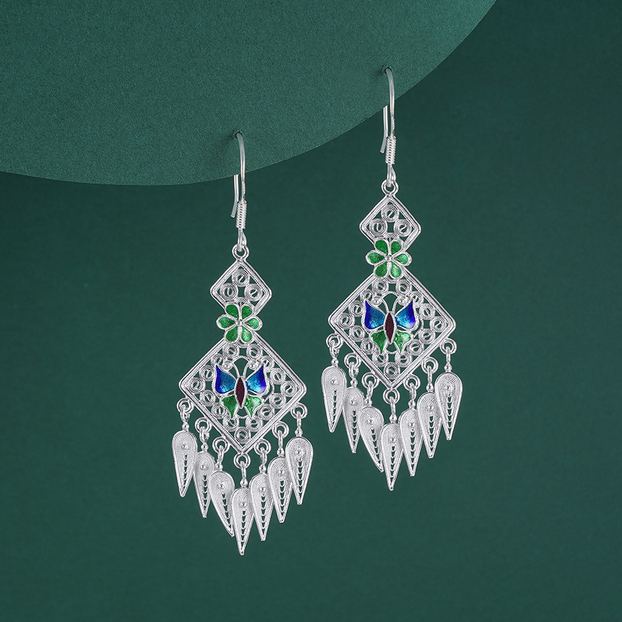 【寓意】:耳饰以蝴蝶为灵感设计,银花丝镂空编织,再搭配垂坠流苏,优雅明艳,轻灵细腻,寓意传递幸福与美好。